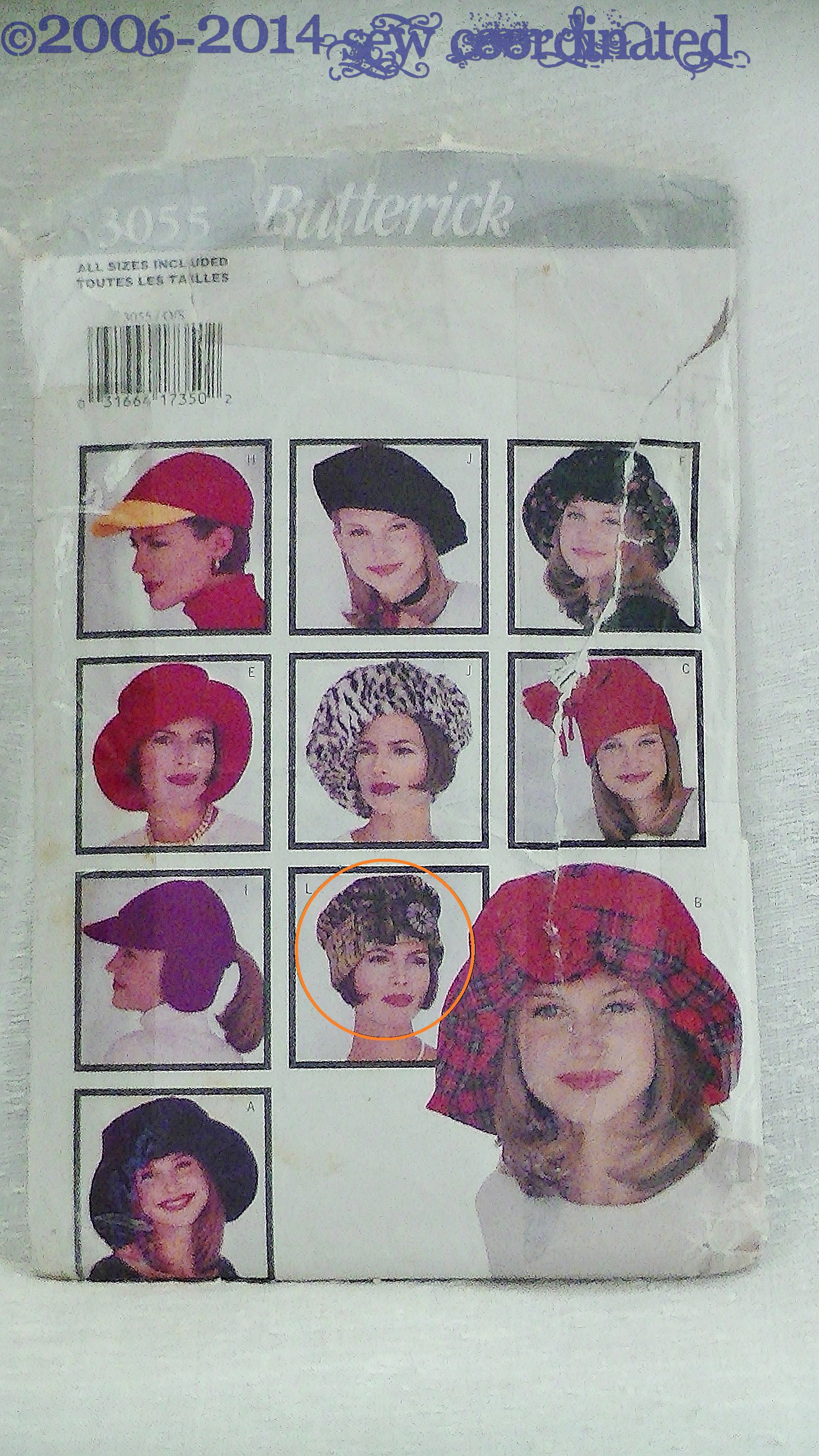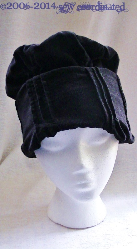 This is a velvet hat made from Butterick 3055, now out of print but still available online. I circled the view of the one I made (see pic 3 below). The first time I wore it outside, the clerk in 7-Eleven commented that it looked like an “evil chef hat”, which made me laugh. I told him I made it myself and he thought it was cool. I can’t wear it anymore the way it was intended because the velvet shrank after I washed it. Hence the reason why its on the styrofoam head. While styling the hat for the photos however, I’ve discovered that it fits me without the brim being cuffed (see pic 2), which is how I’ll be wearing it this fall and winter. I’m so glad about that because I hadn’t been able to wear it since then!