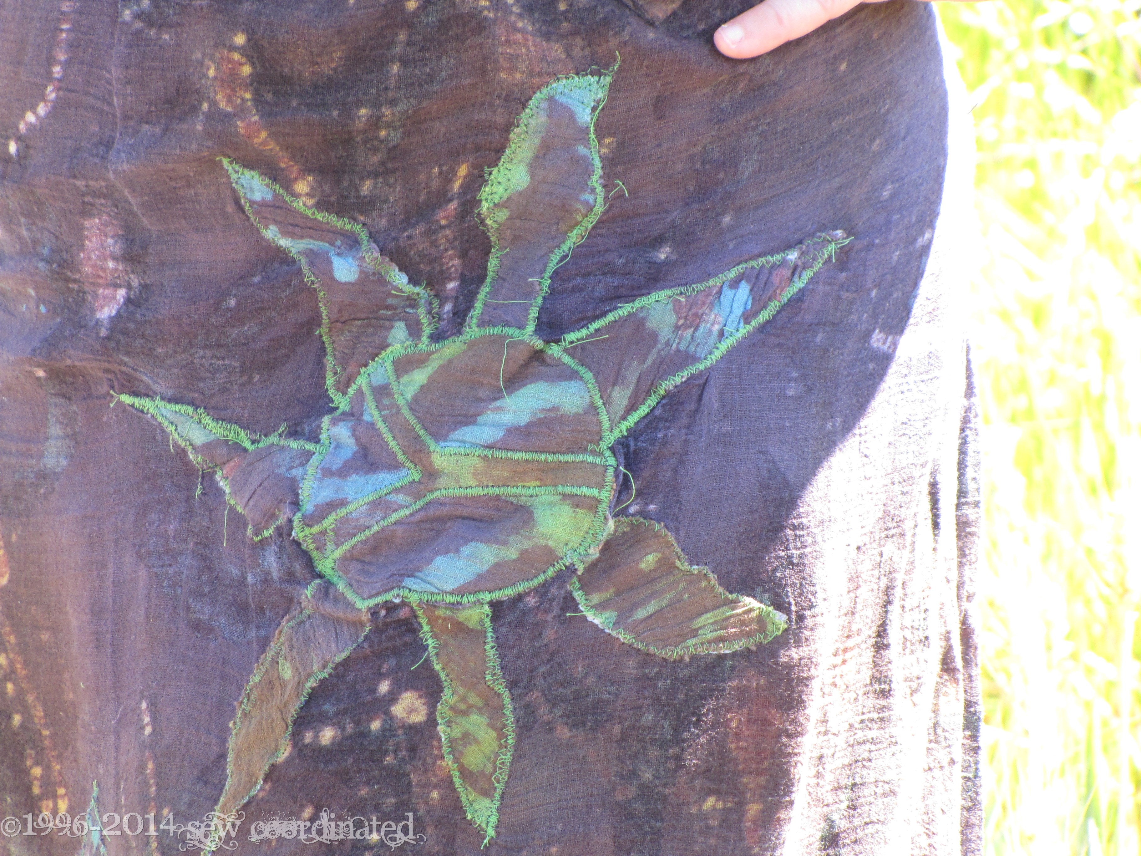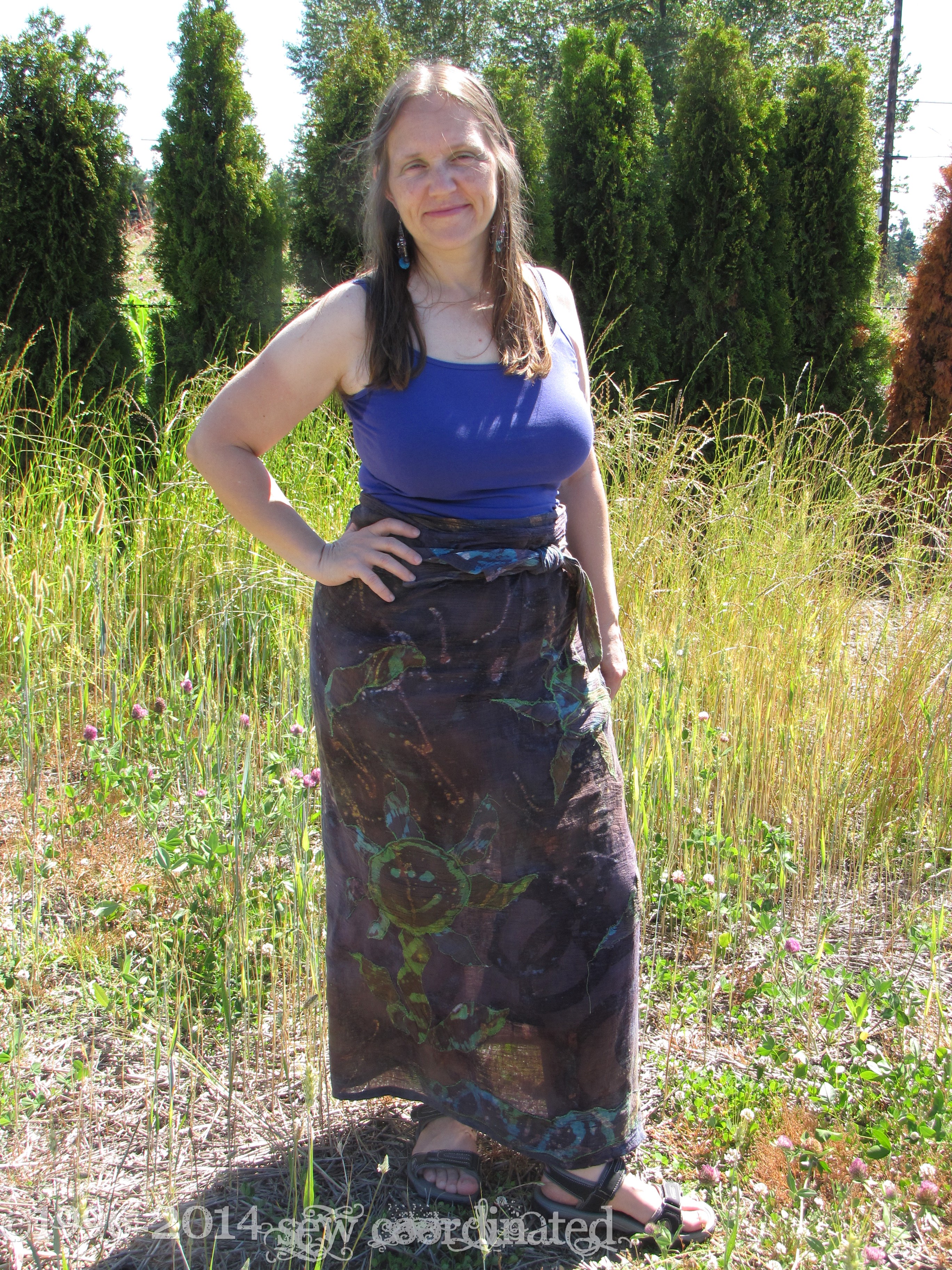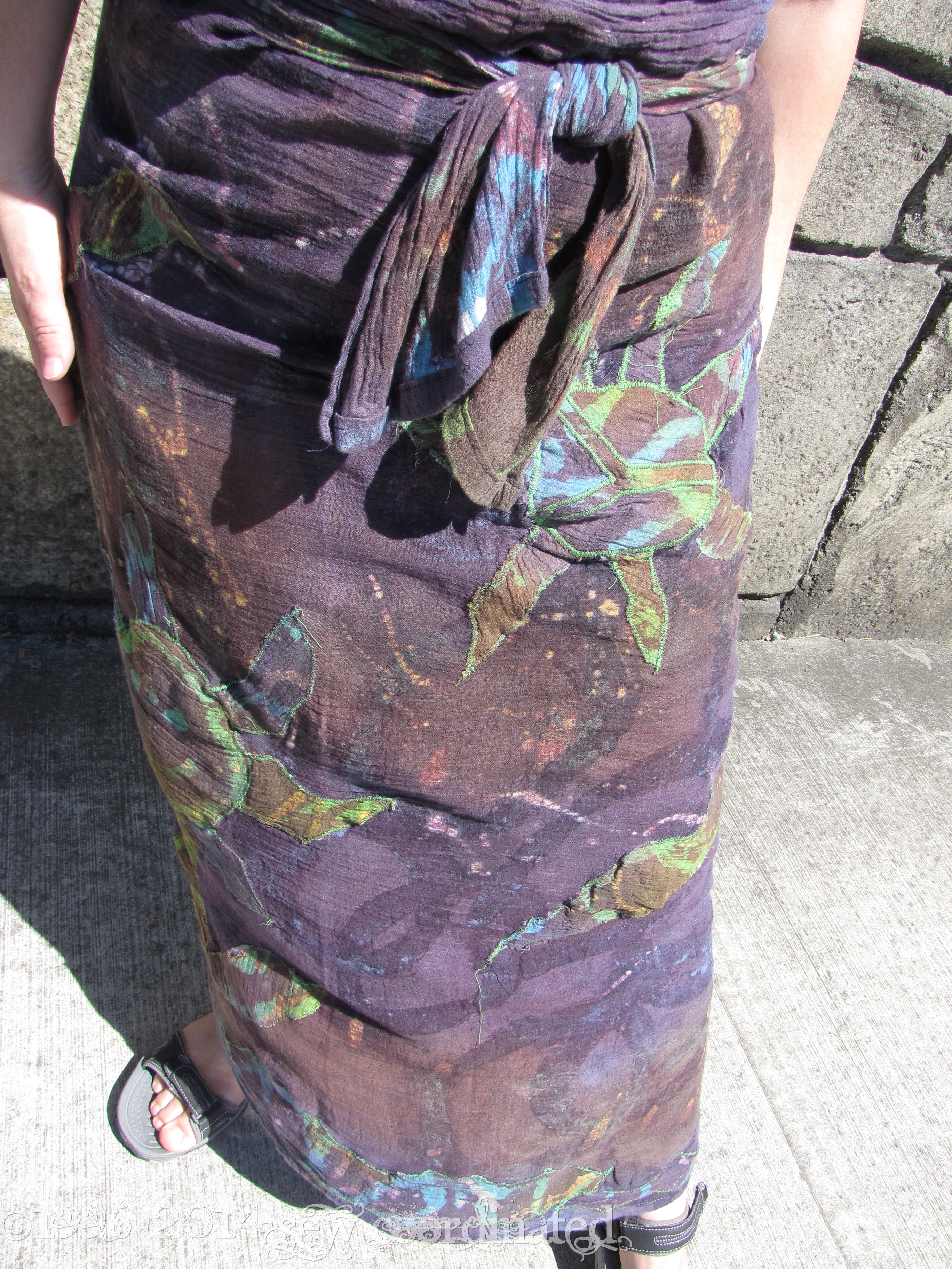 This self designed wrap skirt was made from leftover fabric of originally white gauze that I batiked by hand. I had bought several yards of the gauze, and I made 3 summer garments out of it: a men’s shirt, a child’s shirt, and a child’s jumpsuit. The dye process was partly experimental. I used 2 different resists when I drew the design: traditional wax, and rice paste. I was hoping to find a better alternative to wax, which is hard to remove from fabric, so I gave rice resist a try, reasoning that if it worked out, I’d be able to replace wax for all future projects. Unfortunately it didn’t work , it just didn’t penetrate the fabric enough to resist the dye, so I had a portion of leftover fabric that only dyed one color and didn’t receive the design. It is from that fabric that this skirt was made. I had some remaining remnants of correctly batiked fabric that I used as appliques on the skirt, and I made use of the plain background to showcase those.