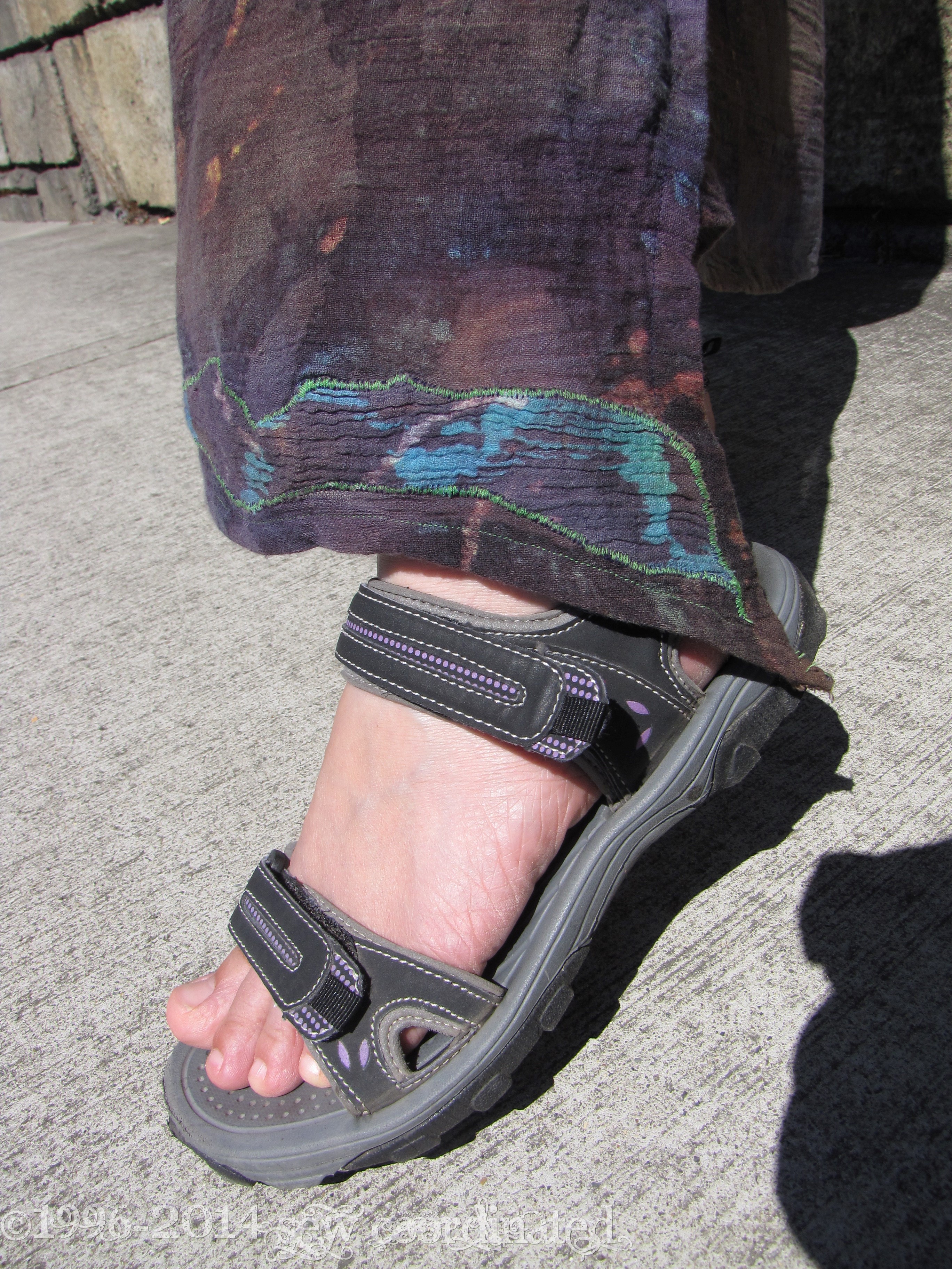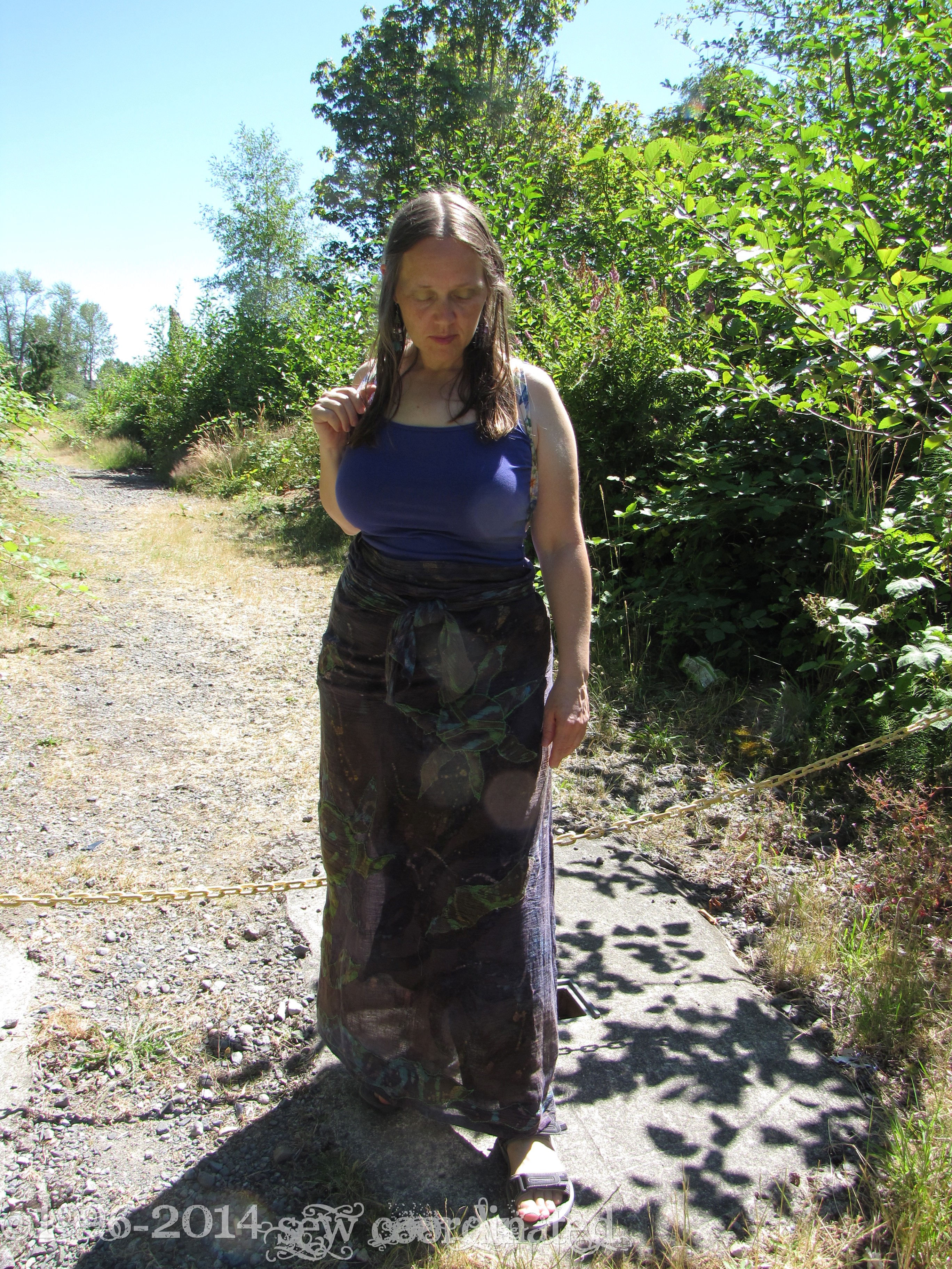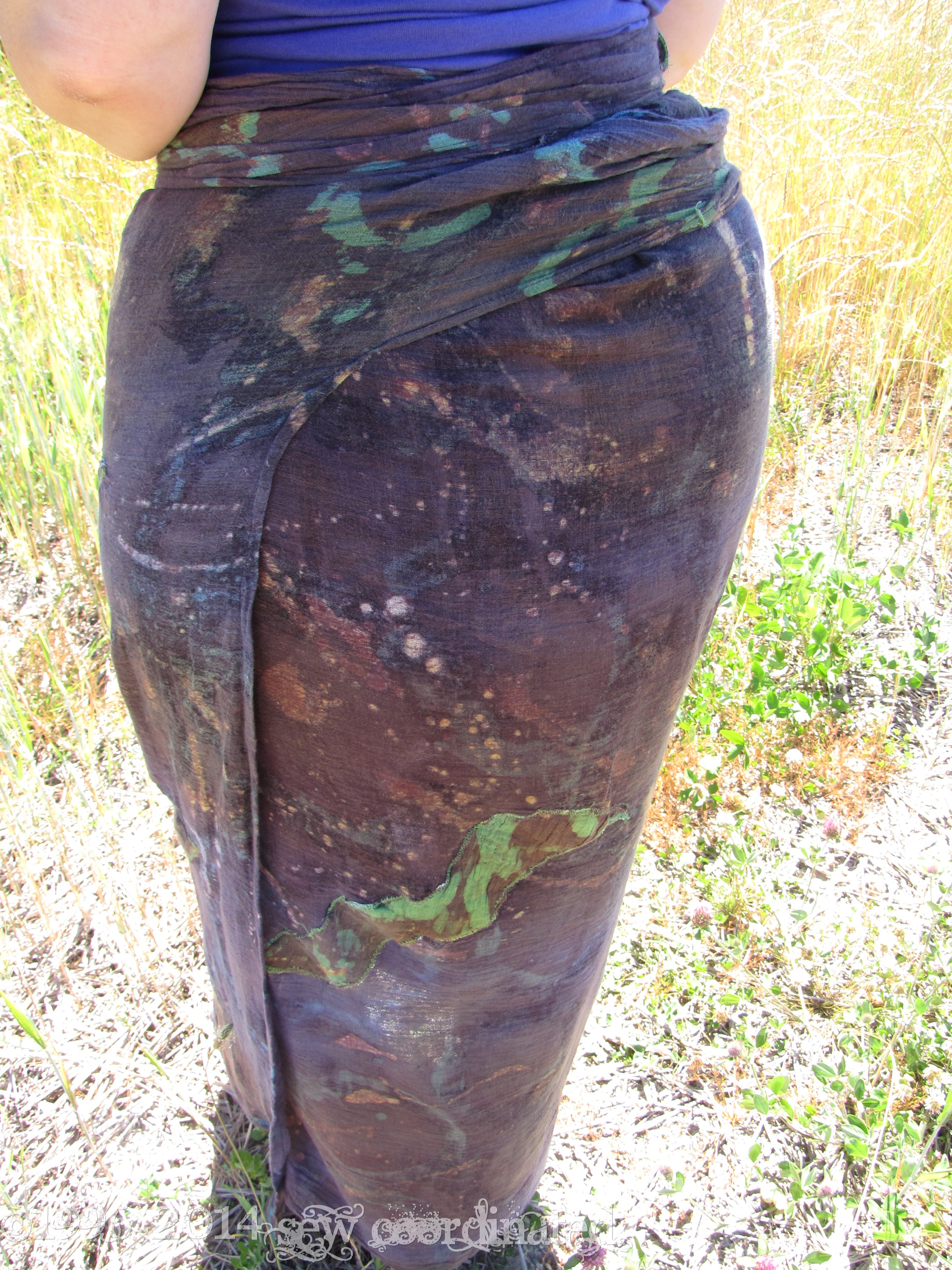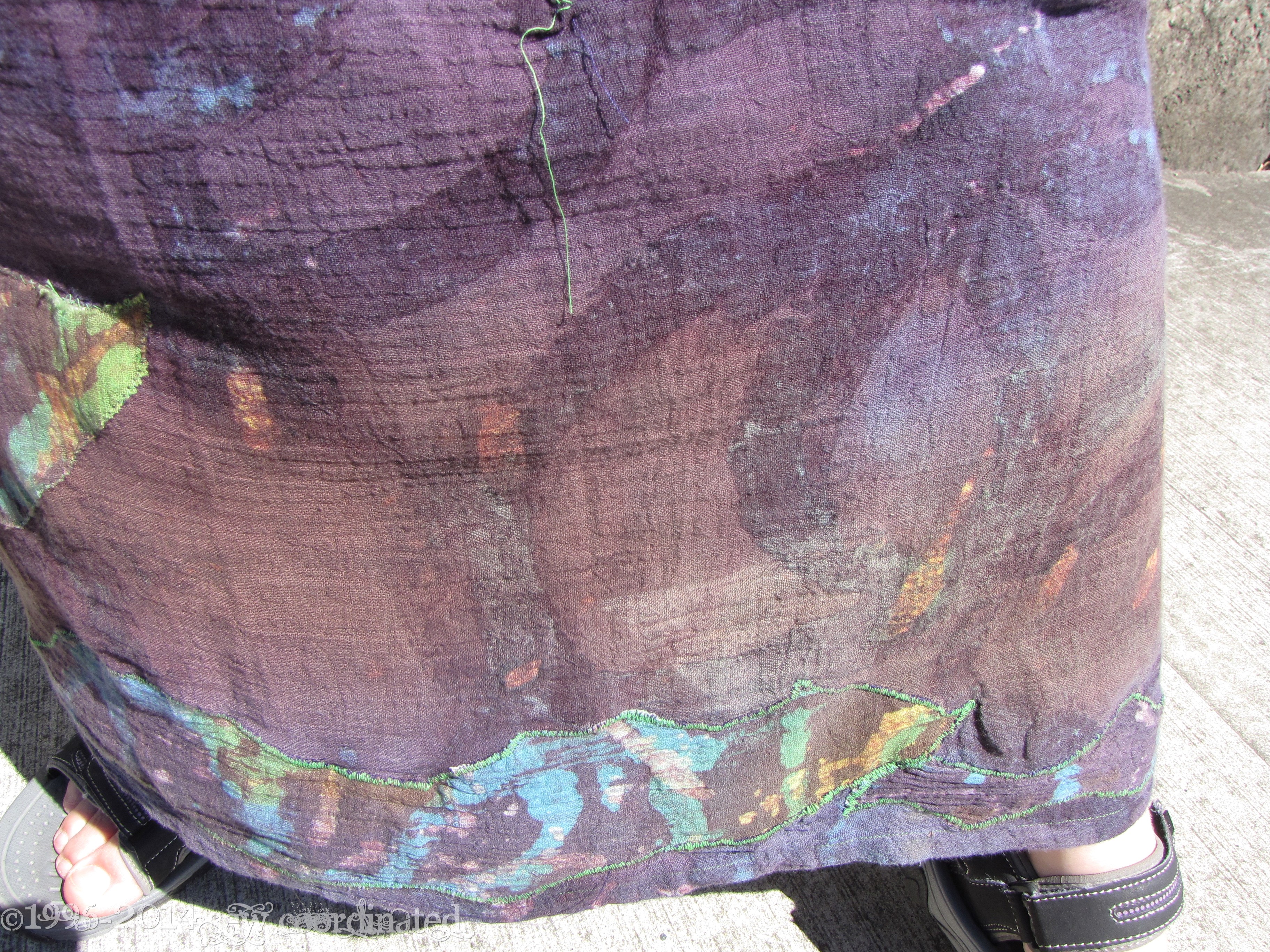 This self designed wrap skirt was made from leftover fabric of originally white gauze that I batiked by hand. I had bought several yards of the gauze, and I made 3 summer garments out of it: a men’s shirt, a child’s shirt, and a child’s jumpsuit. The dye process was partly experimental. I used 2 different resists when I drew the design: traditional wax, and rice paste. I was hoping to find a better alternative to wax, which is hard to remove from fabric, so I gave rice resist a try, reasoning that if it worked out, I’d be able to replace wax for all future projects. Unfortunately it didn’t work , it just didn’t penetrate the fabric enough to resist the dye, so I had a portion of leftover fabric that only dyed one color and didn’t receive the design. It is from that fabric that this skirt was made. I had some remaining remnants of correctly batiked fabric that I used as appliques on the skirt, and I made use of the plain background to showcase those.