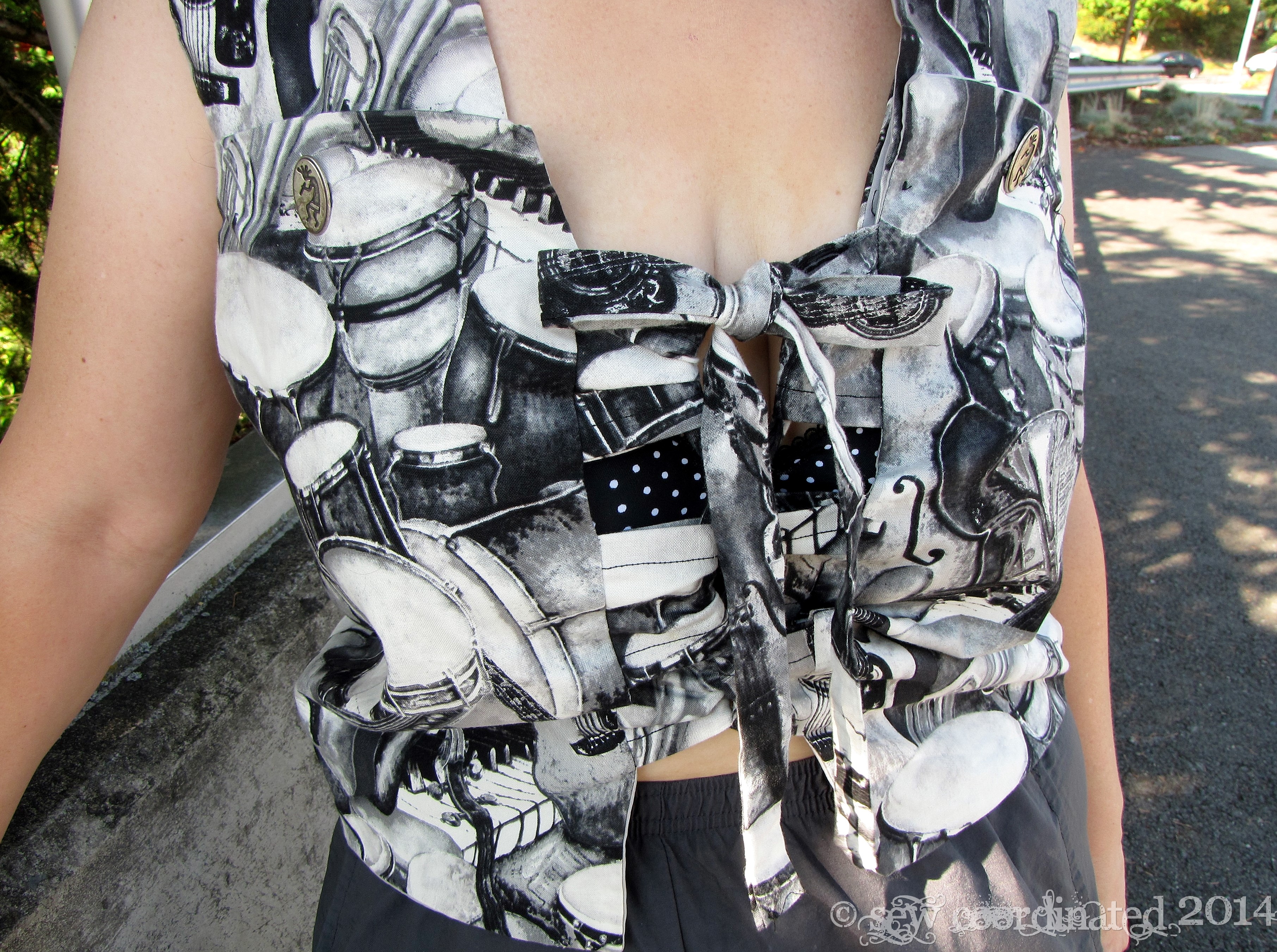 I whipped up this sleeveless top for the last days of summer. In doing so, I used up the last of the Robert Kaufman silkscreen print “Pleasures and Pastimes” by artist Janet Blumenthal. Its a self designed lace up the front shirt. If I had to categorize this design I’d call it a halter top. I added Kokopelli buttons, because he’s Mr. Music himself! I’ve worn it a couple of times already, and I’m hoping for a few more hot days so I can wear it some more!