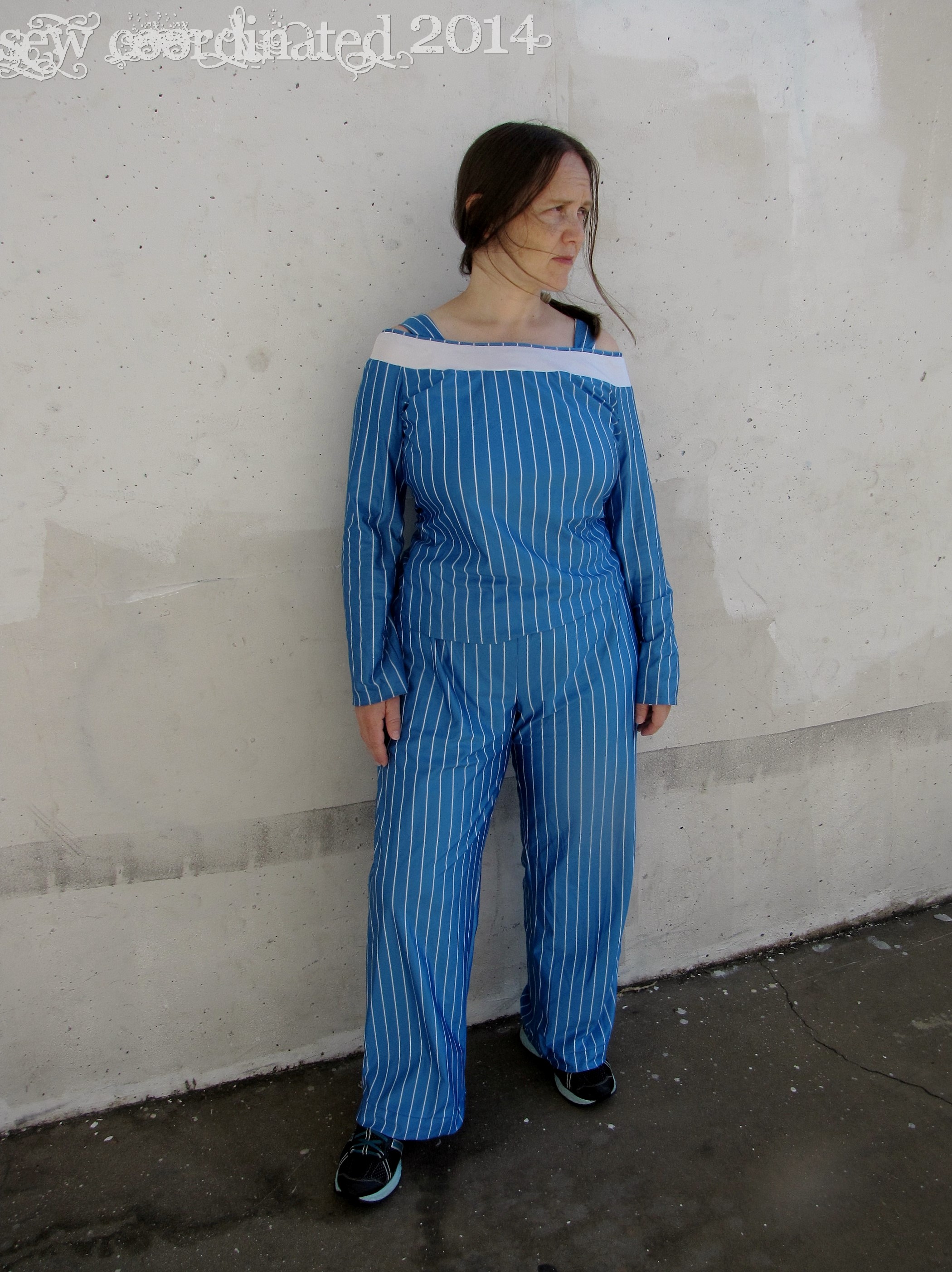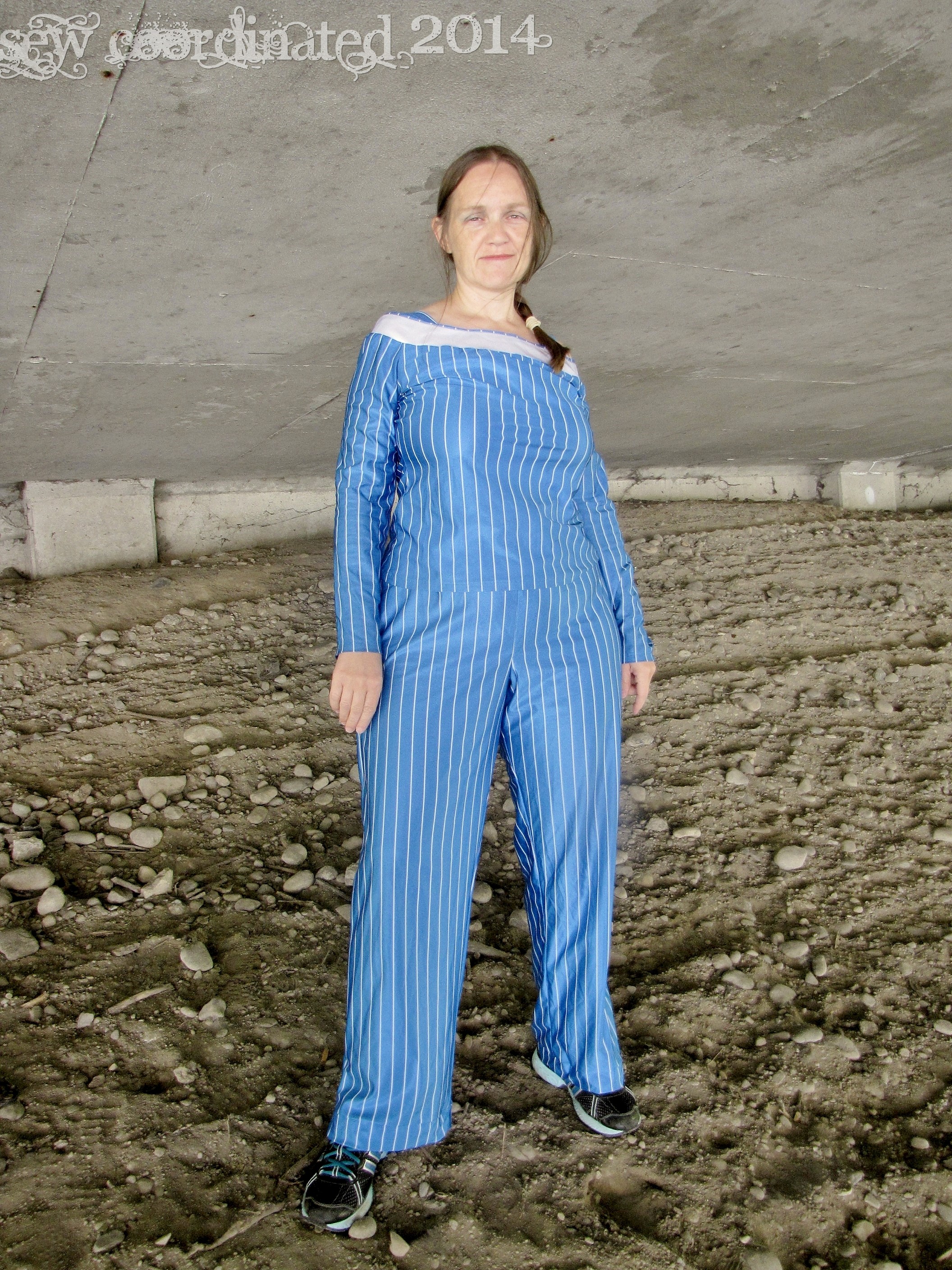 I had this fabric in my stash for a long time. Its from my Craiglist haul and its one of the better fabrics. Its some kind of nylon lycra knit, with a vertical pinstripe. Vertical stripes are rarer than horizontal, but they were very common in the collection of fabrics that I obtained a few years back. Most of the fabrics were/are definitely quite challenging, and have usually required a lot of thought in order to make them work. With that being said, I’ve been persistently working at using up the freebie stash and freeing up more work and storage space for the fabrics that I buy. I’ve actually freed up one storage tub (a real accomplishment), and in doing so, unearthed this fabric.