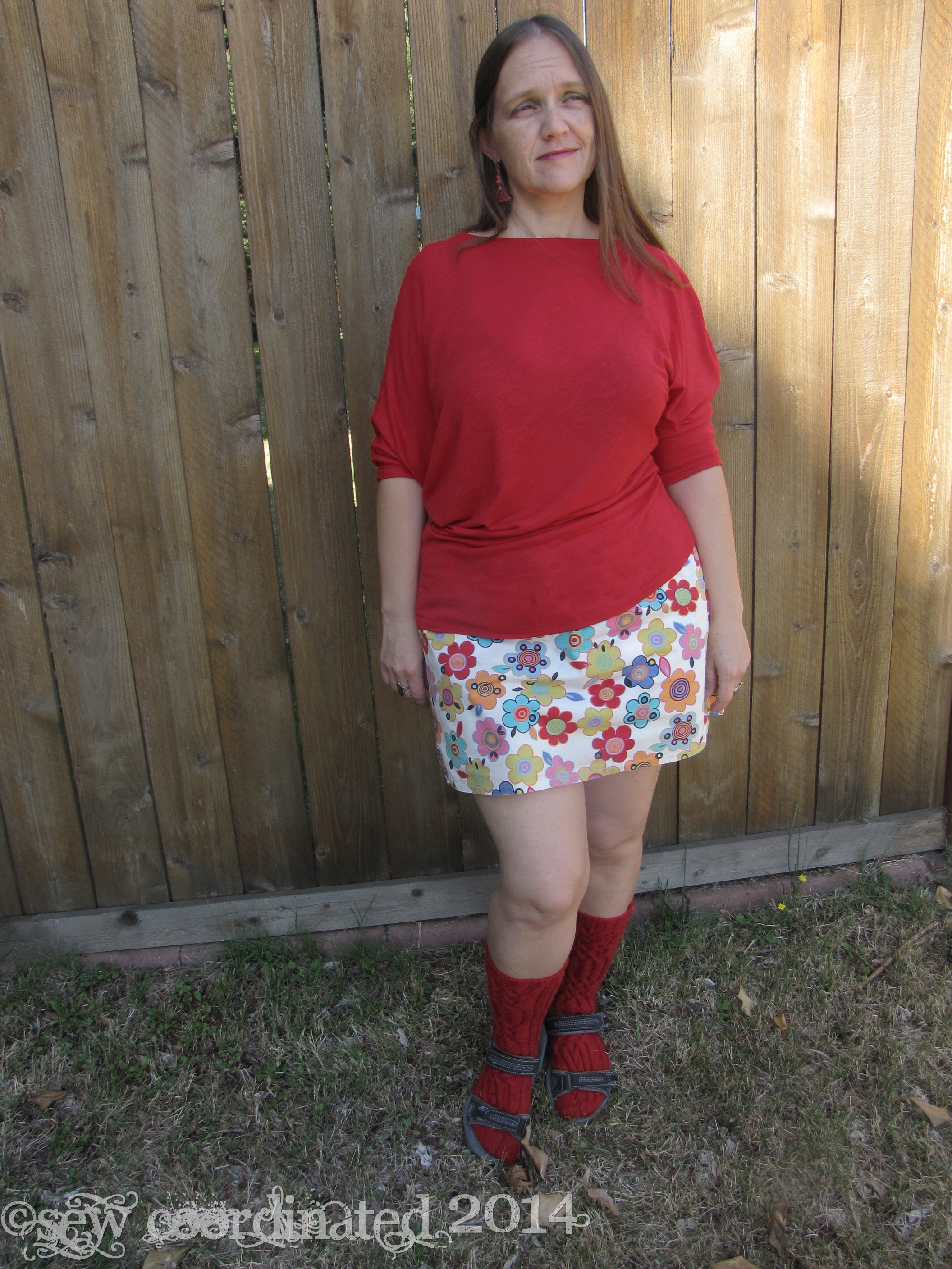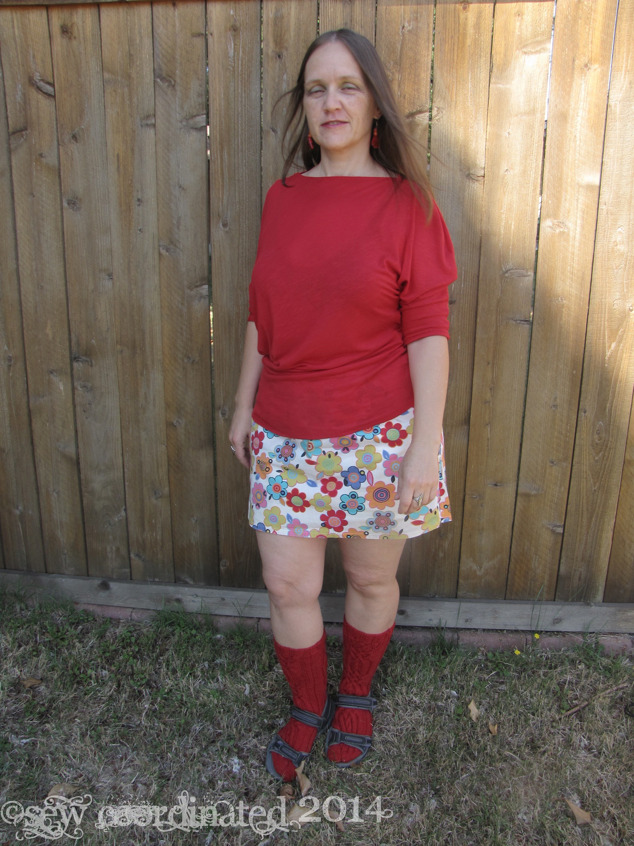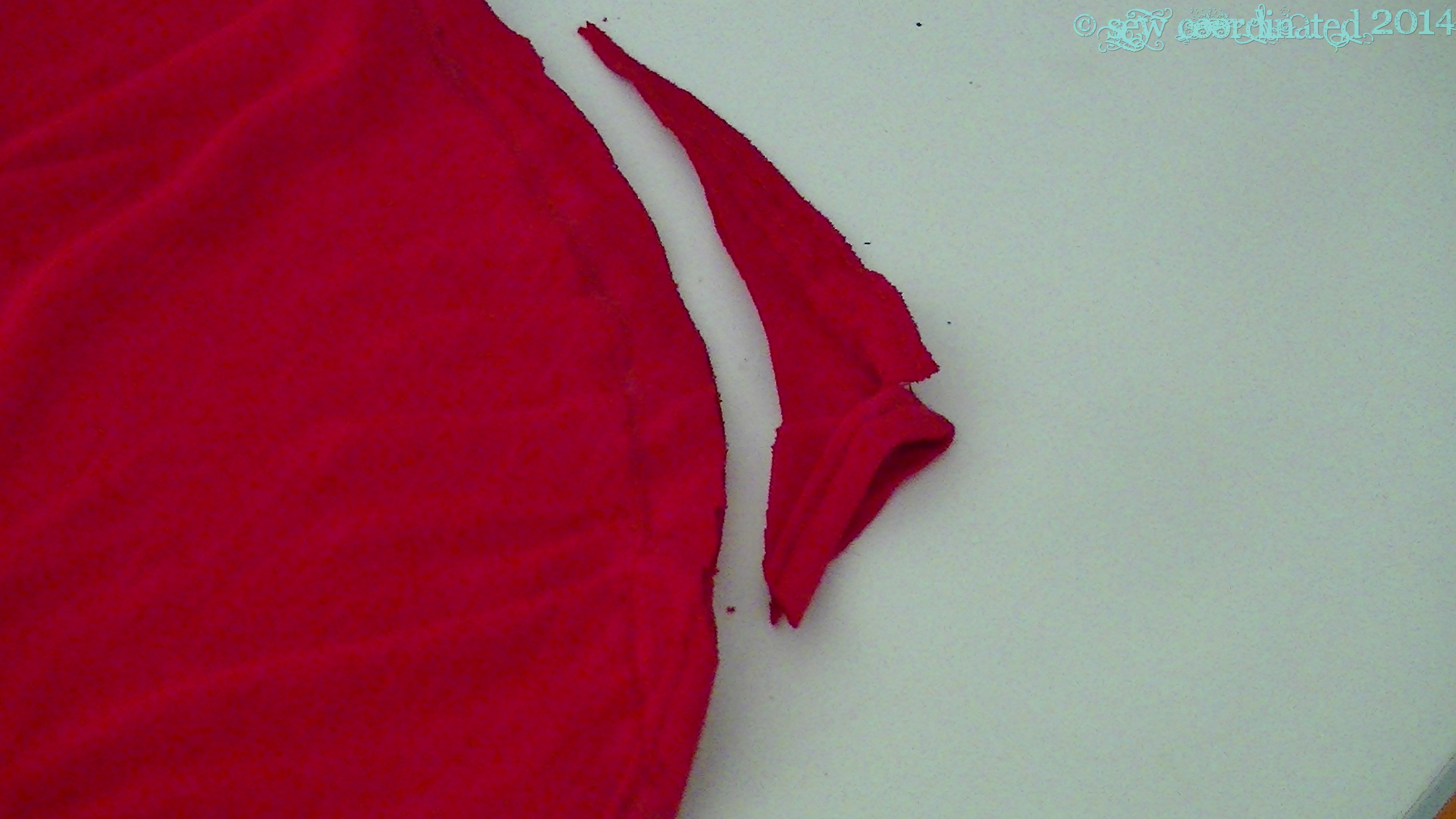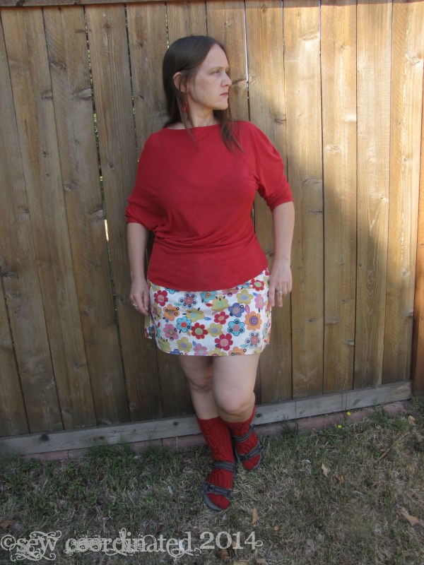 I’ve been sewing some three quarter sleeve tops in order to be prepared for the cooler weather. One of them is McCall’s 6400, which I bought about a month ago, and now just discovered is out of print. Got it just in time! It’s an easy to sew stretch knit shirt pattern. I made it out of very stretchy rayon knit, the kind of knit that’s very thin and floppy and has a lot of drape. As far as construction goes, it couldn’t be easier: a two piece batwing asymetrical design – just sew the front and back together, and you’re done. All that’s left are the hems. Simple, huh? Well yes, until the neckline turned out to be too large. I cut the shirt in a medium and when I tried it on before hemming it seemed ok. However, after it was hemmed it lost its “cling” that this kind of fabric has in its un-hemmed state, and became floppier, to the point of almost falling off my shoulders, which means bra straps were also showing. No good. I was disappointed and annoyed, but I was also determined to fix it!
