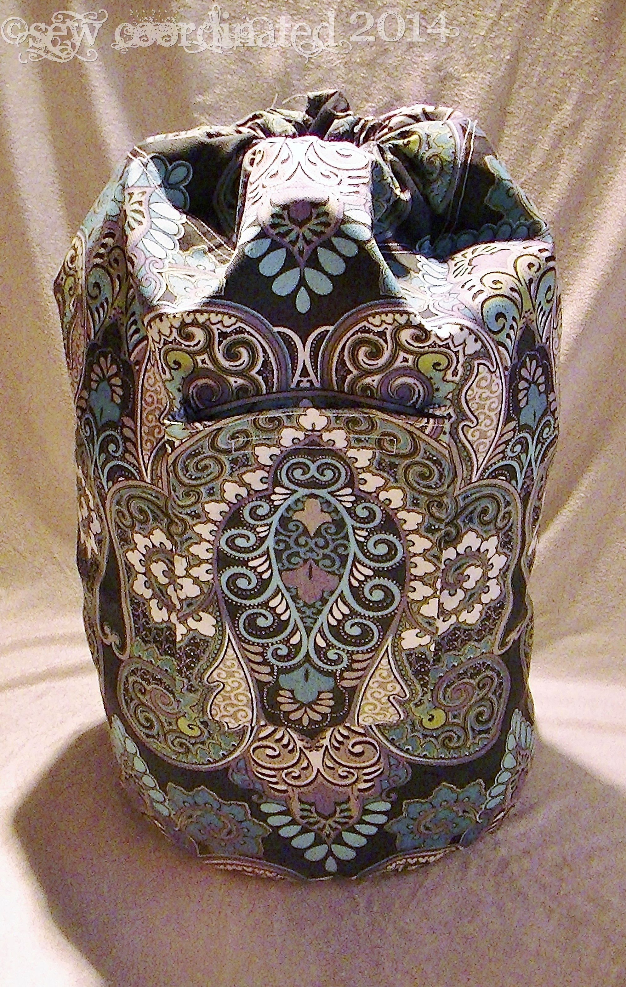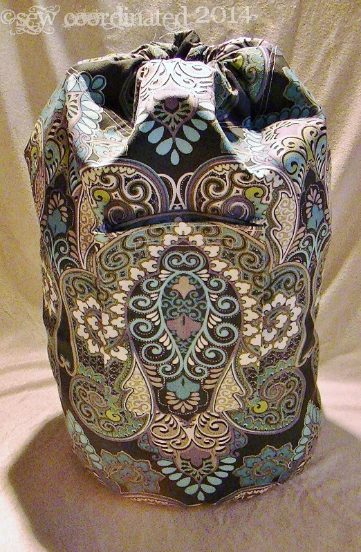 This is a self designed laundry bag. The fabric I used is Solarium by Richloom in the Kas Marapi Sterling print. It was on sale at Joann’s for 60% off of $20/yd. which I thought was a good deal. The bag is for my daughter, who recently left for college, and I wanted to make her life there comfortable.