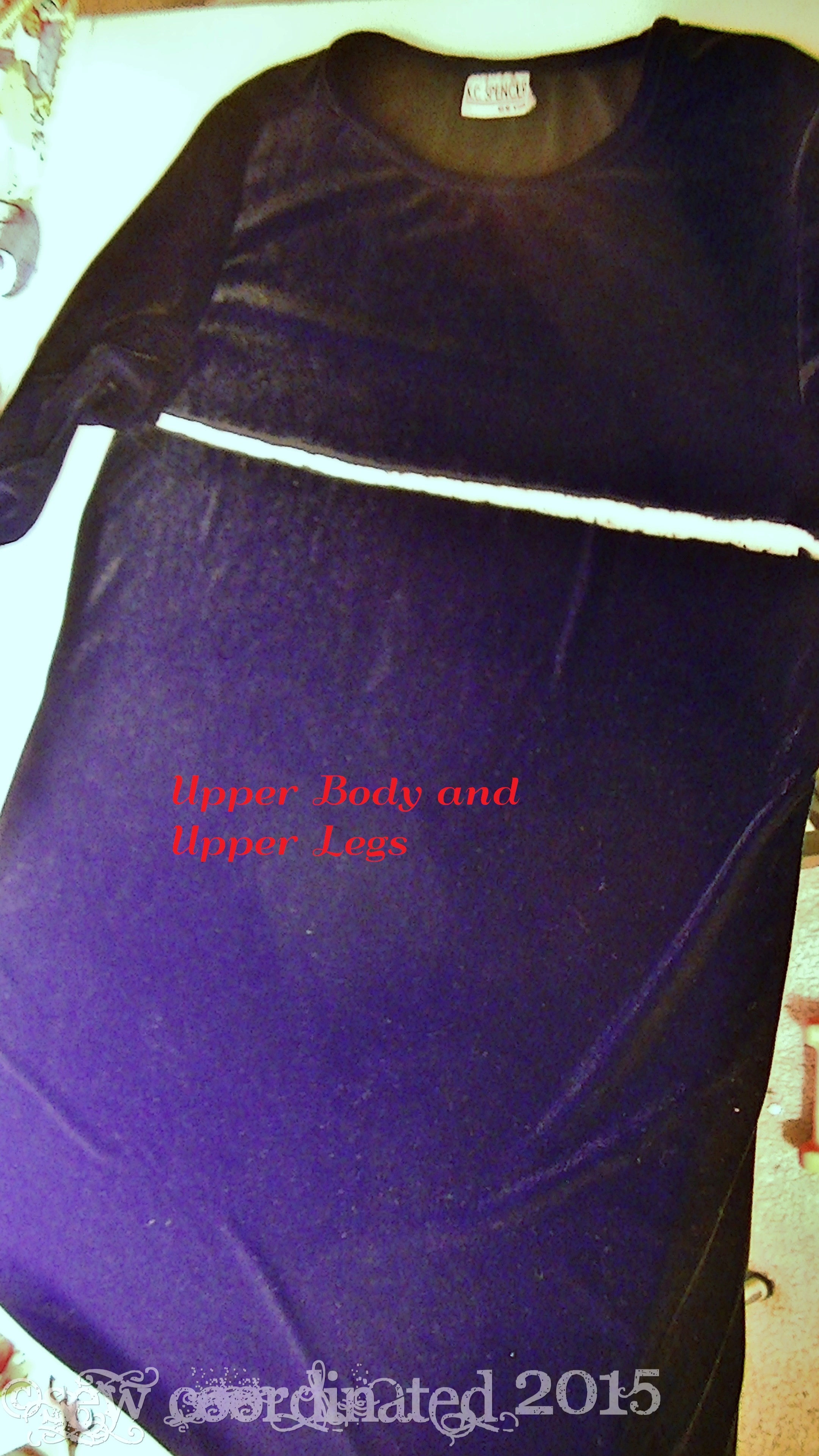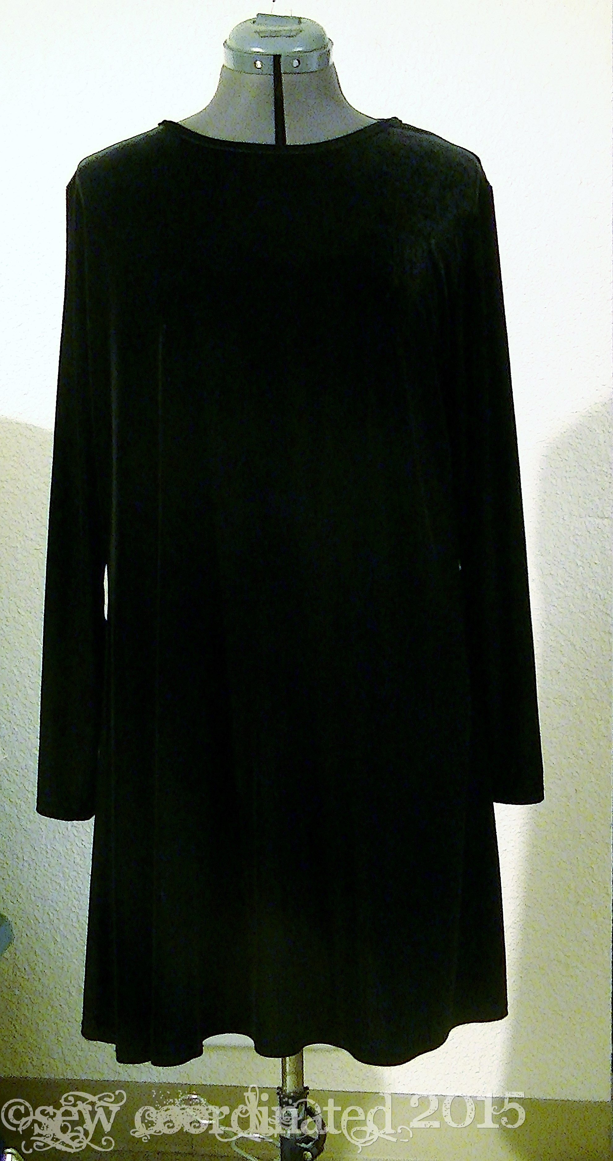 These were refashioned from a plain stretch velvet dress that was bought from Goodwill that was going to be re-donated. I pulled it from the donation bag and claimed it for myself, tossing it into my stretch knits pile, knowing that basic black would come in handy at some point. I’m glad I saved it, because I needed matching pants to wear with my newly refashioned shirt, and what better idea than a pair of refashioned pants? I originally thought of making a skirt, but the truth is that I wear pants more often than skirts, and I wanted a useful go-to garment for everyday wear, so pants it was. Here’s a pic of the dress before the refashion: