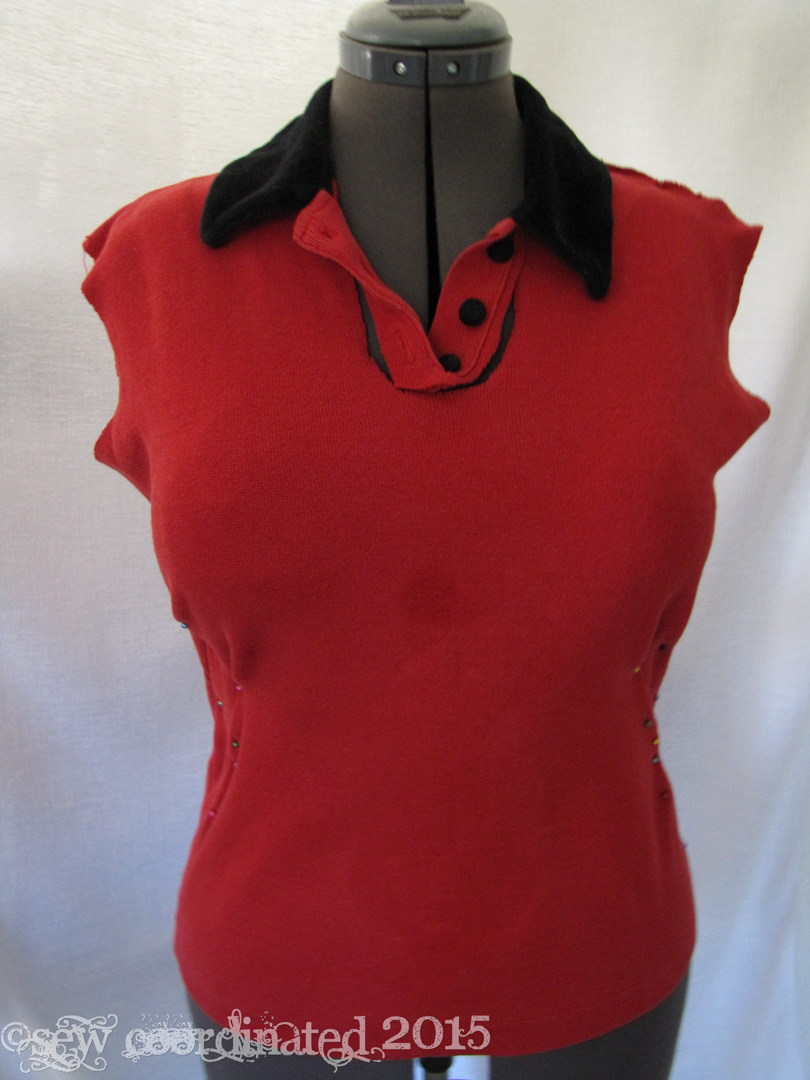 At first I wasn’t sure how to refashion these two pieces into one new garment. I thought about it for awhile and then it hit me: I had to get rid of the oil stain on the one shirt, so why not take the button placket from the velvet shirt and turn the red pullover shirt into a button up? It was a good idea that I managed to make work, but not without considerable effort. I realized that I couldn’t just take the front placket, I also had to take the collar too, since that was attached to the placket. As I mentioned earlier, this fabric is hard to work with, and getting a straight seam like the kind needed to show a straight transition line from the knit shirt to the newly placed placket wasn’t easy. I haven’t even discussed the attachment of the collar. It was difficult! It kept me busy for ages awhile.