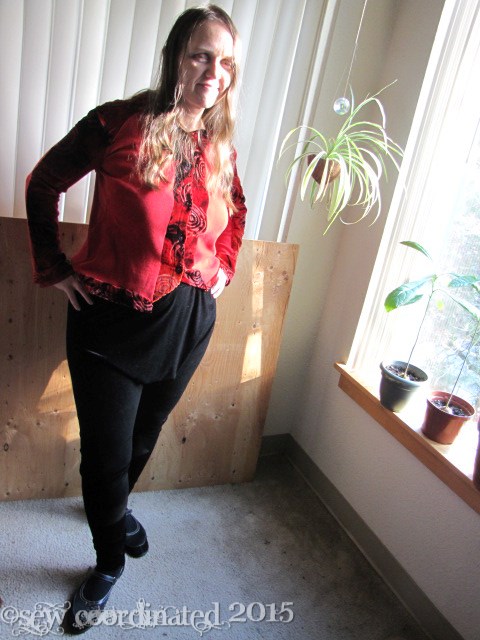 The story of this outfit began when I realized that my red sweater/shirt had seen better days. I didn’t want to throw it out because I still liked it, so I decided to re-fashion it with another shirt I had. That other shirt was made entirely out of burnout velvet, a velvet fabric that’s had a design etched out of the pile by use of a caustic chemical. The technique used to create this kind of fabric is called Devore. Both shirts were bought second hand from Goodwill. I’d had the velvet shirt for ages, I picked it up on a whim for the unusual fabric, which I’d liked but had never found anything to do with. I thought it was time to find a use for it already (being in a stashbusting mood at the time). You might be surprised to find out that it’s a completely woven fabric, and has no stretch whatsoever, however it looks as though it does! Therefore, the shirt refashion is one of a melding of stretch and woven, and for that reason, I really struggled with it. I now see why burnout velvet is only made into simple boxy garments or cut into rectangles for things like scarves.