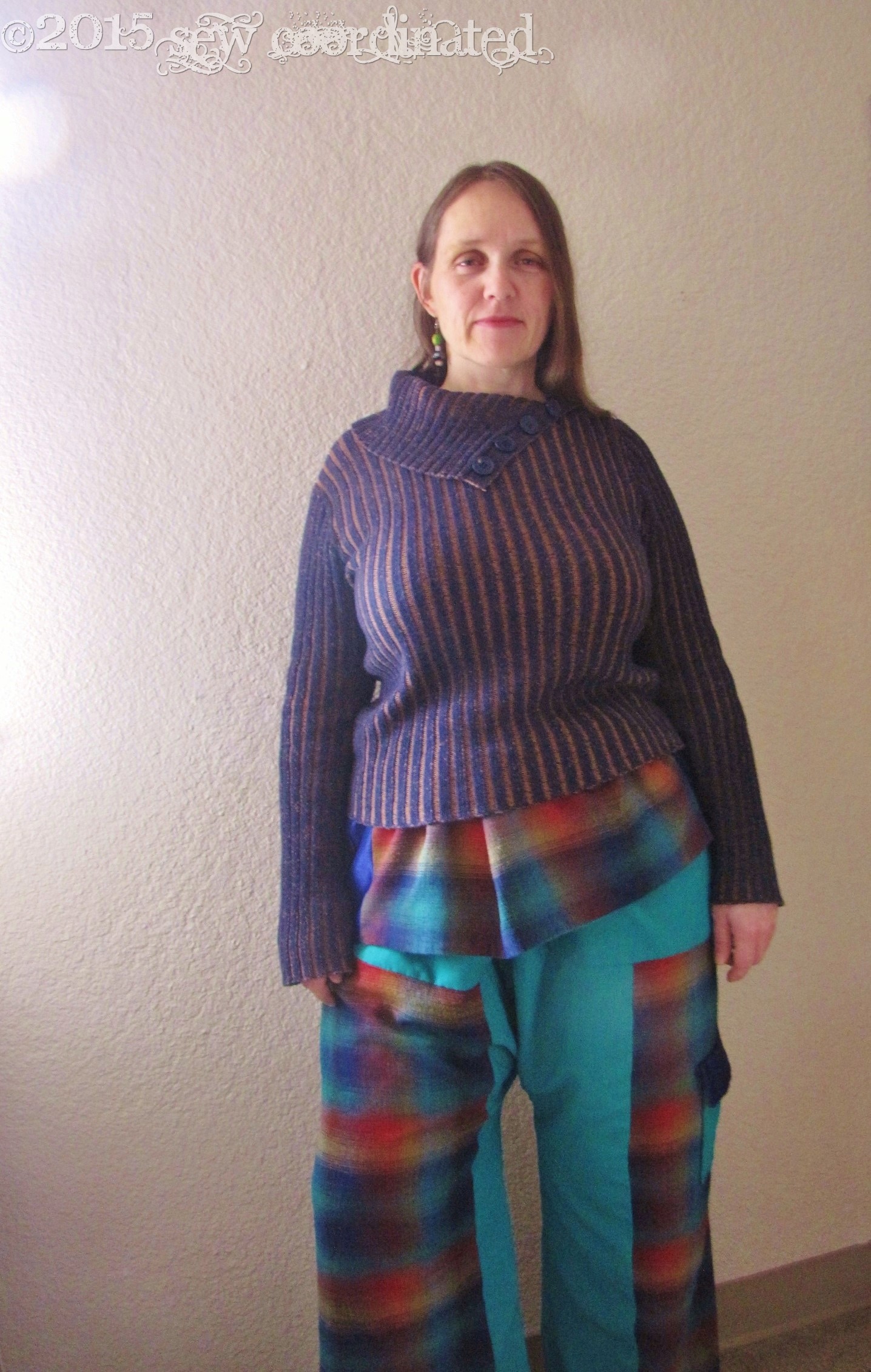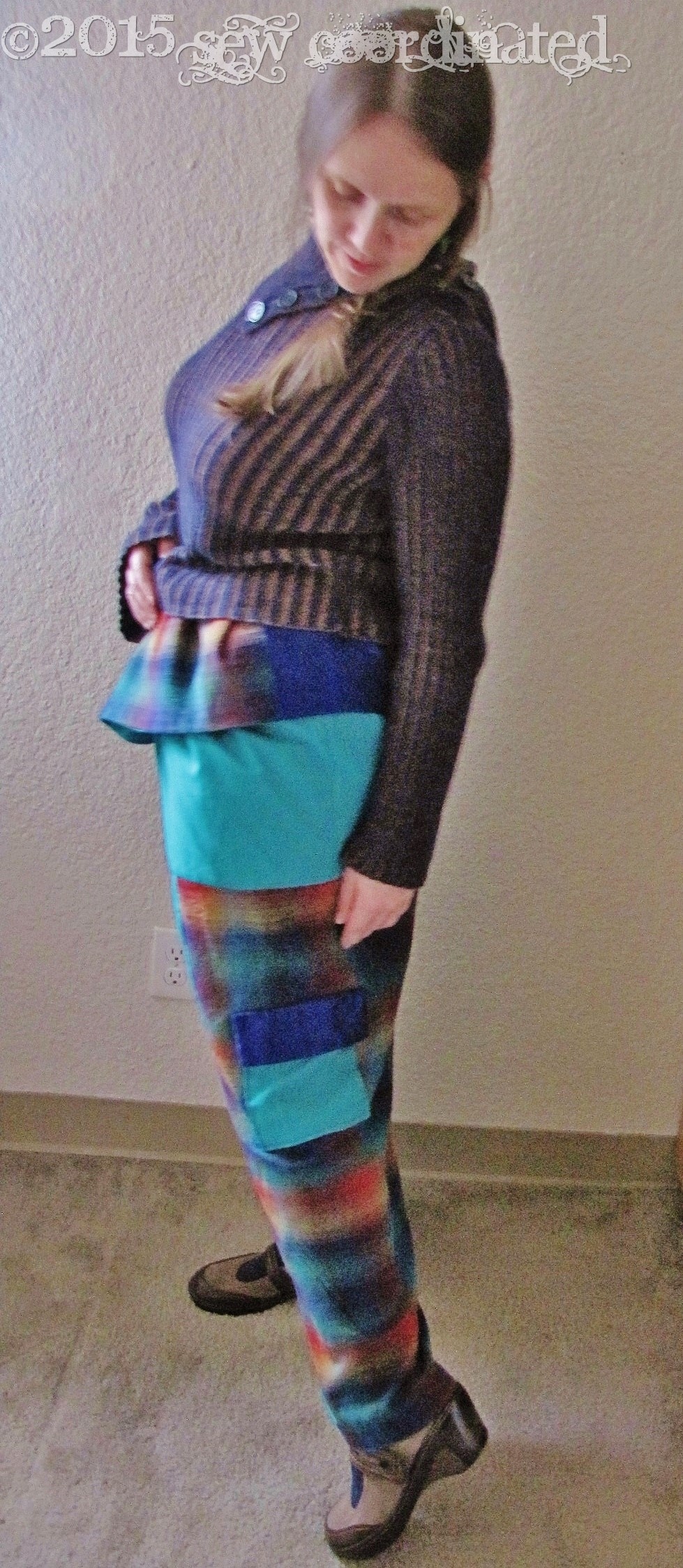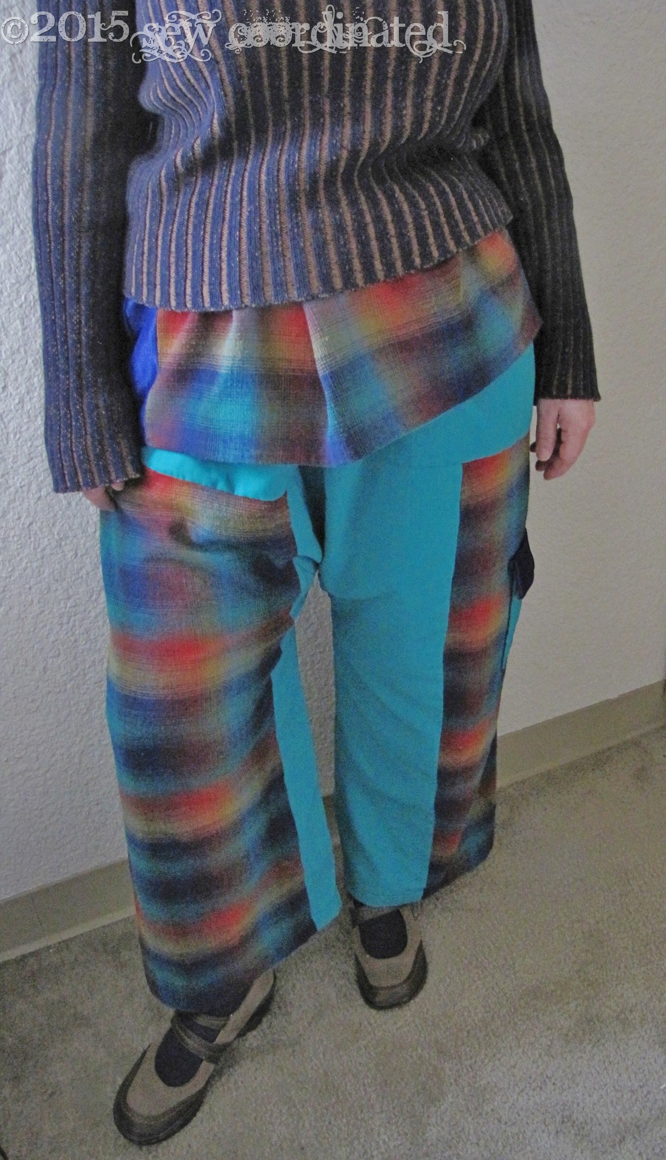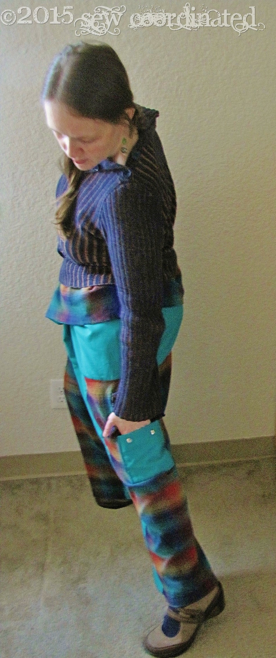 I used remnants of flannel and green and shiny blue polyester that I had from my Craigslist haul. I lined the pants with other flannel remnants from pajama makings past. The lining makes them warm enough for walking outdoors during the winter to spring transition, and good for wearing in autumn and indoors throughout the winter. I added a flap with snaps to the pocket, so that it’ll be more secure and actually hold something more than say, a tissue, without having it fall out. Another alteration I made was that I doubled the height of the waistband, in order to compensate for my large hips.