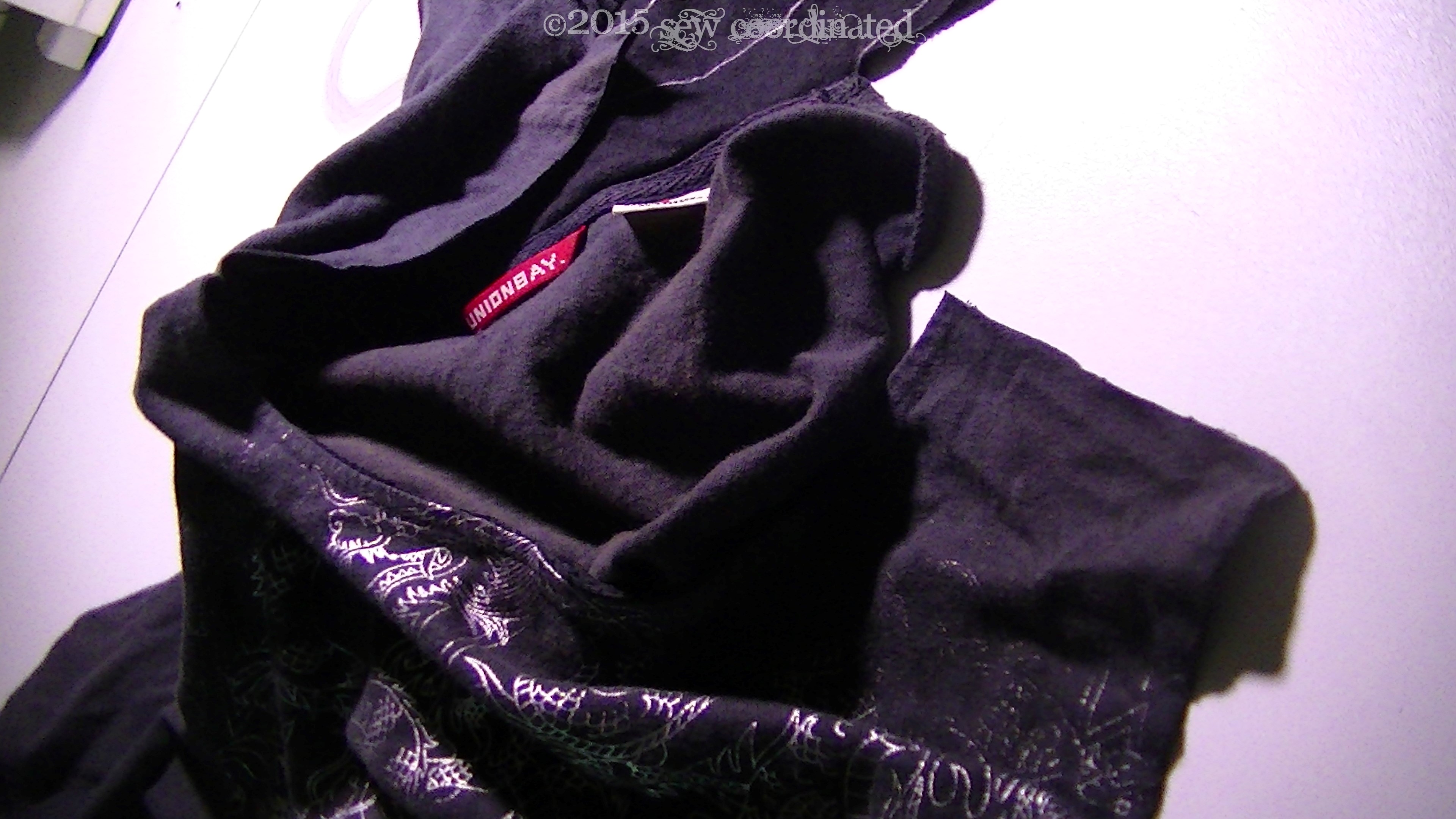 I wanted to preserve the panel as best as possible,  and I felt that it needed some shoring up so I picked up some Easy Knit interfacing by Pellon  and fused that to the back of the panel.  I then used the fabric from the back of the hoodie to overlay onto the facing, as I was concerned about wear and tear on the interfacing and thought it should be backed by something.  What better idea than to upcycle the remaining fabric of the hoodie? It was the same size anyway,  so why not?