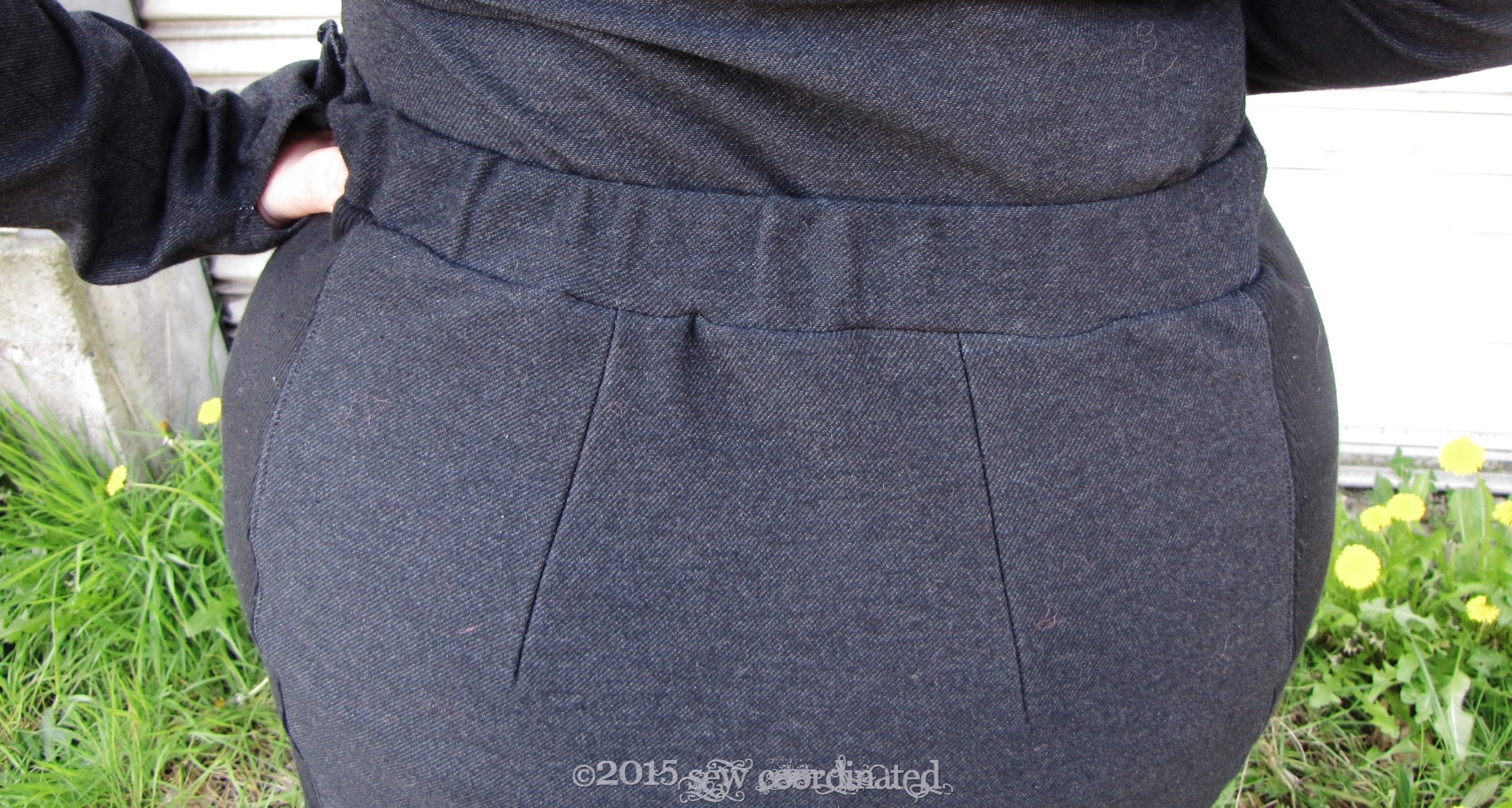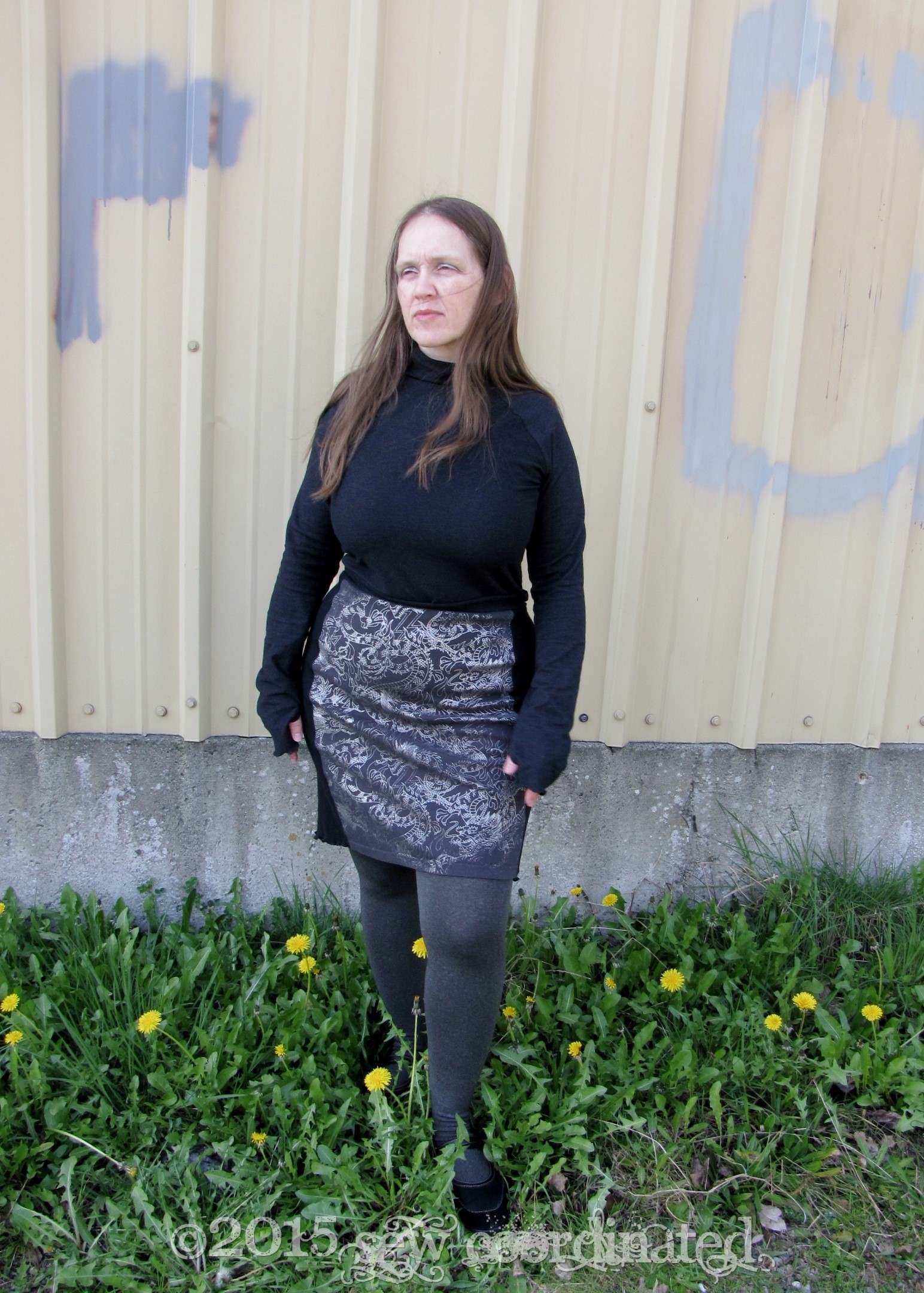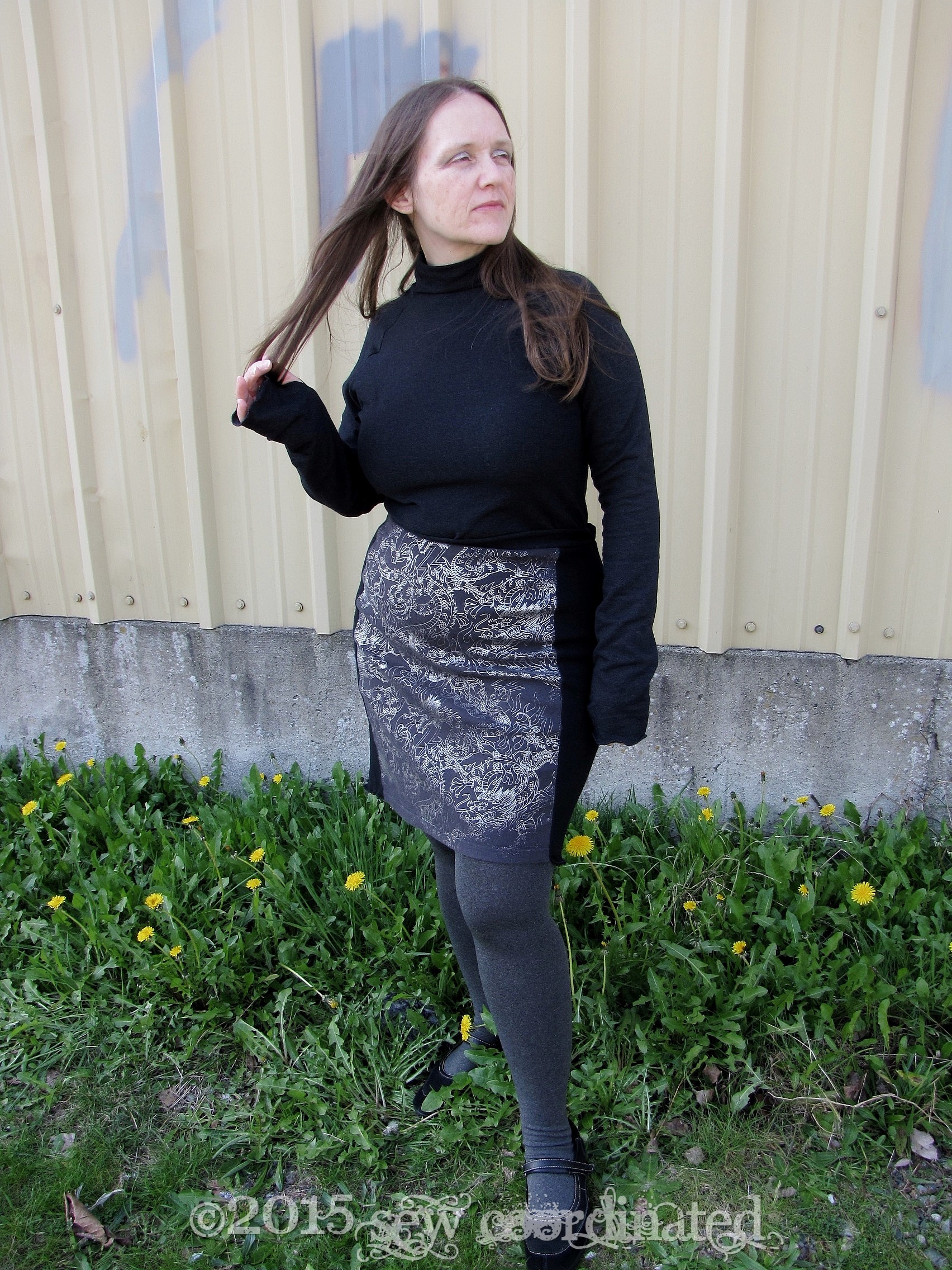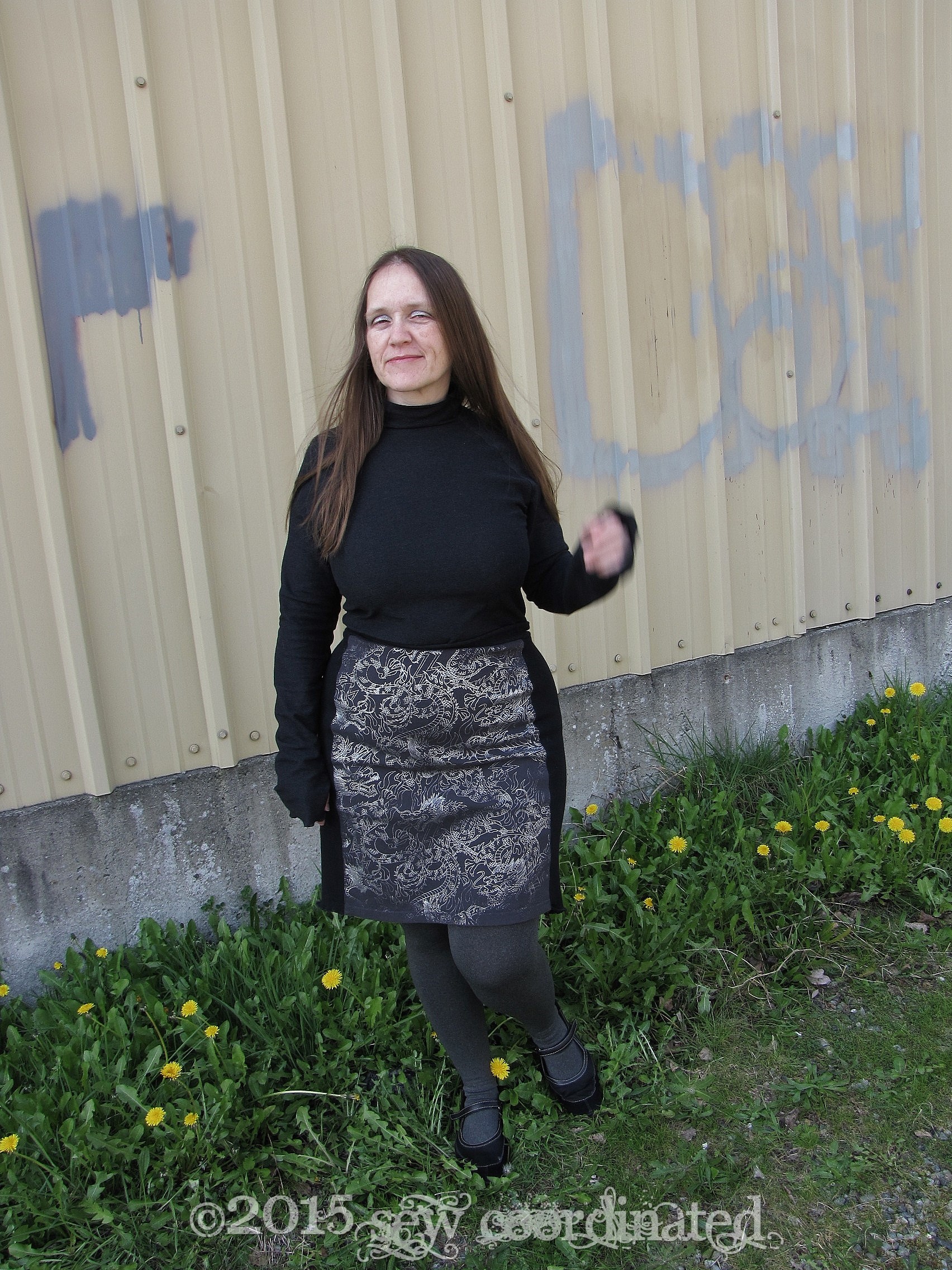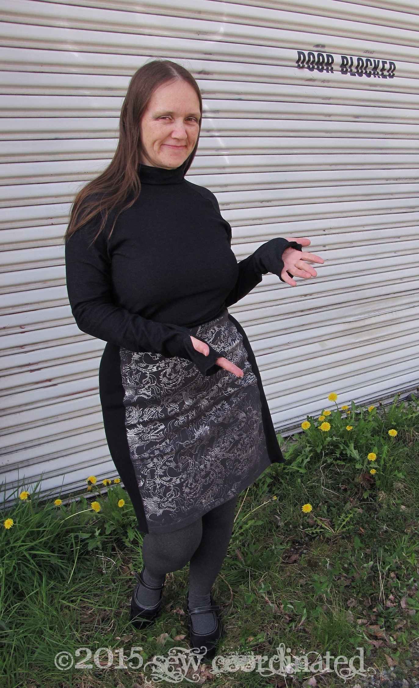 After the panel was prepared,  I used the remaining jersey left over from the Burda top to make the back panel of my skirt.  There was just enough left for that!  I added two darts to the back piece,  because the difference between my waist and hips might cause bunching,  and I wanted to make sure that didn’t happen. Next I cut 2 panels of black rib knit for the sides of my skirt.  I used measurements and drafted a paper pattern for those pieces.  The rib knit was supposed to be for the waistband of the pants I mentioned earlier,  but it too was re-purposed for this project.  I pieced the side panels to the front, and then to the back.  I added twin needle stitching to all the seams on this skirt.  I really love the RTW look it gives.  I then drafted a waistband.and attached it to the skirt.  It fit fine without elastic,  but I wasn’t quite pleased with the look.  I knew that the front panel couldn’t be elasticized because it needed to lay flat in order to be seen.  Adding elastic would make it bunch.  I decided to add elastic to the back of the waistband only,  which  is a technique I like and have used before on skirts.  It gives fit definition to the waist without disturbing the look of the front of the skirt.  Finally,  I lettuce edged the sides and back panels of the skirt to match the sleeves of my shirt.   And there you have it,  outfit completed!