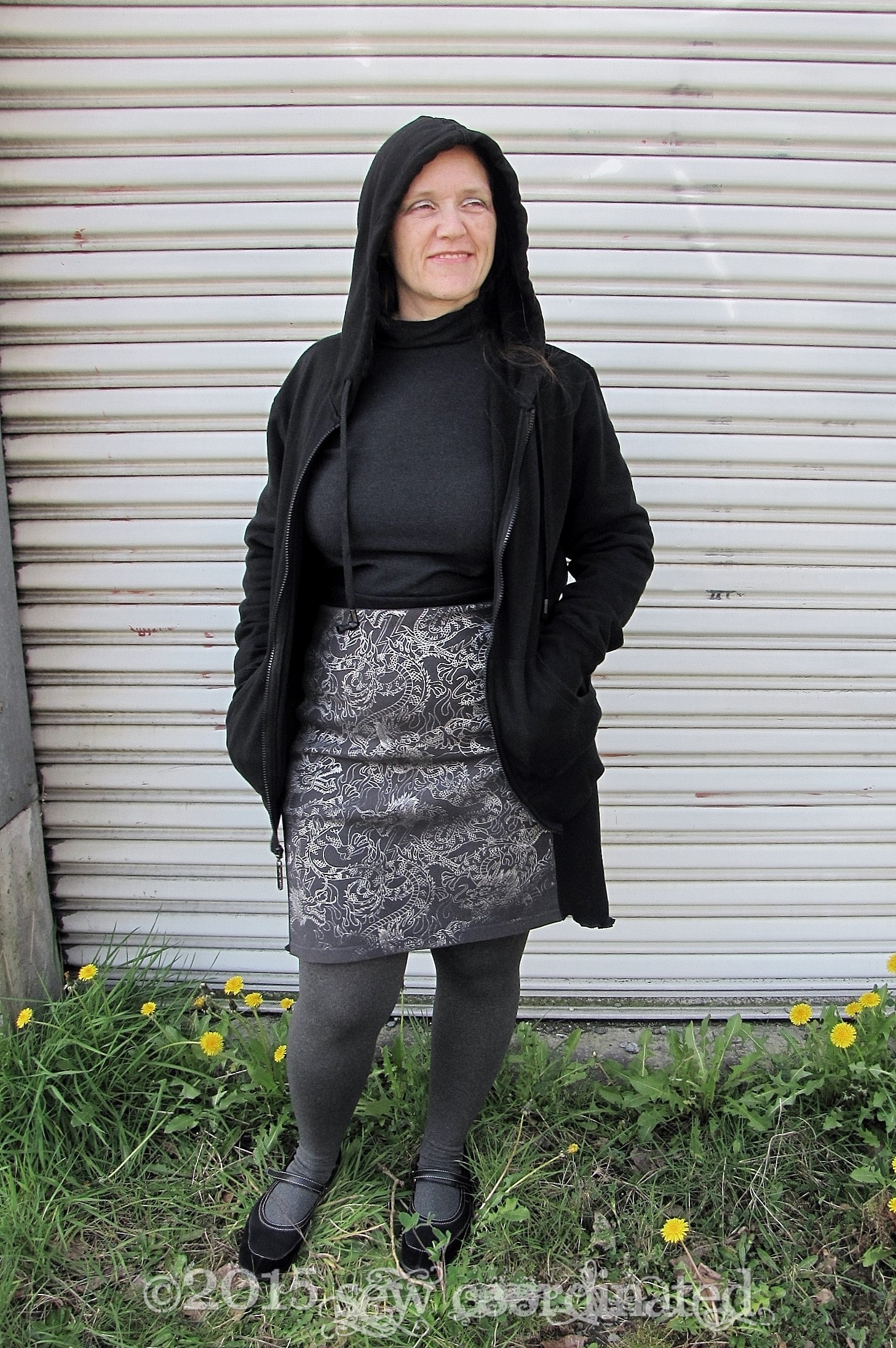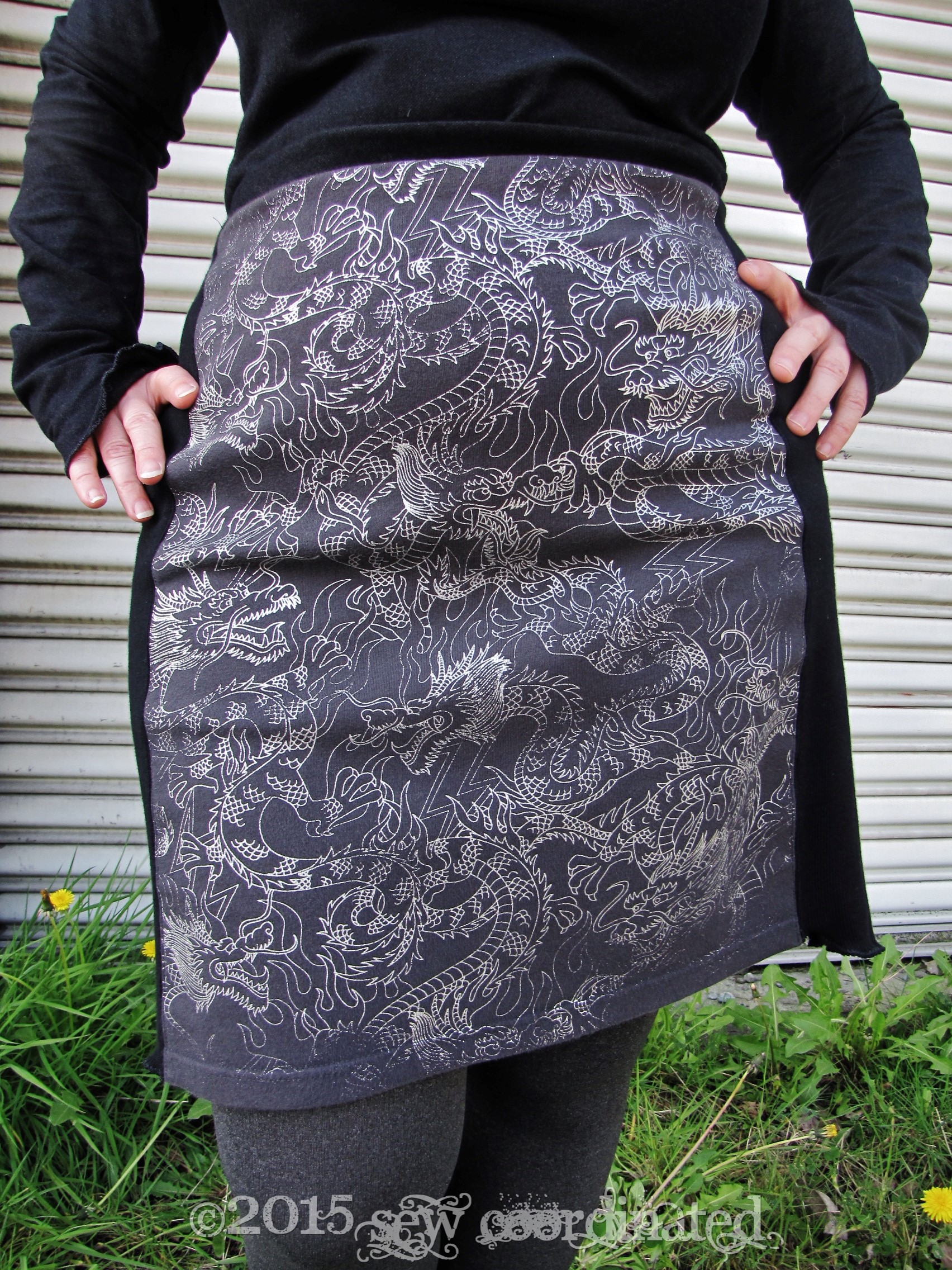 My latest outfit drew it’s inspiration from one of my son’s shirts that no longer fits him.  It was a hoodie shirt by Unionbay with an awesome print of silver dragons on the front.  It was way too nice to throw or give away:  something new had to be made from that print panel!  The most obvious choice for me was a skirt,  as the panel’s shape and size lent itself to that.  More on this after I discuss the shirt.