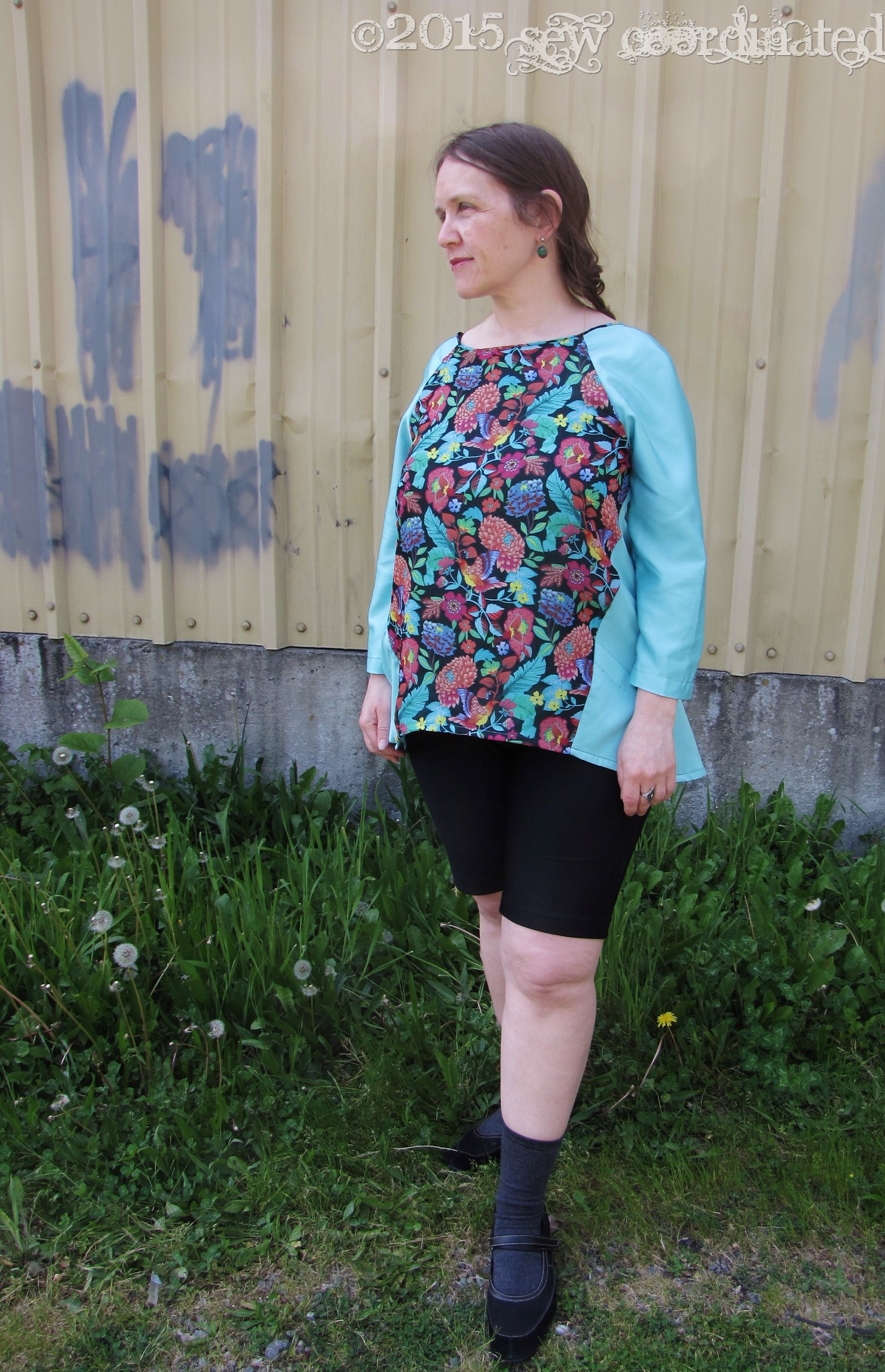 When I saw this chiffon print in Joann’s, I knew I had to make something with it. I think the print is beautiful, and it went well with some green ponte I’m using to make a pair of pants. It also went well with some aqua satin I’ve had in my stash for years from my Craigslist haul. I mentioned earlier this year that 2015 would be a stashbusting year for me, and I’m keeping true to my goal in the making of this shirt. The only fabric bought for this project was the chiffon, which I backed with the satin to make it opaque.