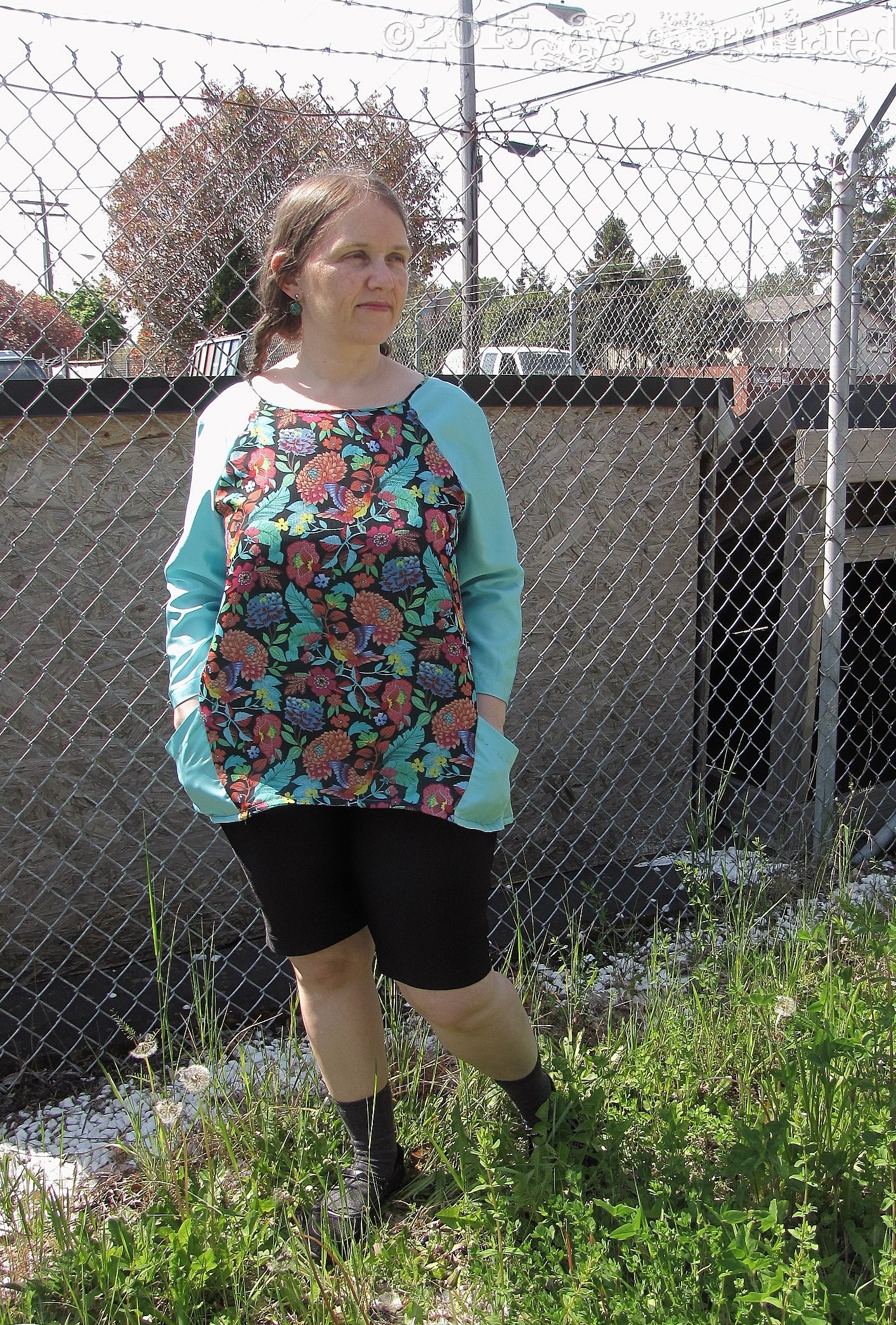 As for the pattern, it’s a bit of a departure for me. I’m very spoiled by the comfort and elasticity of knit fabrics, and a woven shirt is indeed a change of pace! I chose 7093 for the way it would showcase the chiffon print. I also liked the raglan sleeves, angular panels and pockets, and the graduated difference in hem height from front to back. I chose my size based on my bust size (38), and cut a 16. It fits fine, however, there was a problem with looseness in the shoulders when leaning to one side or the other. This would cause a problem of my bra strap showing on one side. You can see that a bit in the 4th pic down. My shoulders might be smaller than average, so that’s probably the reason why. I’ve since fixed the problem by extending the length of the upper sleeve dart, which has helped the shirt stay on my shoulders better. I have to say that the neckline on my shirt isn’t as high up as the model’s shirt on the pattern envelope. I also chose View B with the pockets, which I must have. They’re by no means heavy duty, but they’ll hold a shopping list or a couple of tissues, so they have a purpose.