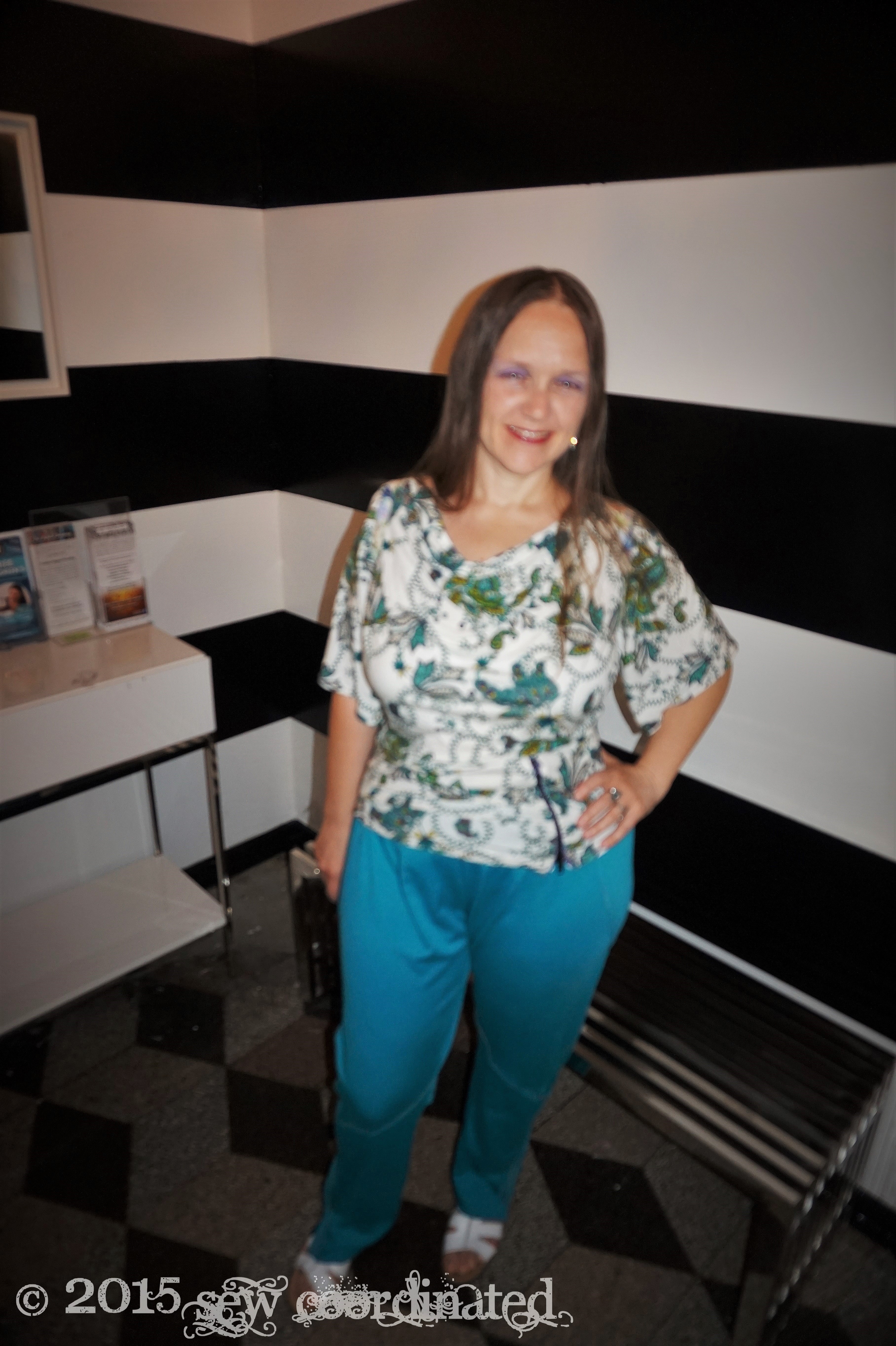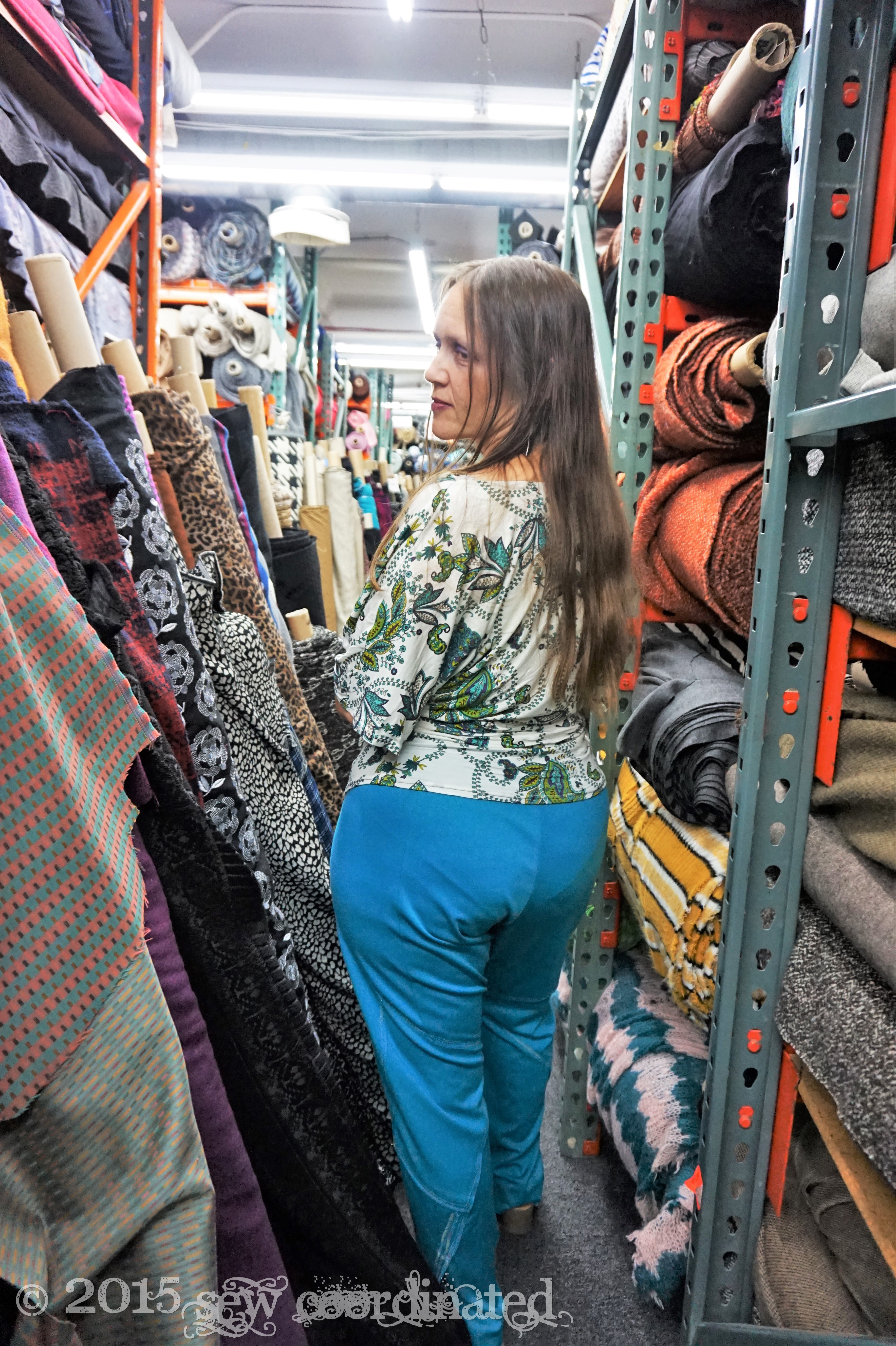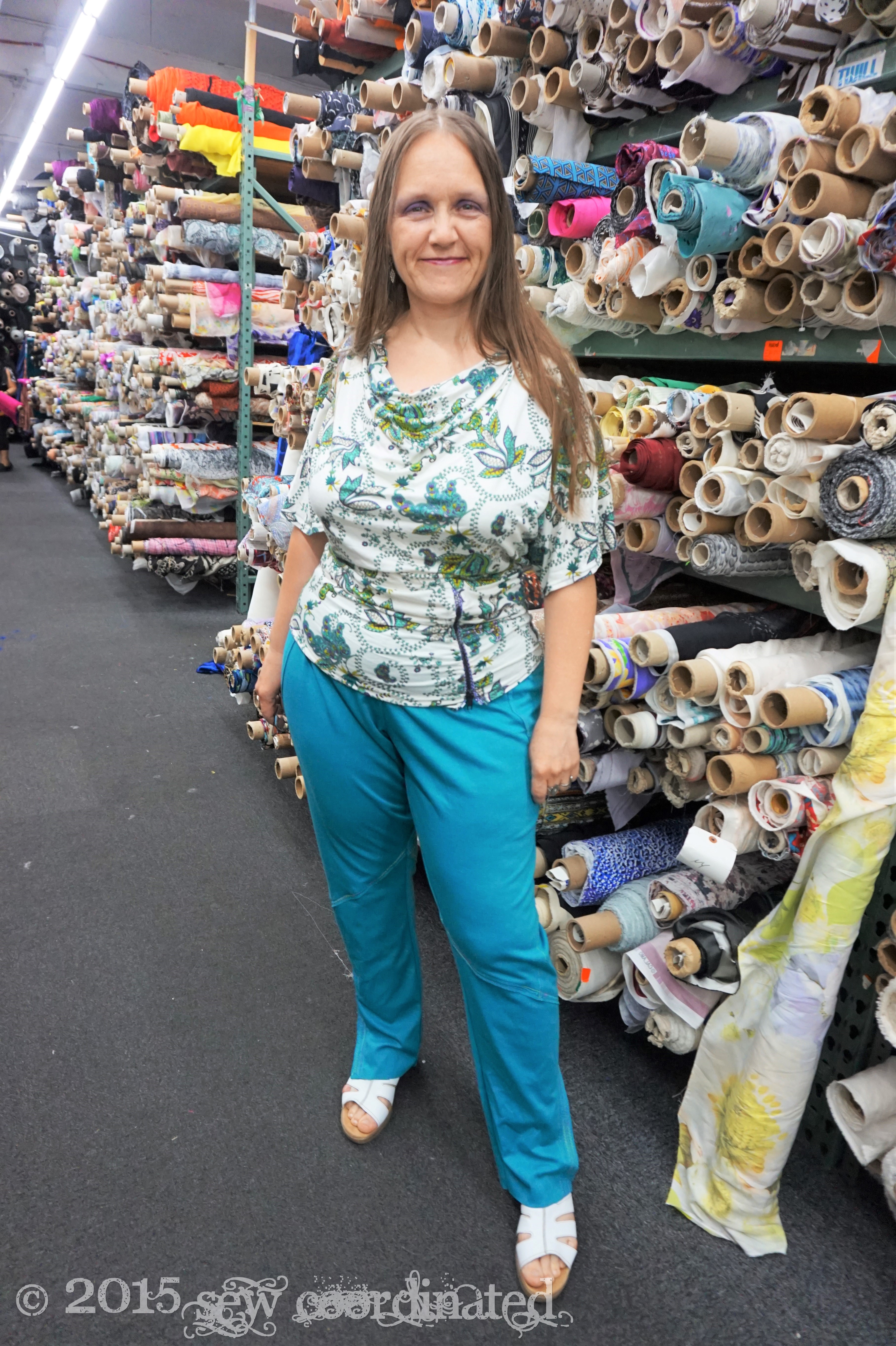 I’m here in NYC on family business,  so of course I took some time out to visit Mood Fabrics!   It’s been a dream of mine for a long time that has finally come true!  I made sure to model my new outfit while I was there:  the shirt is M6752 view A,  made in one of Mood’s jersey prints.  I bought this print to match the green ponte that I used to make my pants.  It’s a teal sort of green and finding the right knit print to match wasn’t easy.  After looking around at my local Joann’s and at other online fabric shops,  I decided to order the paisley from Mood.  It really matched the green better than anything else I’d seen.   It was a fairly easy shirt to sew,  comfortable and satisfying to wear.