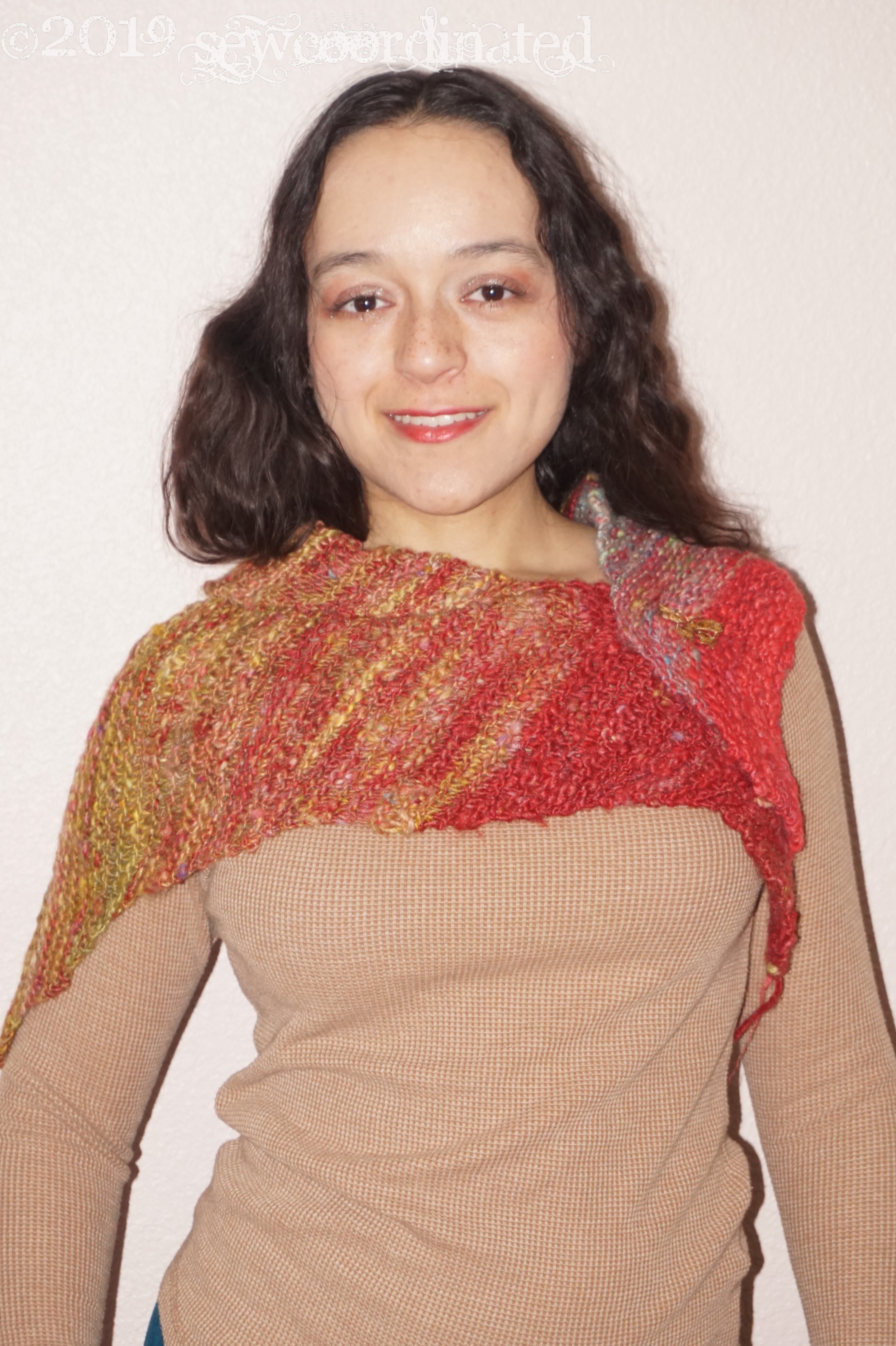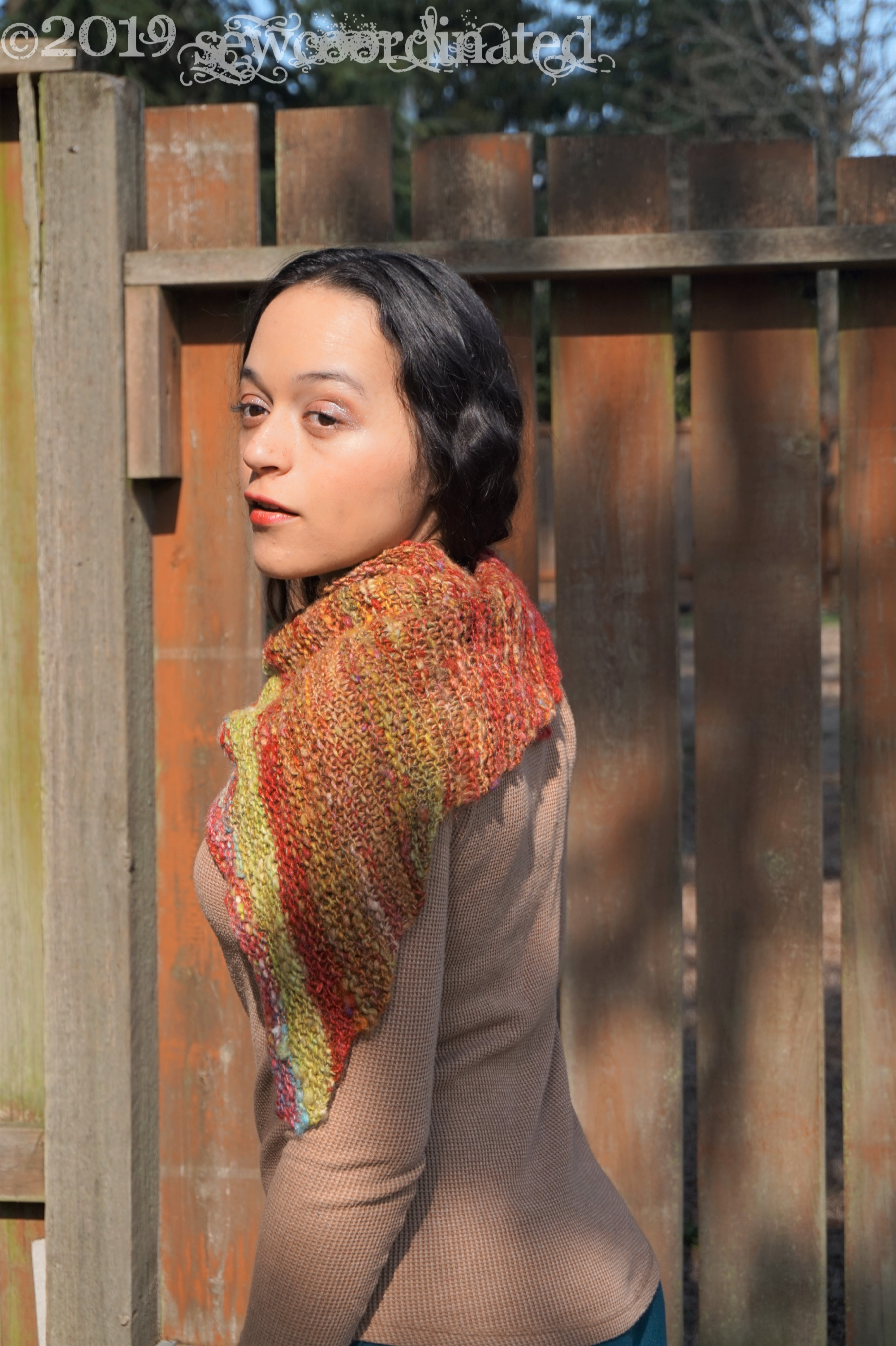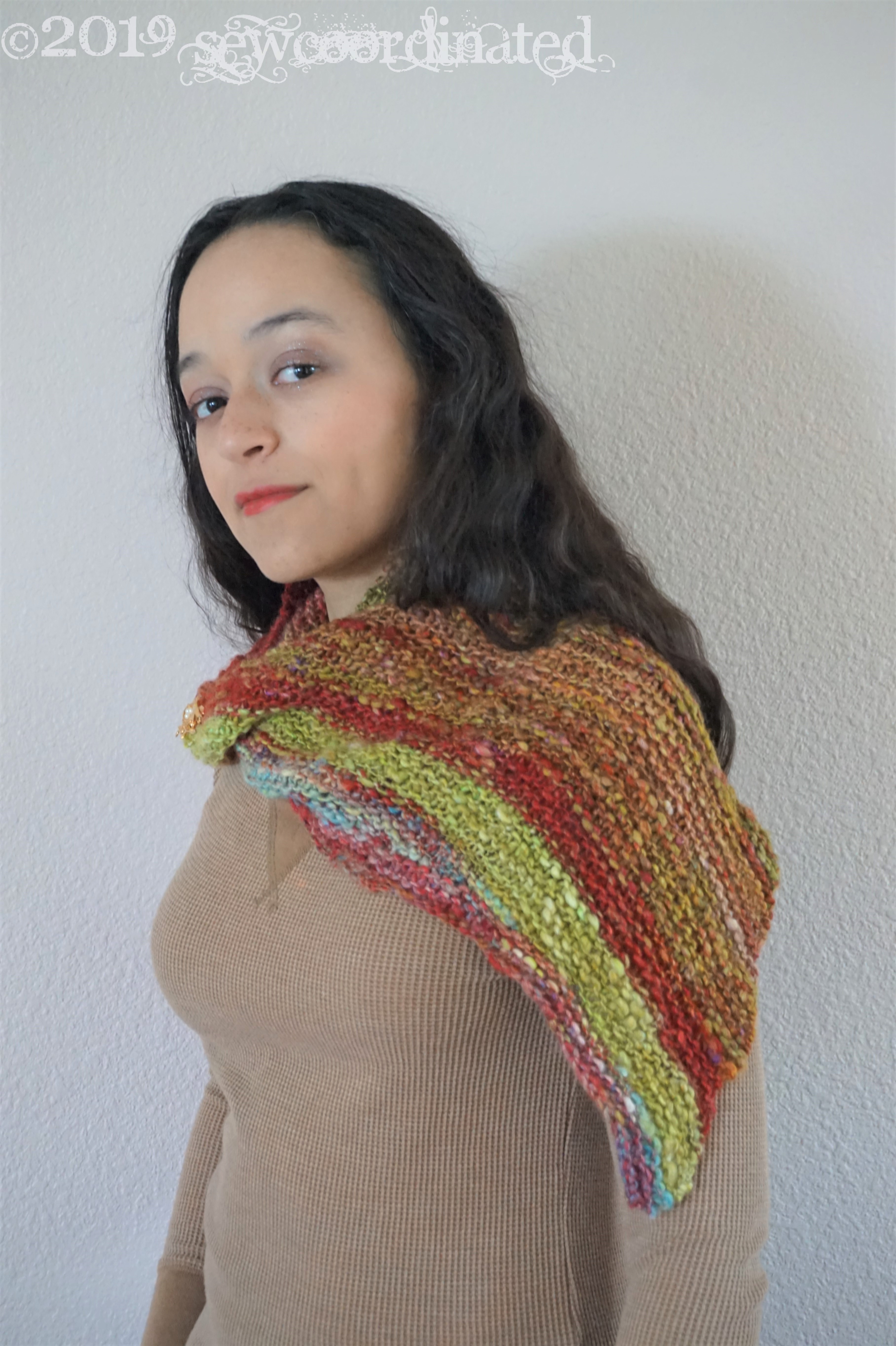 Remember those rolags that I made? Well, I spun those up into an art yarn single that I just realized I only posted on Instagram. I recently knit that into a small, free form art yarn scarf/wrap.