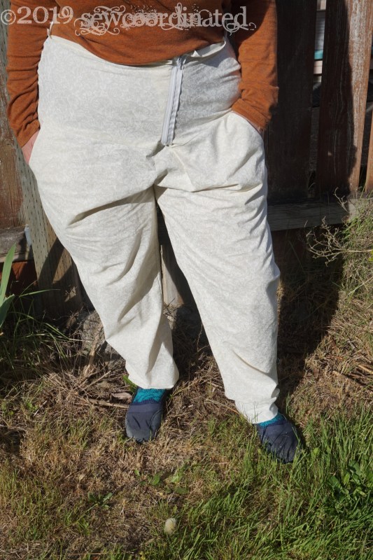 I expect this will work well on the finished pants. I thought the fit was quite good even with the error, and I’m really, really pleased with how comfortable they are! I feel that I hit it out the park with this one, and I can’t wait to make them up in the fashion fabric, which I still have to buy. I thought I’d be able to use a spring like plaid that I’ve had for ages, but there isn’t enough yardage (darn!)