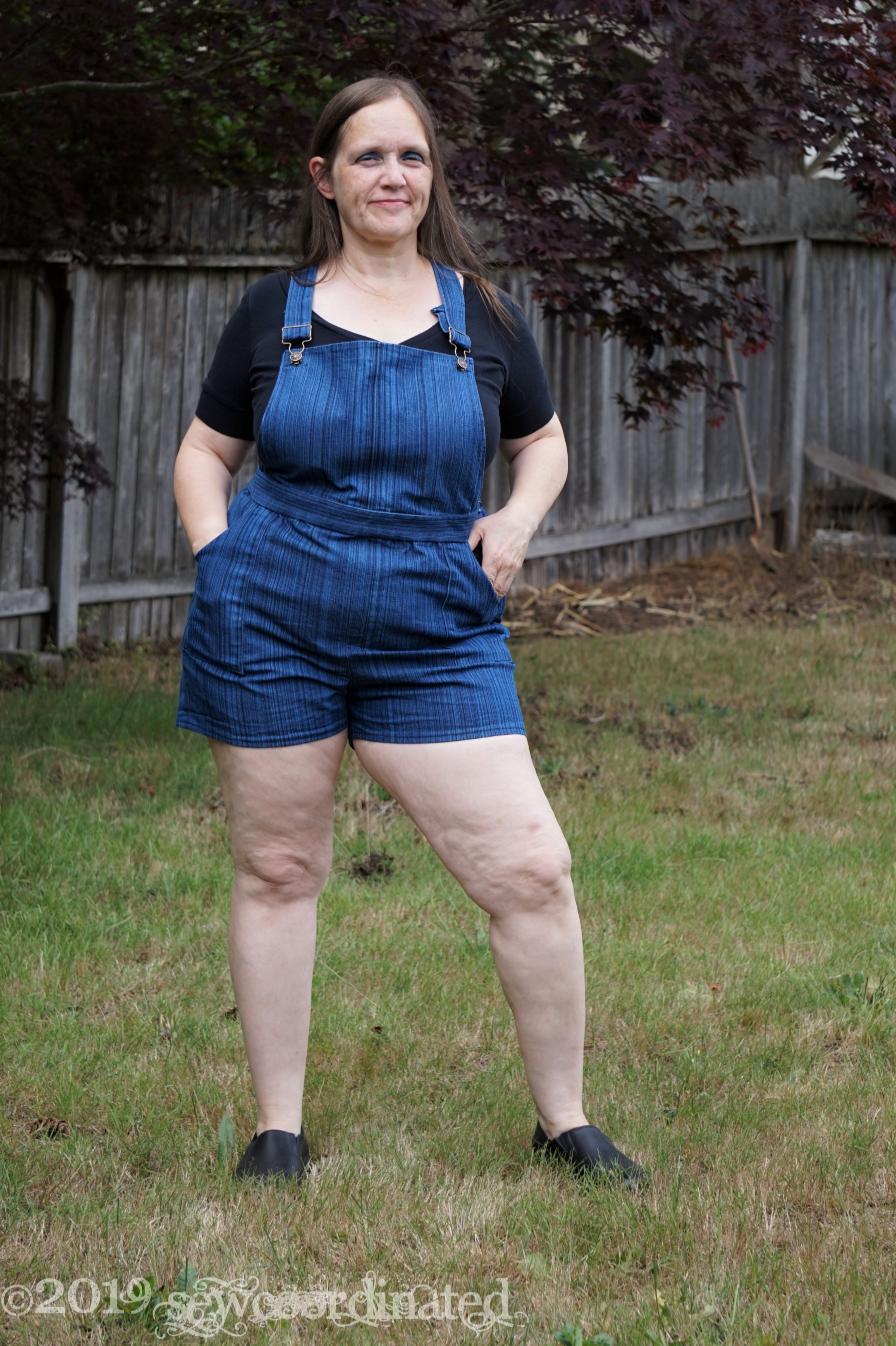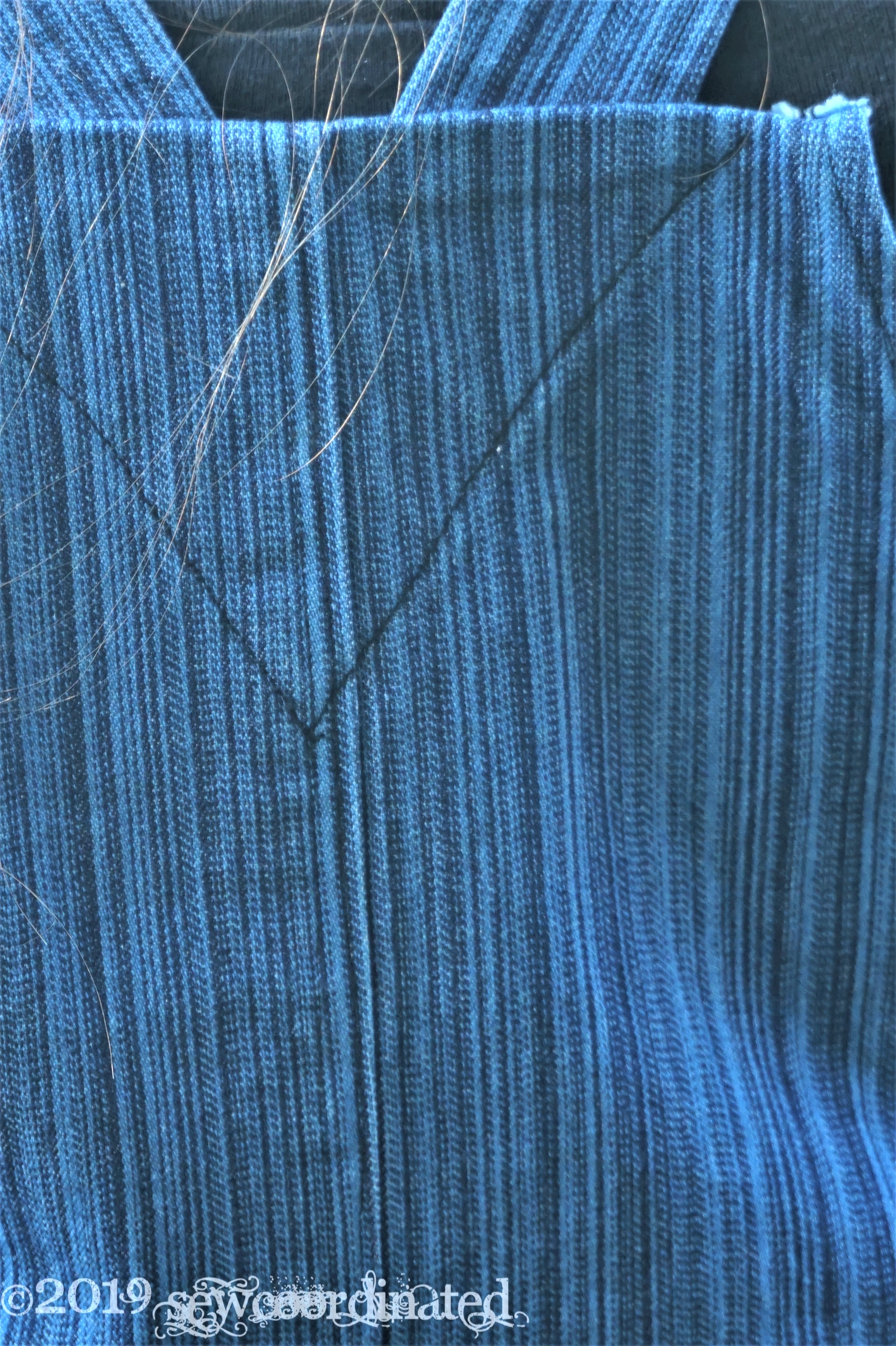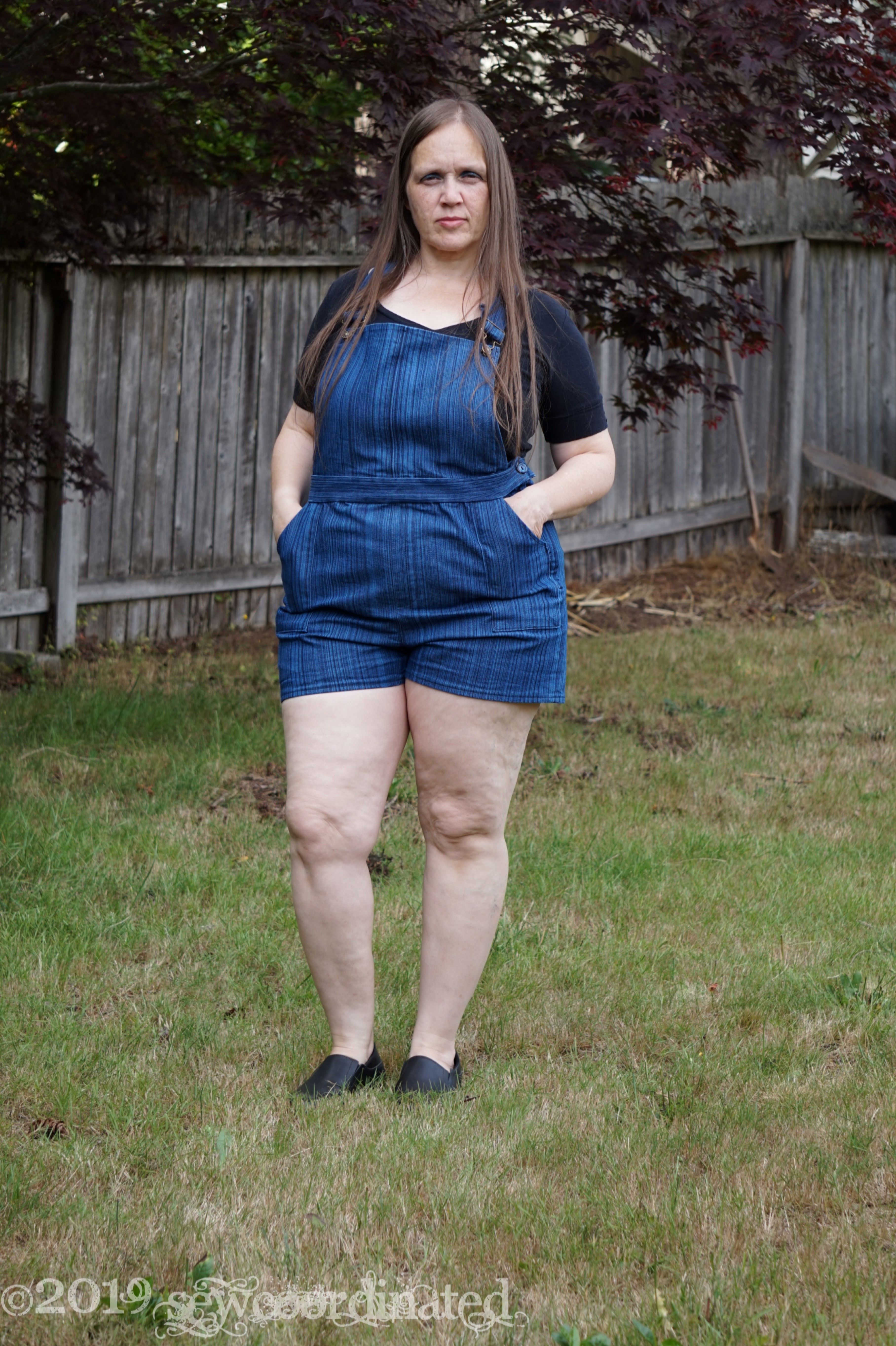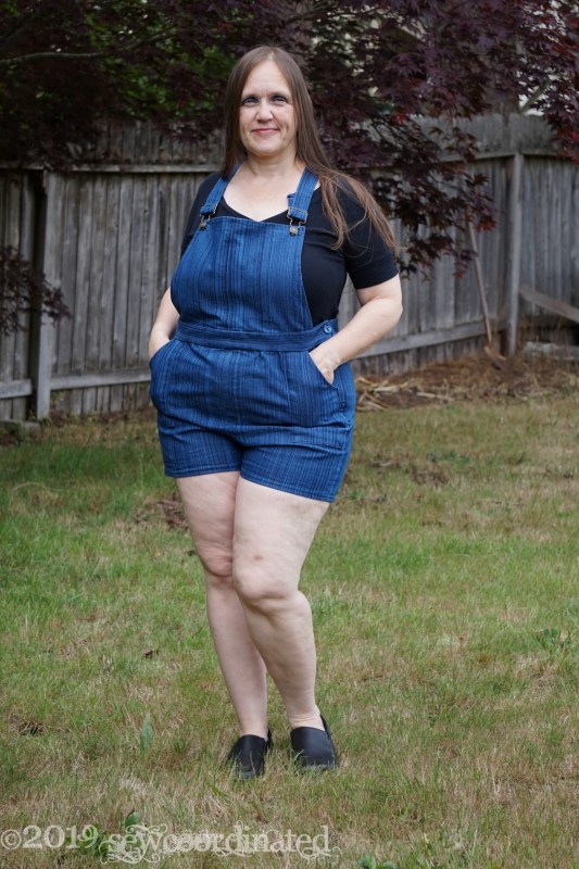 This pattern has been in my stash for a few months. I also had a couple yards of striped stretch denim that I bought at JoAnn’s last year, so M7547 + stretch denim = Overalls! I’d been working towards getting around to making up this pattern, and I finally did in the past month. I’m planning on wearing them to work during the summer. I made view C, the overall shorts, and I left out the belt loops.