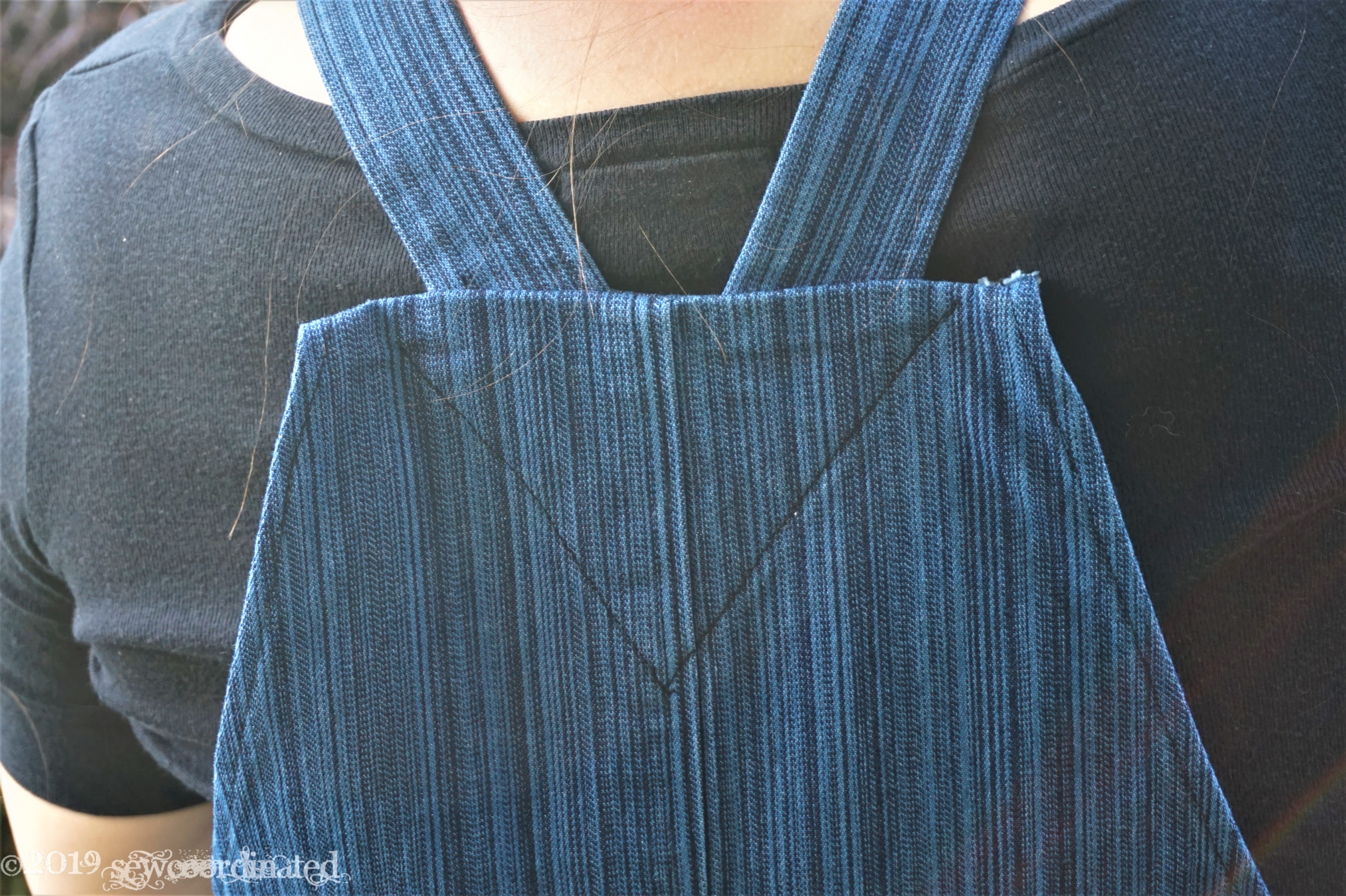I thought that the back bib construction could be improved somehow in regard to the top hem, and that the straps could’ve been made double rather than hemming them. Other than that I found the pattern to be well written with no errors detected.
