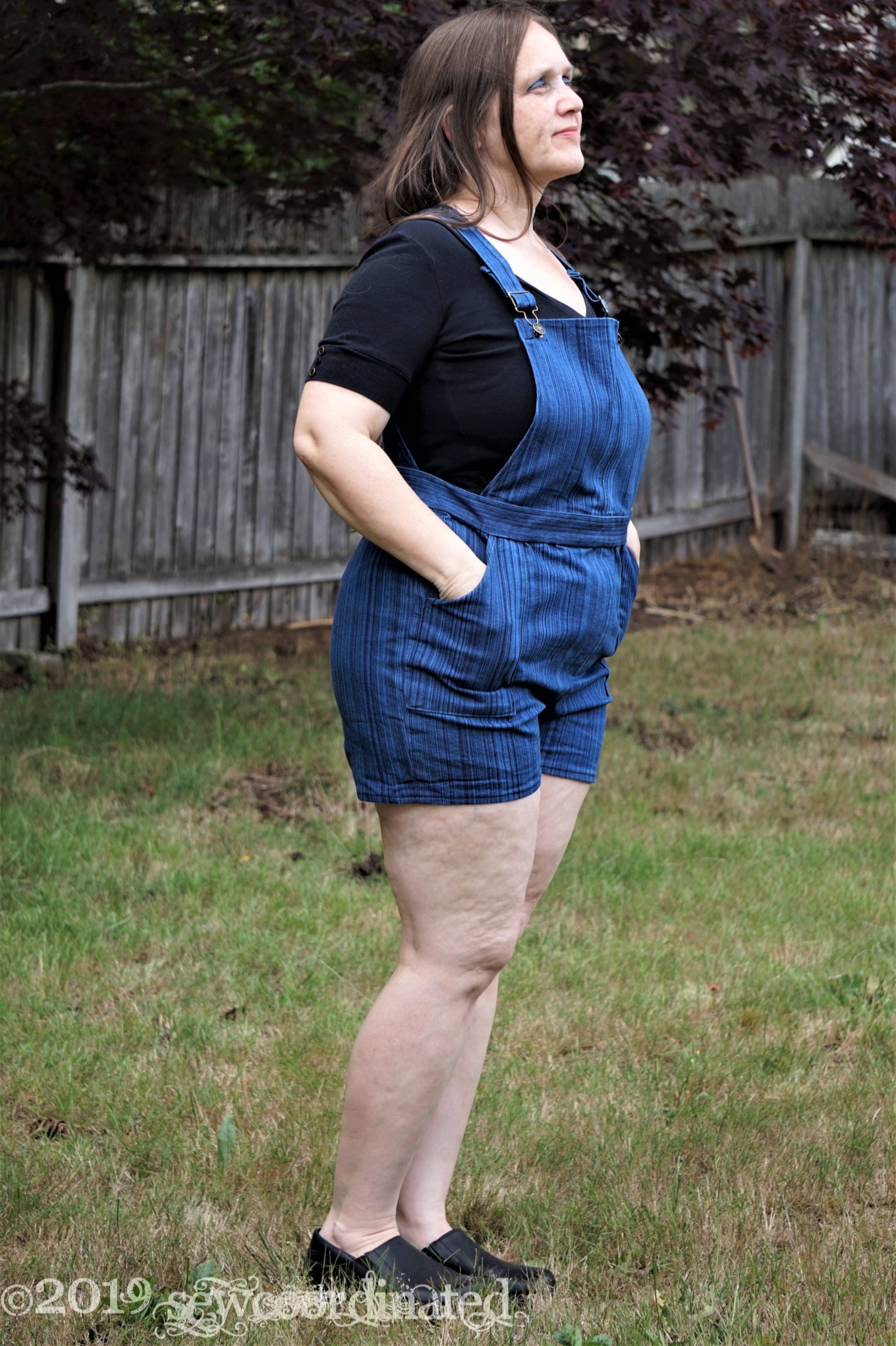 I cut an 18 for the bib, and went with 22 for the waist and pants, the reason being that the overalls are close fitted, an important fact that’s stated on the pattern envelope. When determining what size to cut, I always take the design goal into consideration. I do think I could’ve cut a 16 for the front bib, because I think it may be a bit large and slightly baggy, but it’s not that bad. I didn’t have any trouble with size blending, which is nice. Usually pants will need to have line adjustments made for the difference in sizes from waist to hips, but I think that because they’re overalls they didn’t need it. I also think the waist is a bit baggy. I thought about cutting a 20 but I didn’t want it to be too tight so I played it safe. I might just need to tighten the strap to improve the look.