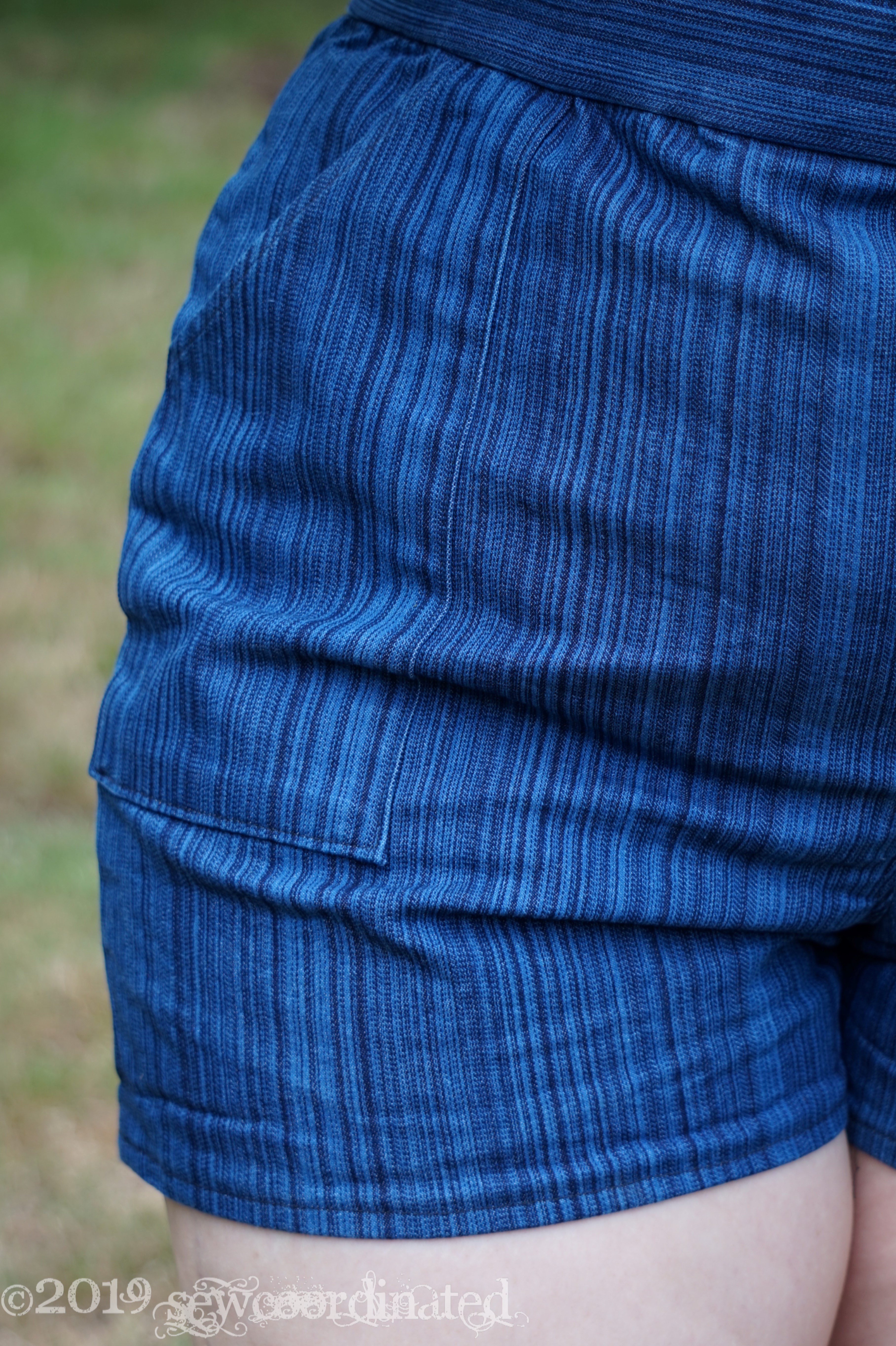 I lowered the crotch depth by a 1/2″ using the pattern’s own lengthen/shorten line. That’s the only adjustment I made. I wish that I’d added more length to the shorts themselves, because I wanted more of a 3/4 length shorts/pants, but I’m pleased with them anyway. If I make them again I’ll remember to do that.