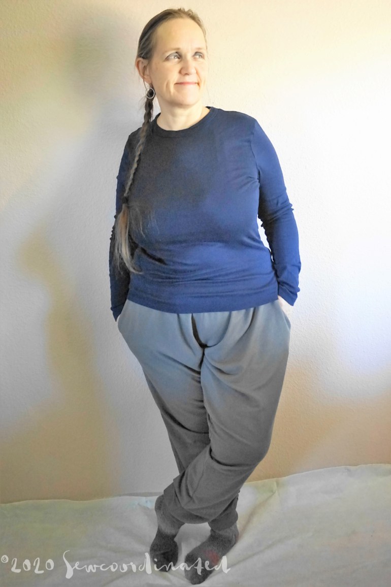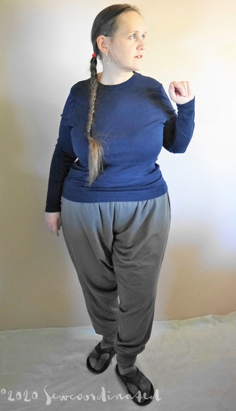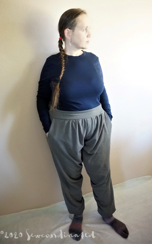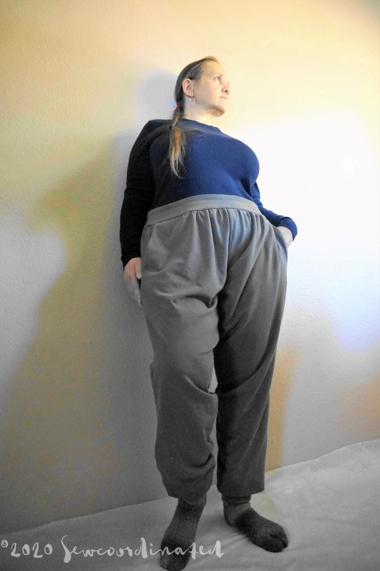 In regard to the waistband, I have to say that I think it might’ve been better served by using an interfacing stabilizer: nothing too heavy, just a lightweight interfacing designed for use with knit fabrics. I think that a waistband such as this one, that has no drawstring and is tasked with having to hold up a lot of excess pants leg fabric, would benefit from some extra stabilization.
