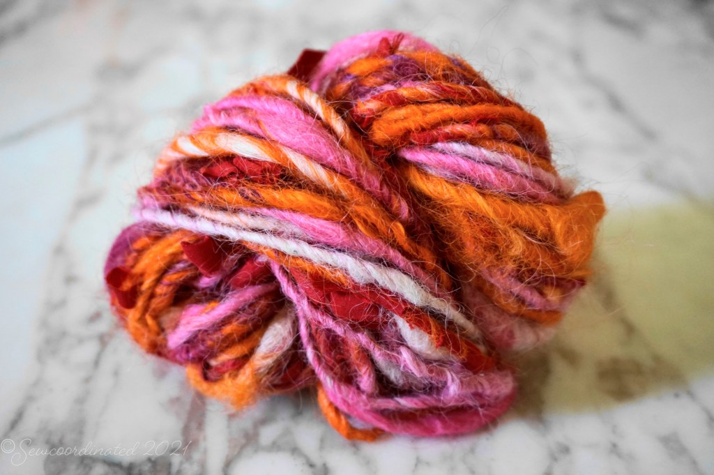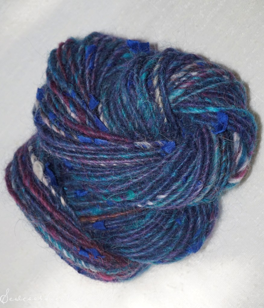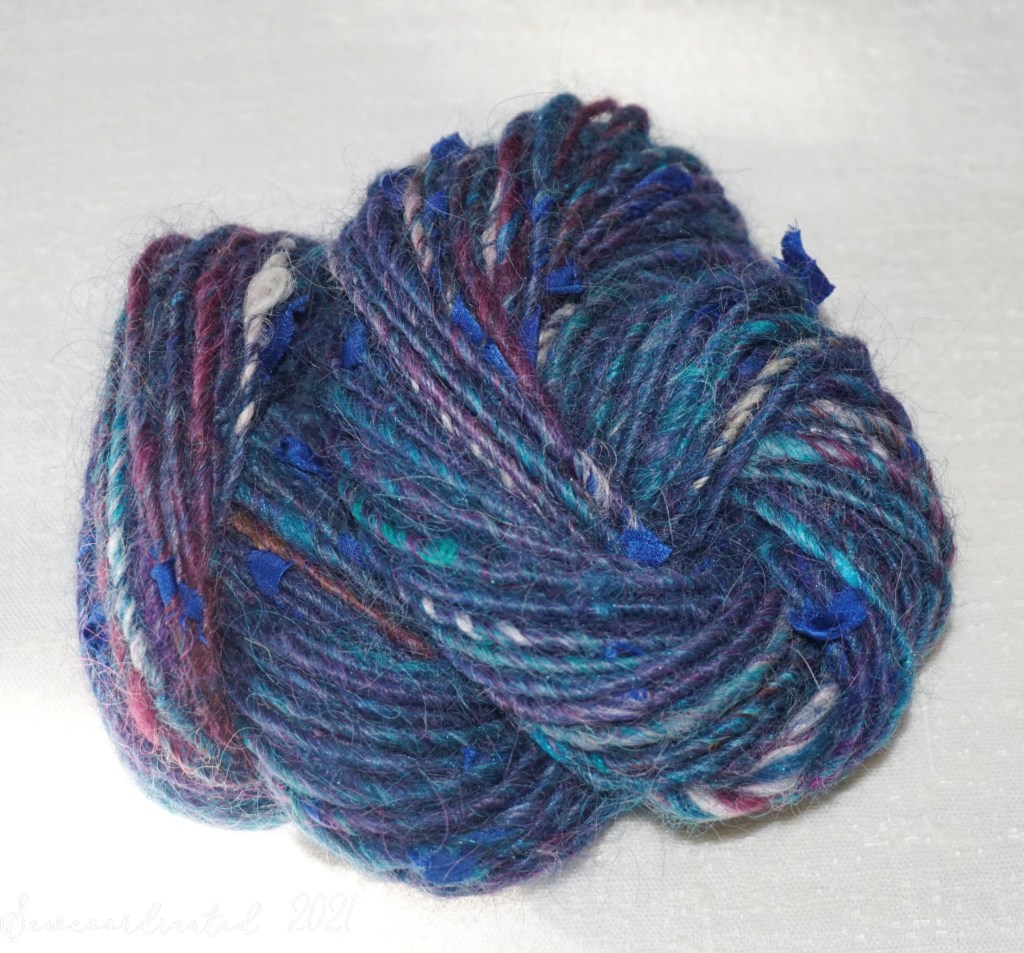These spins feature inclusions of silk scraps from my sewing stash, a new technique that I’m playing around with for fun. They make a nice addition to art yarn, and help me bust out parts of my fabric stash, which is a big focus of my work this year. More on that in my next post!