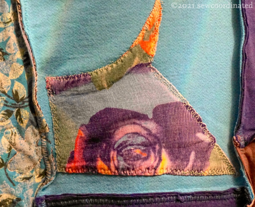 As you can see, if you read Part 1 of my series, I used some of the fancy rose print dress fabric as decorative patches over the 2 larger blocks. It’s a very slippery ribbed knit fabric with a floppy drape. I’d wanted to use it more, but the difficulty in handling and need for stabilization changed my mind. For the patches I used a backing layer with Wonder Web in between and fused. This made them stable enough to applique to the blocks.