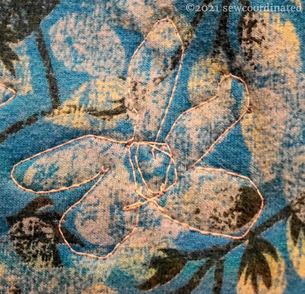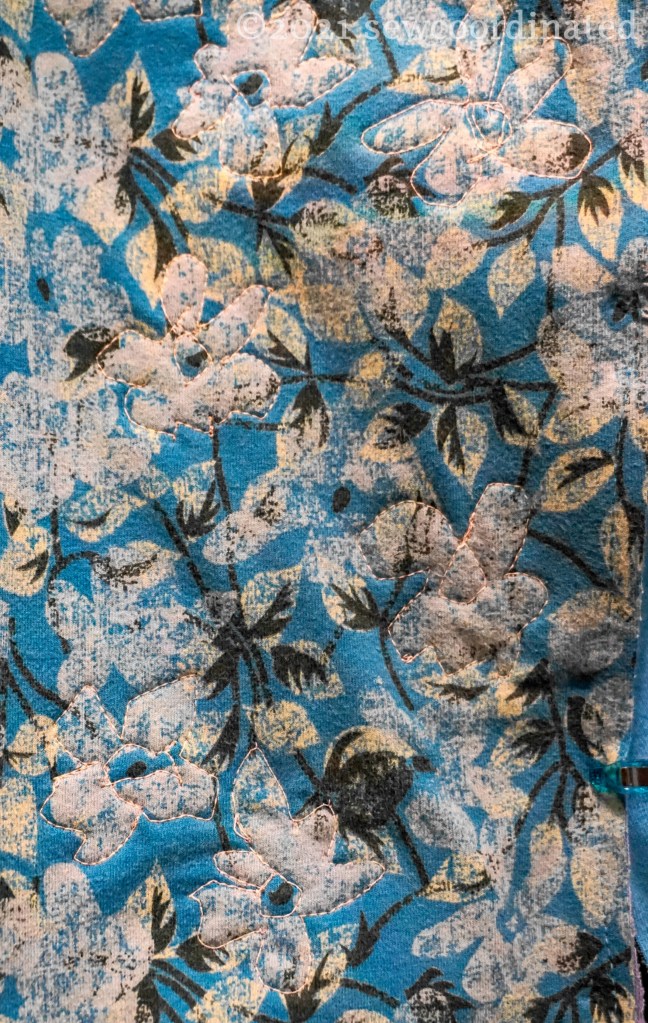 Another technique that I used to balance weights is machine embroidery. On the 3 layer floral side panels I needed a way to keep the layers tacked together to prevent fabric pooling and puckering. I used freehand machine embroidery to do this. I decided to stitch around the flower outlines, and I used glow in the dark thread for this! I don’t know if I’ll be able to get a pic of the flower stitched “glow” (it has to be charged under light first and viewed in the dark), but I know it’s there. Here’s a couple of close ups of one of the panels: