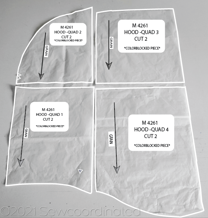 As you can see, the pieces are lined, and I basted them together before sewing them together as the hood. Basting is a very important step in color blocking, when working with multiple pieces that each have a lining. It battens them down, making them much easier to work with when assembling the final piece.