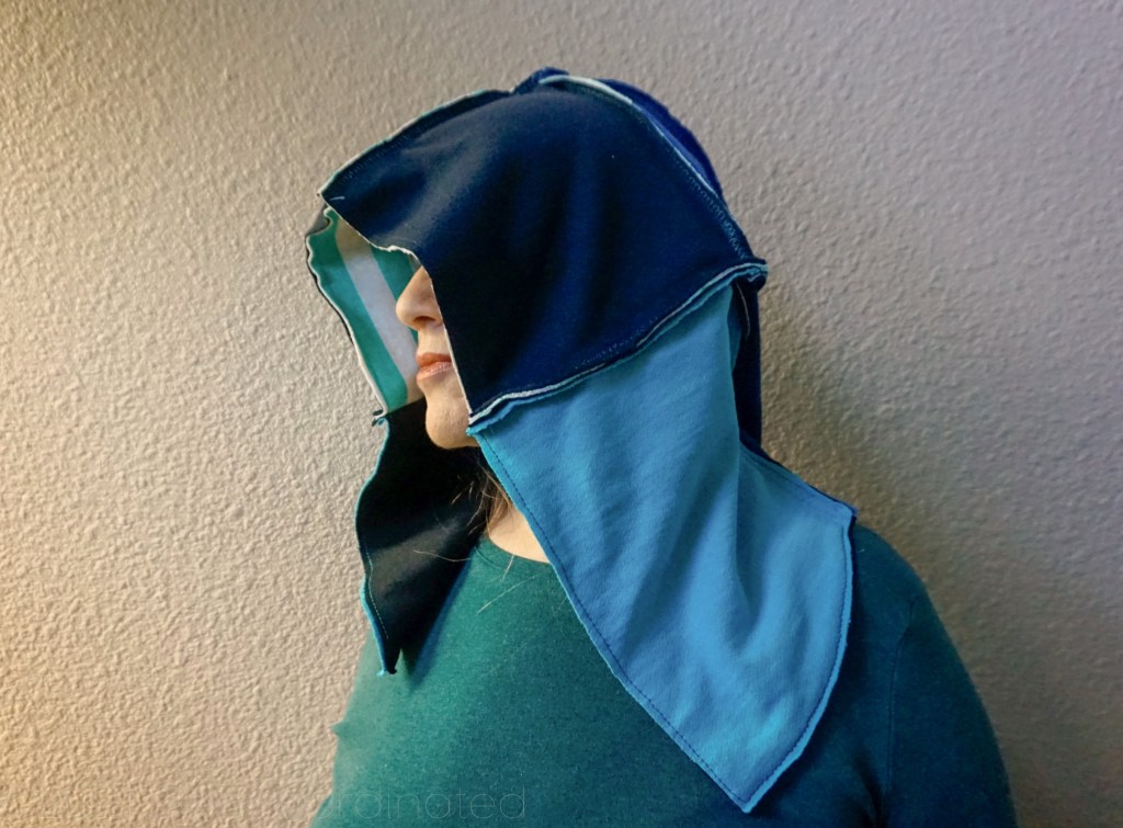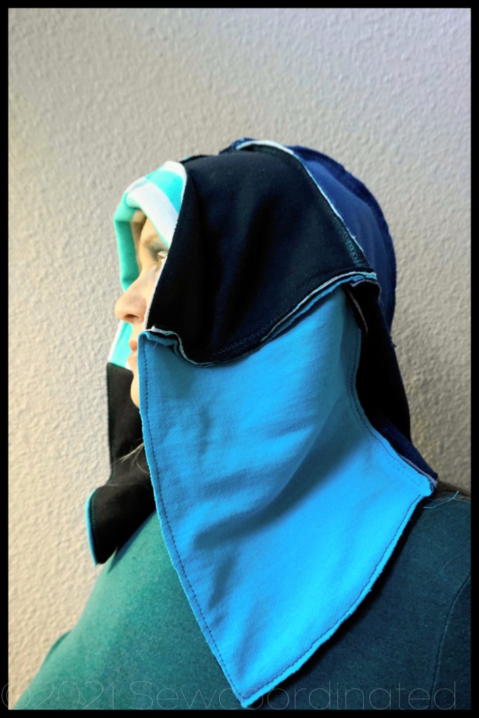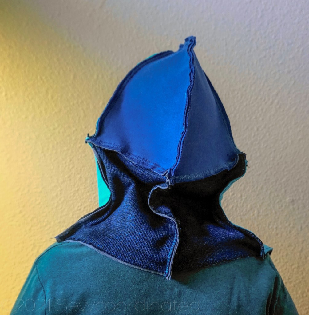 The easiest part of this jacket so far, the hood has also been fun to construct and model. Originally a 2 part hood, I divided each side into 4 quadrants, which resulted in an 8 piece hood. Again, as with the other parts of this jacket, I lined all the pieces with spare knit fabric, in order to balance out the different fabrics weights being used in the stashbusting process. The goal is to achieve a consistent thickness of weight, as though it was cut from one piece of the same fabric. This also serves to make the jacket wearable during the colder weather, the other goal here.