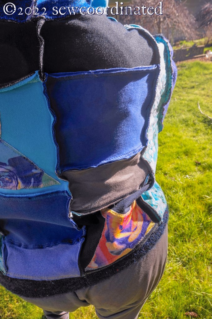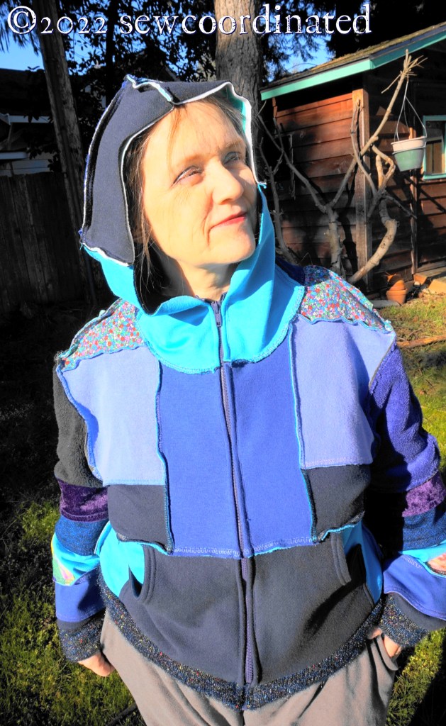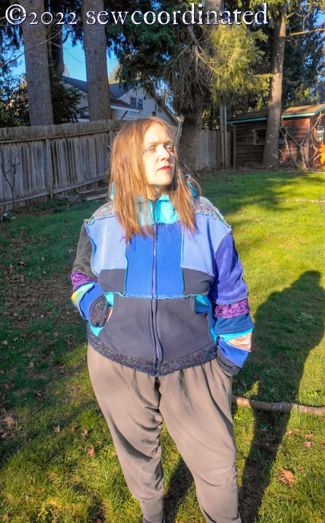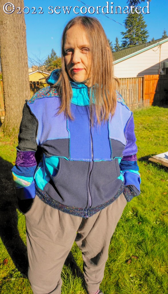 After 8 months in the making, here’s my completed jacket, made only of remnants and scraps from my knit fabric stash. The cost was only the price of the zipper, about $4.00 after my coupon discount at Joann’s.