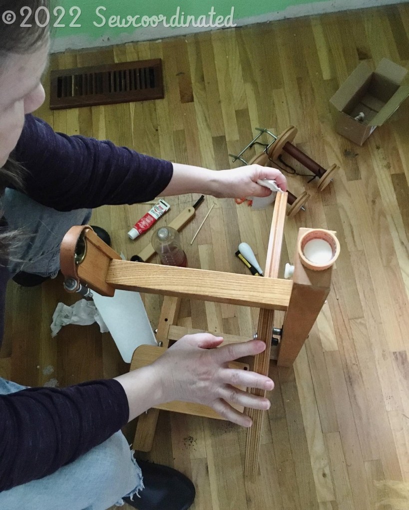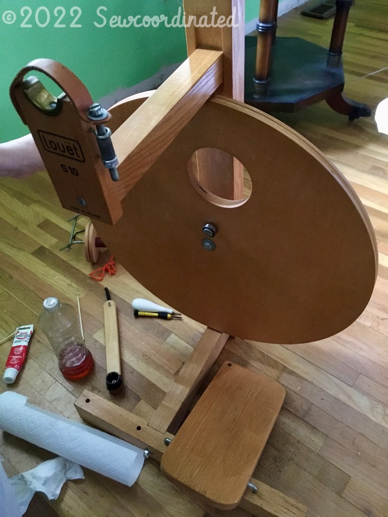 Finally, I had to stop and do wheel maintenance during the spin with the gold thread. It got sucked into the central bearing of my wheel when I first began, and it made the wheel noisy, which of course tipped my off to the fact that something was wrong. I knew what had caused it, and I stopped what I was doing to take it apart:
