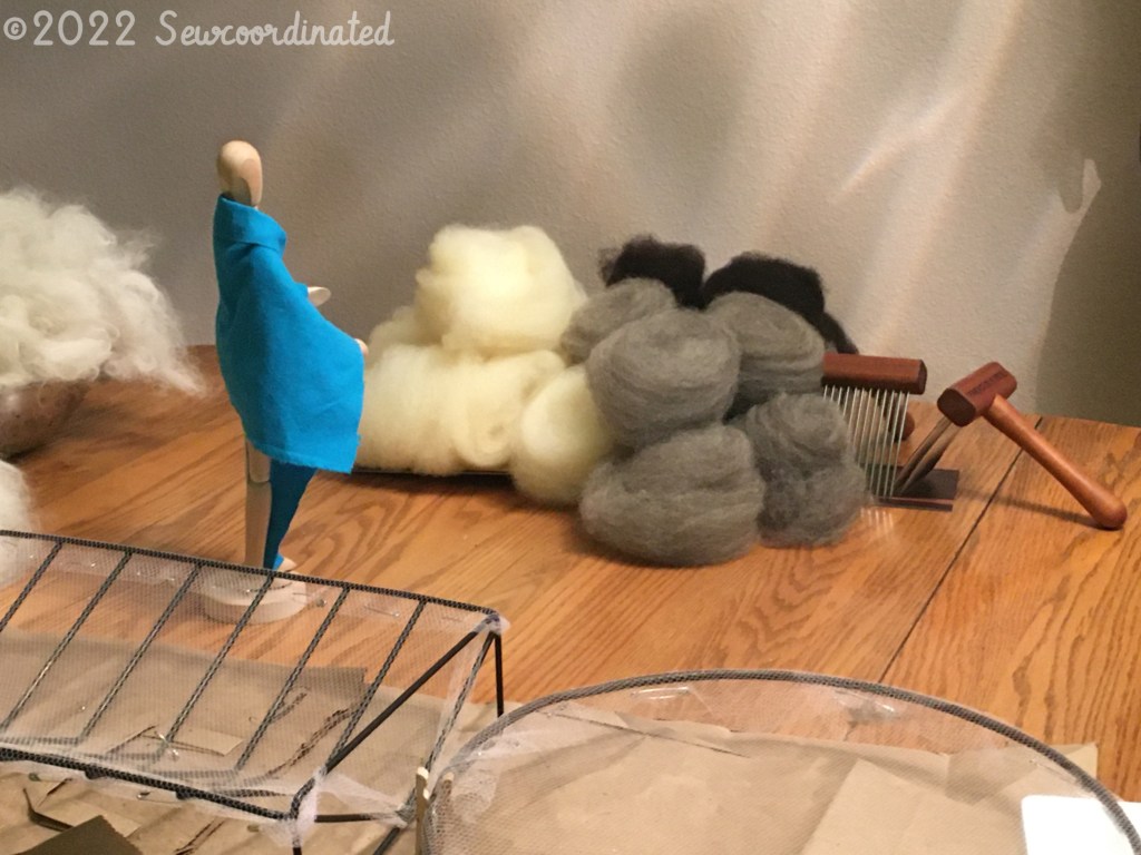 I made homemade drying racks out of some frames and the tulle I bought to wash the wool with. The frame on the left is from an old roaster pan, and the other is from…I can’t remember where we got it from! It’s one of those items.