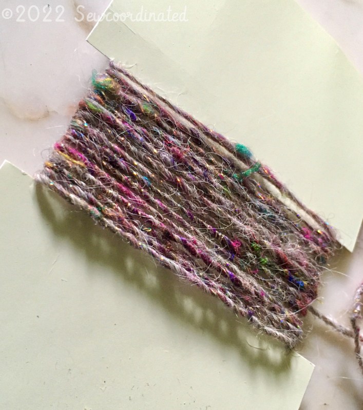 The 2nd spin I did ended up being a fingering weight single, 15 WPI, 210 yds (192 m), which I autowrapped with gold Sulky Holoshimmer thread. It’s from my daughter’s sewing stash, and she kindly lent it to me for my spinning: