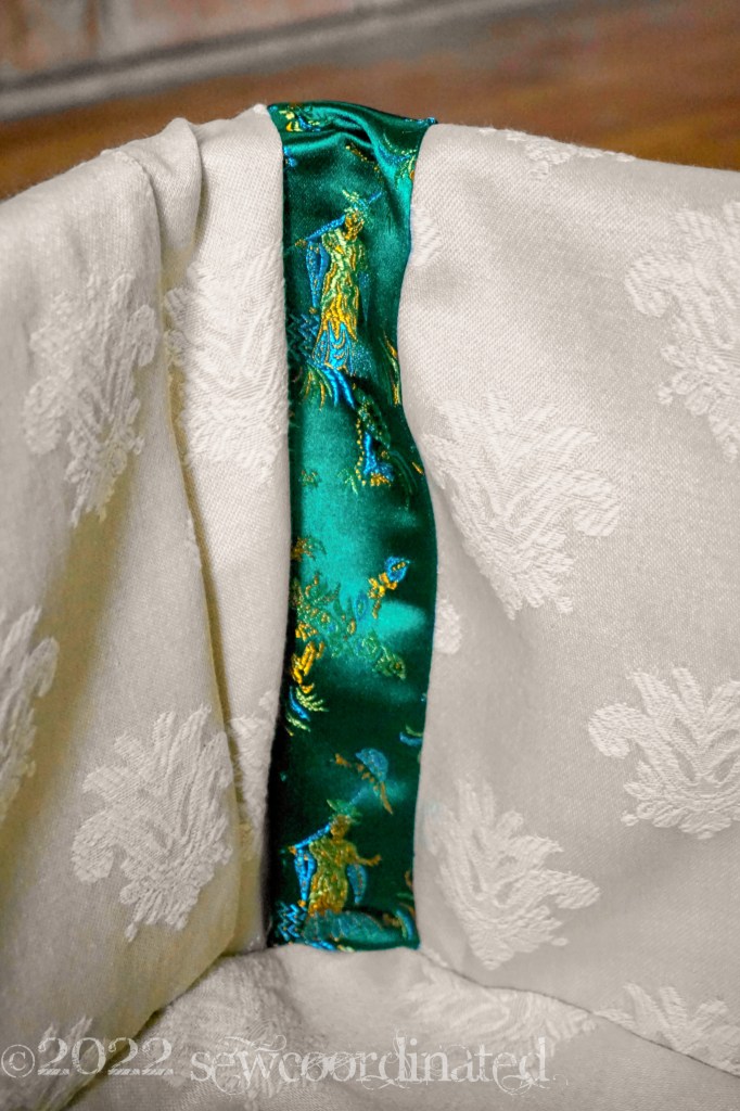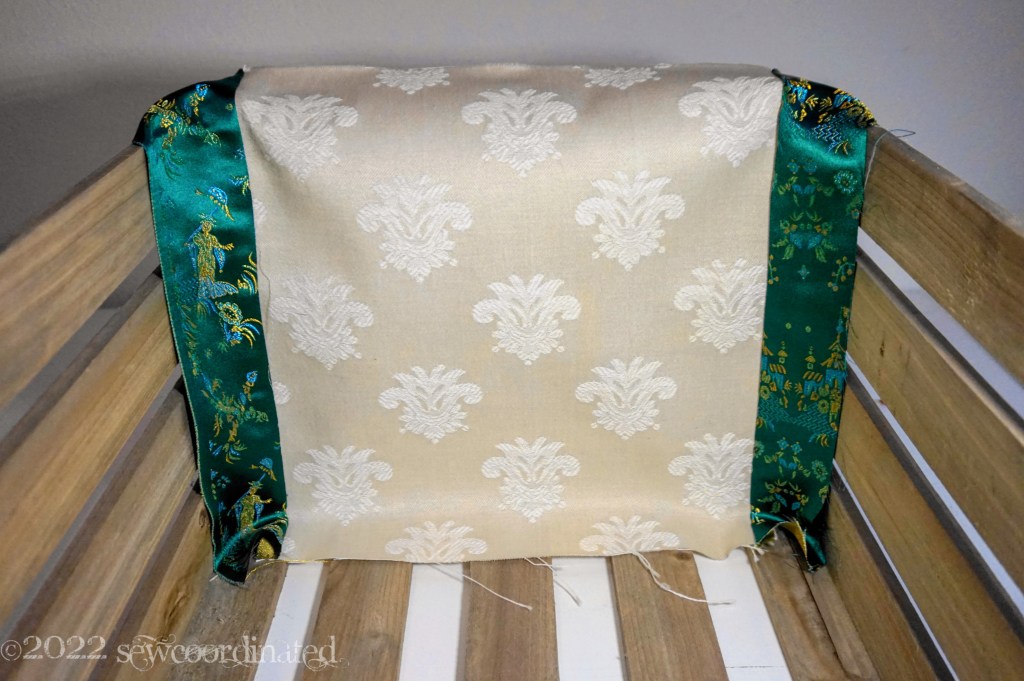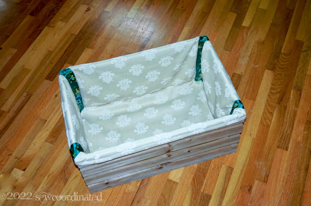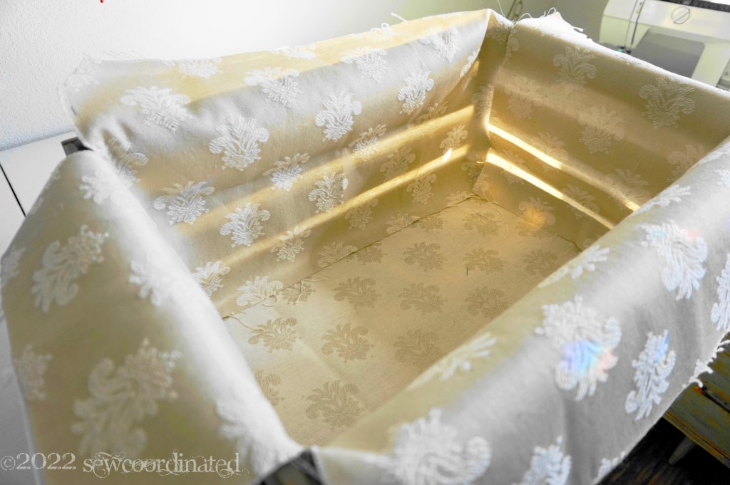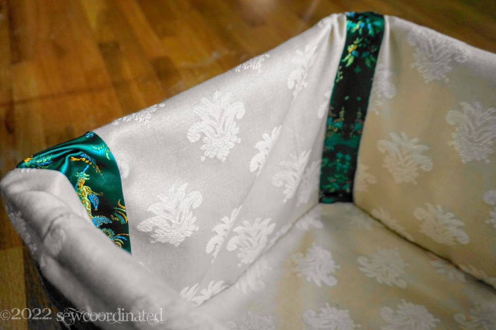 This project wasn’t without problems though. Turns out that even with as much seam allowance as I added on all the pieces, it still wasn’t enough. The top of the liner was too small to fold over the top! I was surprised by this! The math of making a crate liner is a bit more complicated than I thought. What I did to remedy the problem (and save my project), was to splice in an extra piece of the damask. Luckily I had a little left. The piece that I needed ended up being an upside down triangle: wider at the top and tapering to narrow at the bottom. That’s the amount of room that was needed to make the liner fold over the top and not pool too much at the bottom. Here’s a pic of the splice: