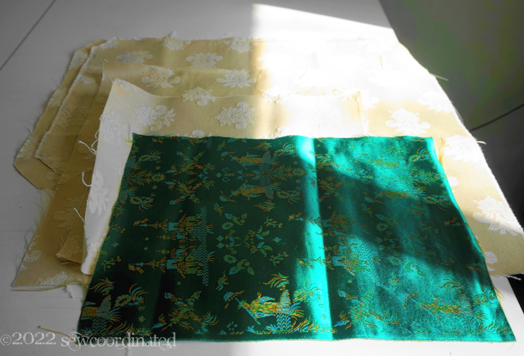 I’ve had this cream and ivory colored damask-ish remnant for years and could never find a use for it. It’s from my Craigslist haul way back when. Turns out that holding on to it wasn’t a mistake. I’ve finally found a place for it. I also pulled a piece of embroidered satin from my stash to line the 4 corners of the crate with: