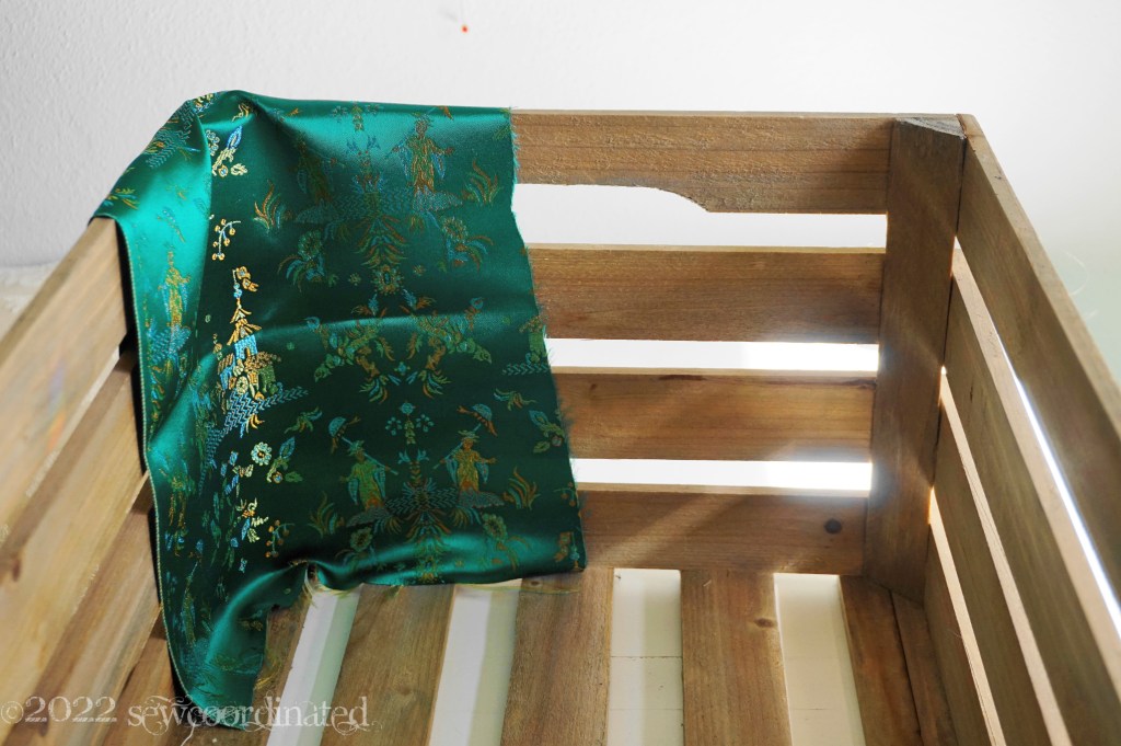 The crate is unusual in that it has wedges fastened into each of it’s 4 corners. This made me think that I should fashion the liner with 4 inserts to mimic the wedges. That’s where the satin remnant comes in. Using a contrast fabric for the wedges would add visual interest to the liner, as well as help use up more spare fabric that I have.