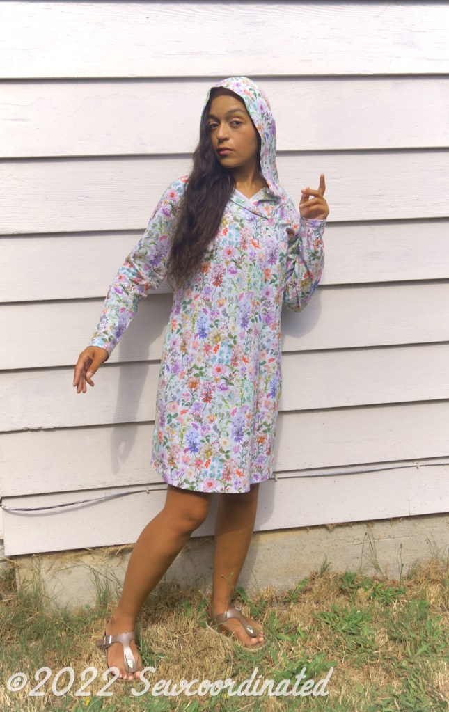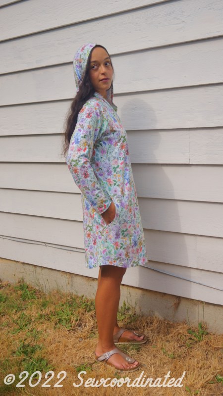 This pattern, published by Simplicity and designed by Sew House Seven, is a casual athleisure dress that caught my daughter’s eye. It has 2 different dress styles and 2 hoodie shirts, which are just shortened versions of the 2 dress views. We made the View C dress, a 1 piece dress with an attached hood and a large side seam pocket.