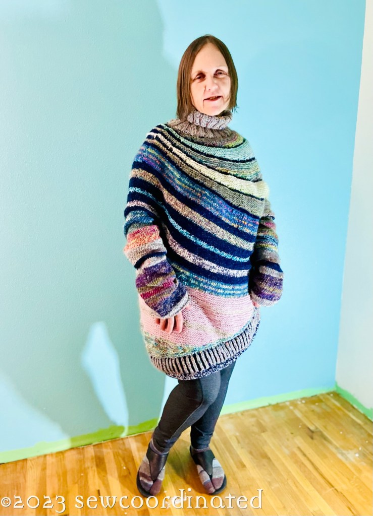 The pattern is a 1 size fits all asymmetric design by Stephen West of Westknits. It’s one of his earlier designs, and a very popular one, because of the unusual shape and infinite number of ways it can be made up. The sizing for any given person is based on the size of needle and the weight of the yarn used.