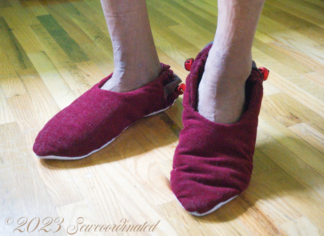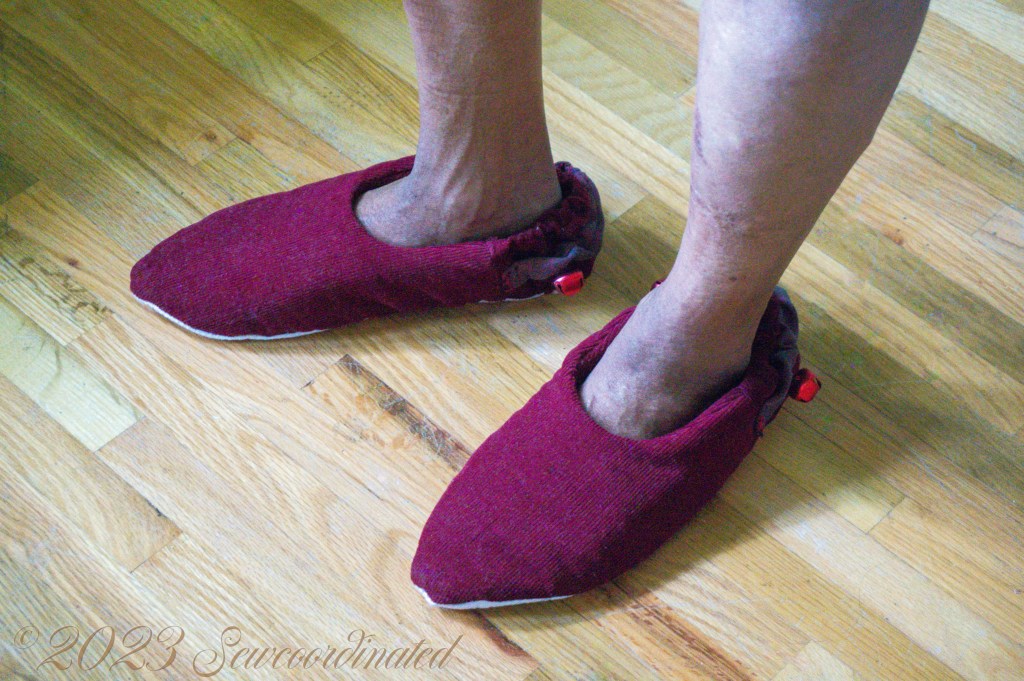 I made these for my husband and he liked the pointy toe style. I cut a men’s size small, which is men’s shoe size 8-9. They turned out to be a bit big, that is, a bit loose fitting, so I solved that problem by making a fabric casing to house a piece of elastic the same length as the piece used inside the heel. I placed this casing on the outside of the heel, where it performs the same function as the encased elastic. Basically double elastic, to help rein in the loose fit of the slipper. It worked, and the fit was improved. If I make another pair for him I’ll probably cut a smaller size and see how that fits.