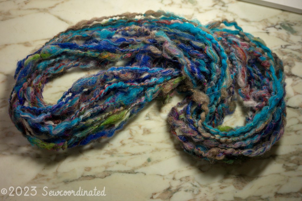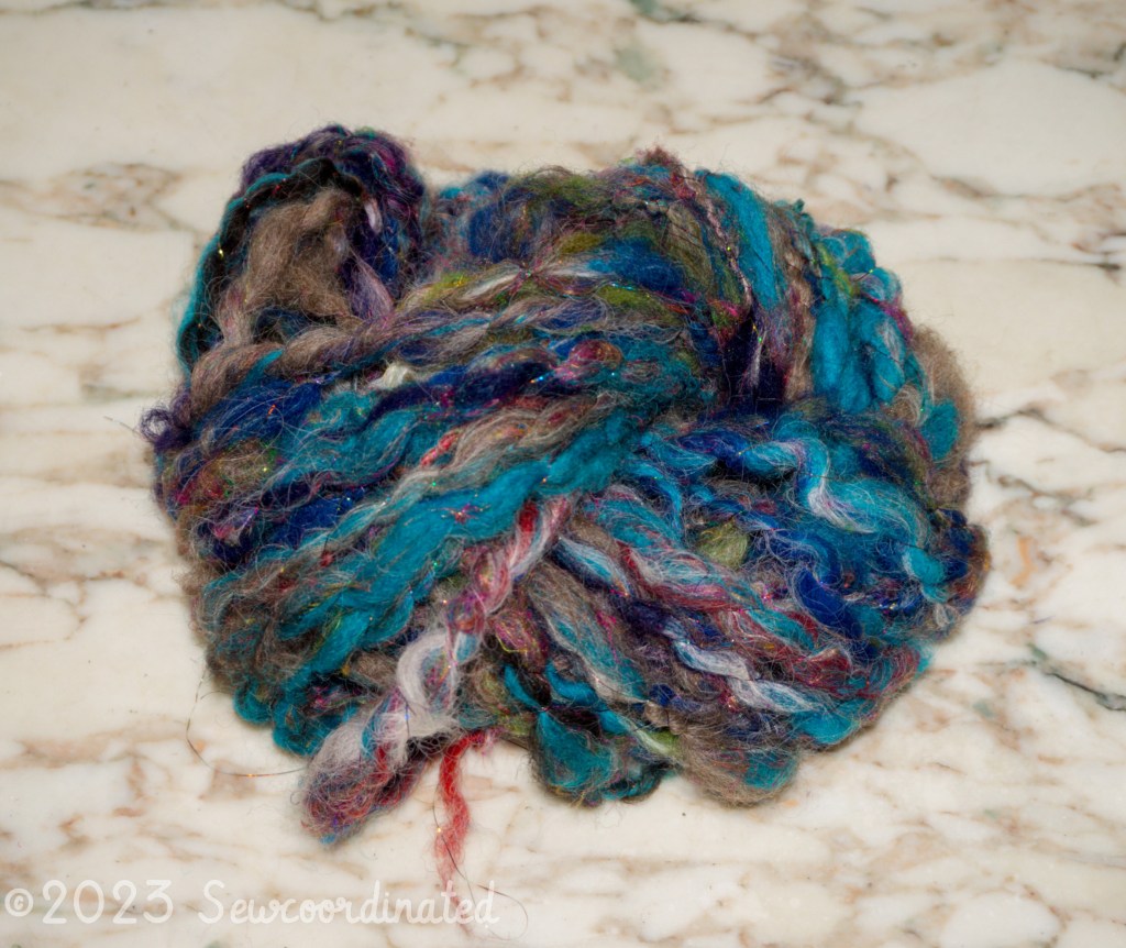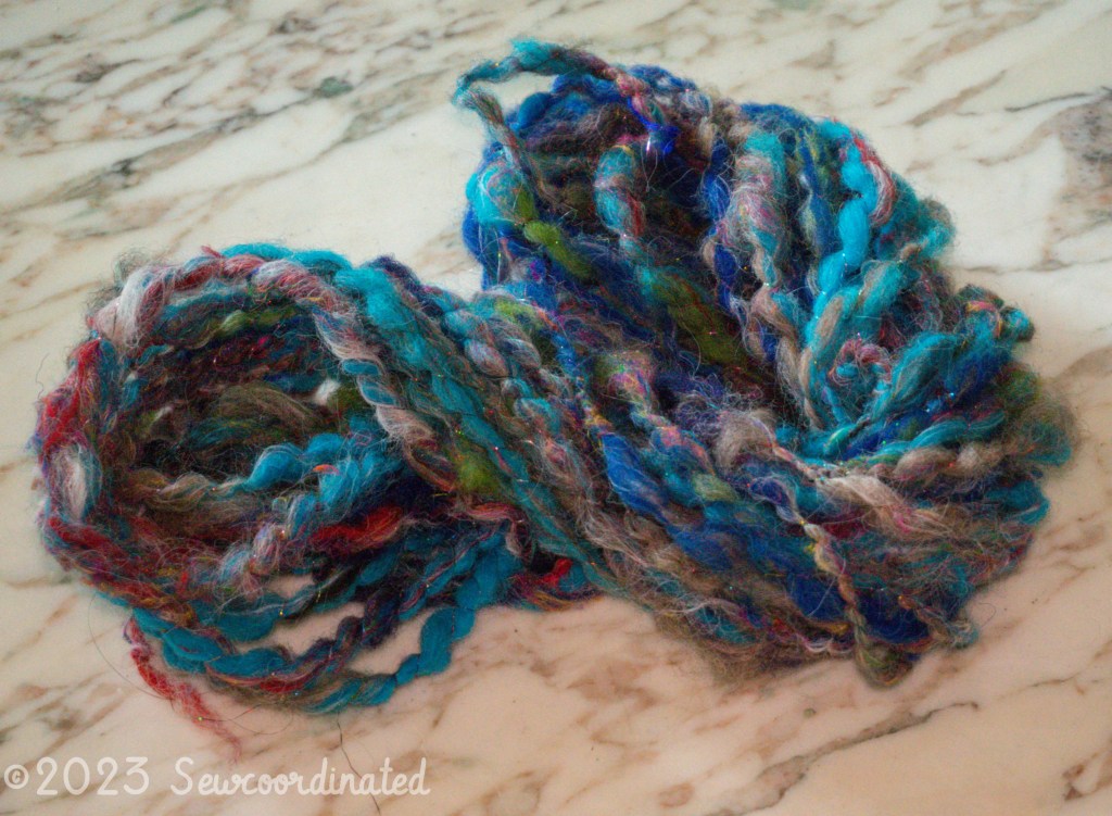 The second is an art yarn, spun thicker with airy bubbles, and wrapped in tinsel thread. Same colorway and materials, but it looks very different: