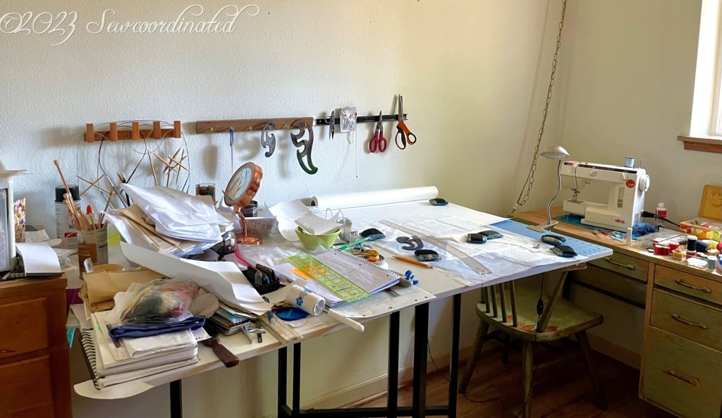 I’ve been busy lately working on publishing my first sewing pattern, a dream I’ve had for a long time. I also realized that I’ve never shared a pic of my workspace in the entire 10 years I’ve been blogging, probably because when I first started out I used the living room. I have an actual dedicated workroom now, something I only dreamed about 10 years ago. I’m a believer in the concept of creativity being messy, and my table is always full of projects, tools and everyday items.