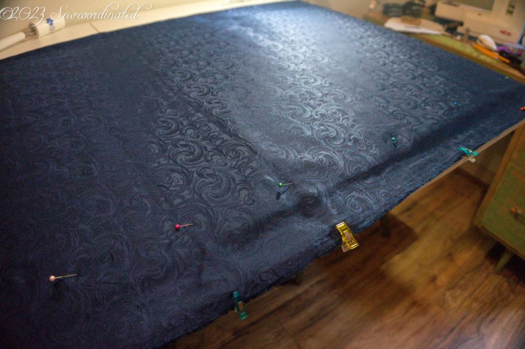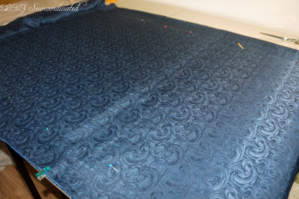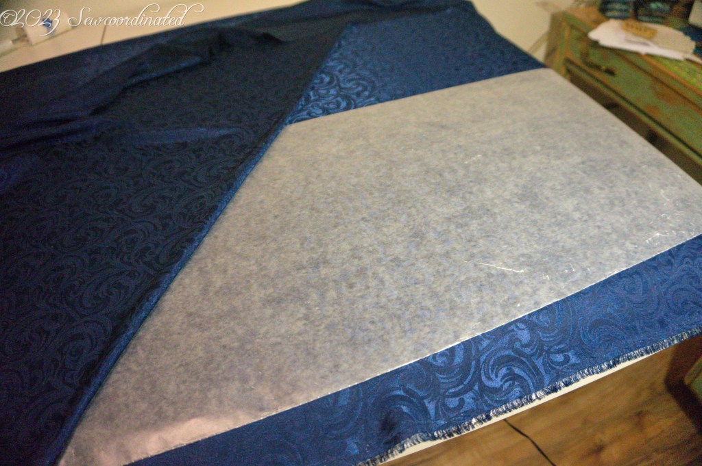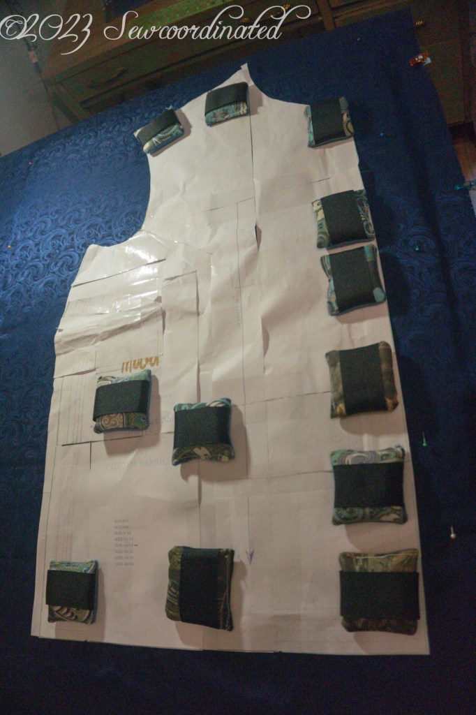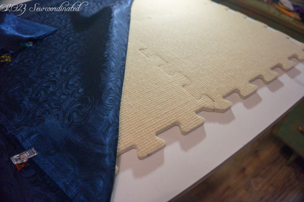 This fabric is crazy slippery and very hard to cut. In fact, I messed up one of the sleeves and had to recut it. The project would’ve been sunk at that point if I didn’t have enough yardage to cut another. I had to take some extra care in securing/stabilizing it so that it wouldn’t move while cutting. To do this I took out my knitter’s blocking mats and pinned the fabric to those. I also placed a sheet of waxed paper between the 2 layers of fabric and pinned some more, while also using my homemade pattern weights.
