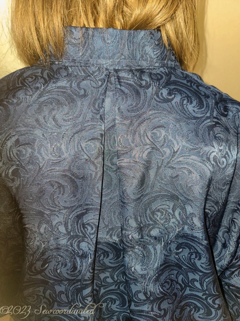 Another major problem with this pattern was the box pleat on the shirt back. The pattern had no mark of it, meaning no printed fold lines. The only way I knew there was a box pleat at all was from reading through the online construction tutorial. It’s quickly mentioned that one is made, no exact length is told, and no picture is shown. That’s right, no pic of the pleat in both the construction tutorial or the finished shirt. It’s up to the maker to trial and error it out until the right size pleat is found. I discovered that my first guess wasn’t right when the shirt fronts stuck out beyond the collar. I had to remove the collar and make a larger pleat. Yeah, this was annoying to discover that something so simple yet necessary to the fit of the collar to the shirt was missing from the flat pattern markings. Removing a collar takes time, as does working with slippery fabric that requires a low iron setting so that it doesn’t burn when re-forming a new pleat. This is why the pattern is free.