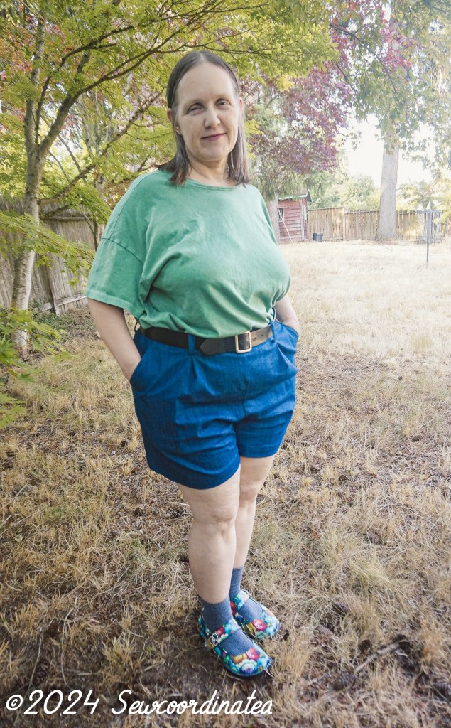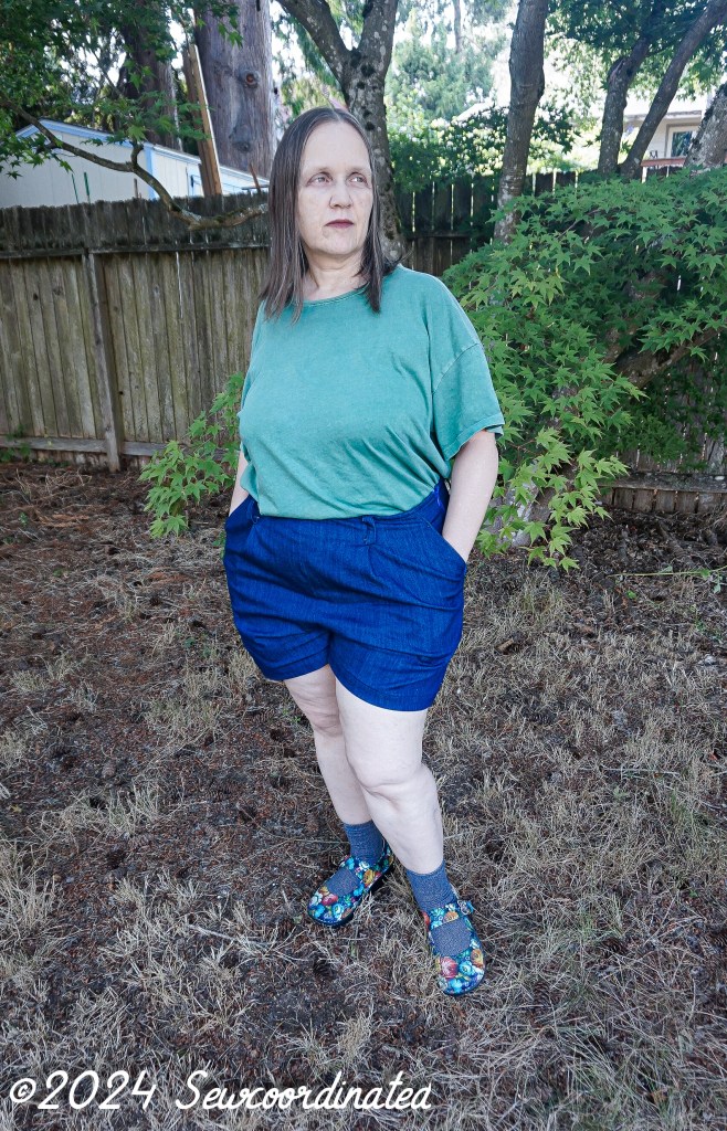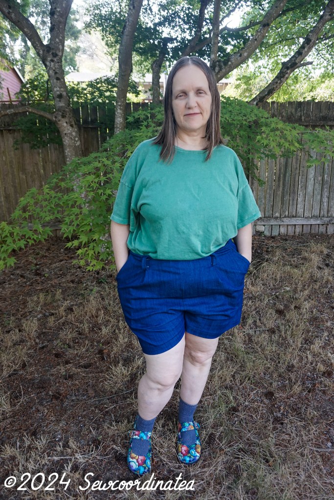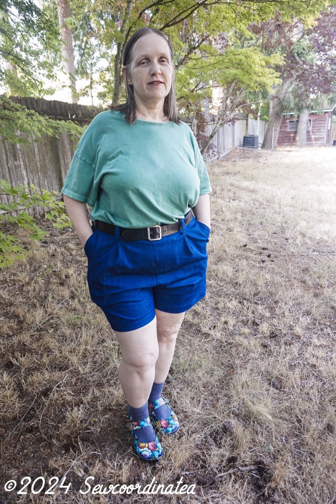 I went with the envelope measurements to determine my size. Sensible right? Well, it didn’t work out well for me, and I realized that it’s probably because I did my usual full seat alteration. That made the shorts too big, and made them saggy and floppy in the back., with the waistline sitting at my high hip. No good, the waistline for this design should hit at the waist. I then sized down 1 full size in both the waist and hips (20/22). I’m a pear shape so I’m always at least 1 size smaller in the waist. My first try was a 22 graded to 24, altered as mentioned above, which was way too big. After unpicking the shorts completely (yes, I had to), I cut them down to the lower size range and re-assembled them. I did alter the back piece of this block too. They fit now, but they’re still a bit big in the waist and hips, especially the waist. They fit better than they did on the first go round though for sure. I now know that I could’ve gone for 1 more full size downsize (18/20) with the back alteration and that would probably have been perfect.