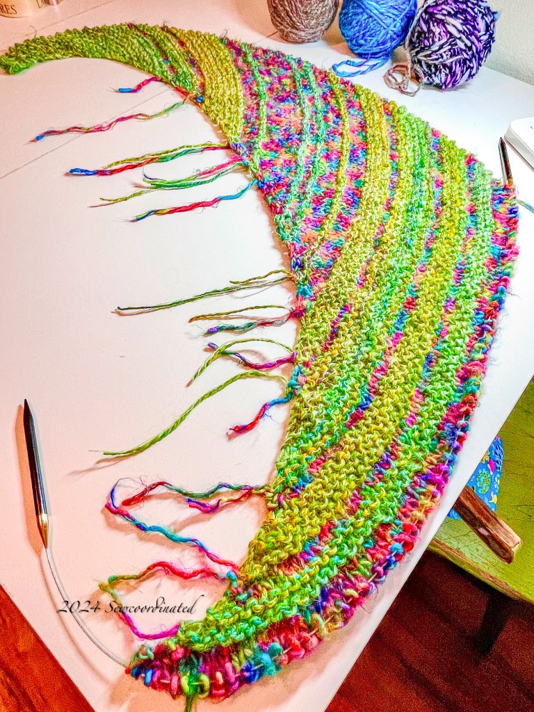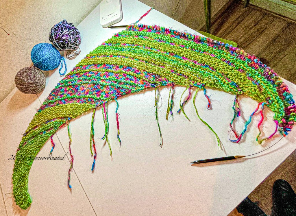 I started off thinking that I would do another motley scarf, because of the variety of yarns I had ready, but I ended up using just 3: my handspun, held together with Mary Maxim mohair for the main color. The MM mohair was a gift from daughter. It was a yarn from her stash, and she’d given it to me for my Enchanted Mesa sweater. It had been a huge skein that went really far. I just asked her about it and she said she bought it from All Points Yarn, a local yarn store. The contrast color I used was leftovers of Joann Sensations Angel Hair yarn. It’s a discontinued yarn that’s bulky weight and super soft for an acrylic yarn. I’d knitted a sweater with it that I never blogged about. Someday I hope to, but for now I had extra yarn from that project and it worked really well as the contrast color for this shawl.