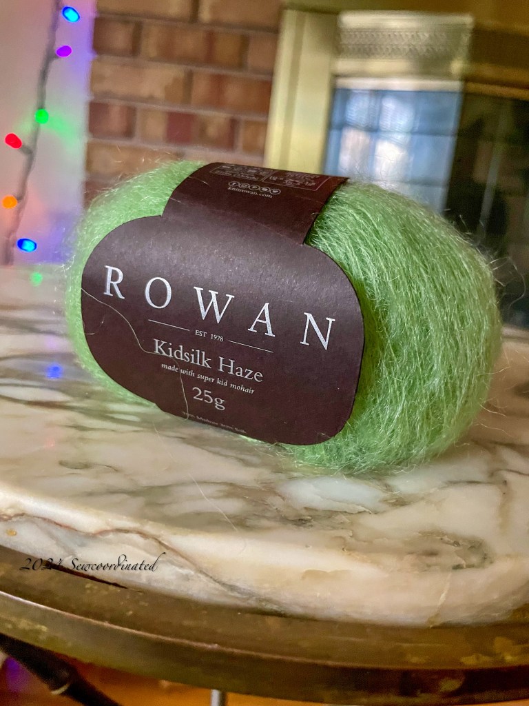 All was going well with it until I began to run out of the MM mohair. I was about 2/3 through when this happened. I couldn’t knit on without it because it already had the mohair flow. Mary Maxim mohair was discontinued at some point, so I had to source another kind. Luckily there are lots of laceweight mohair yarns available. I went with Rowan Kidsilk Haze, which was a treat to myself. It’s the most expensive, but also has the biggest color range. I went with the Apple color, #720, seen below:
