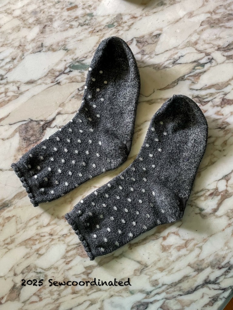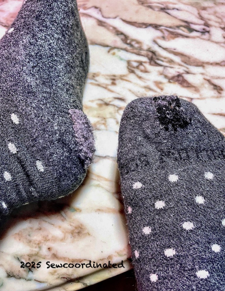 You could say I’m smitten by this pair of socks that I mended today. I wore them a lot until a hold broke out in the toe and the heels got worn to the netting. They were one of my favorite pairs for a few reasons: soft feel, neutral color, warm and comfy… and they have a nice picot edge on the cuff. They’ve sat around until this mending event, unwearable and out of use.