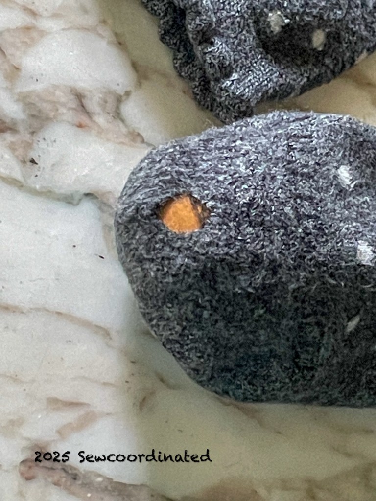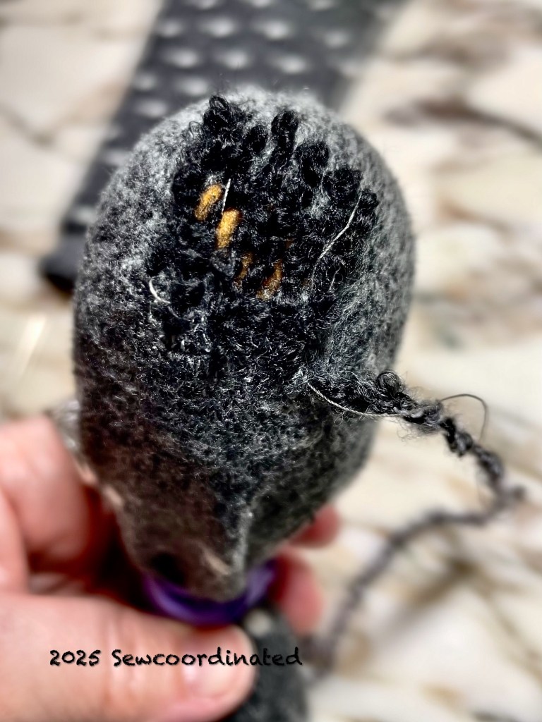 For today’s mend I used a darning egg. I like to fasten the sock onto the egg tightly so that it doesn’t slide around while mending. I used a heavy rubber band for that. For the mend itself I chose a double thread approach. I used a single strand of regular sewing thread and a strand of boucle yarn from my stash. It’s Sensations Rainbow Boucle from Joann’s, now discontinued and rarer every day because Joann’s is soon closing it’s doors forever. It’s a tonal colorway of soft white, soft pink, gray and black. I felt that it would be perfect for this mend because of it’s colors and texture. It’ll help restore the pillow feel of the socks.