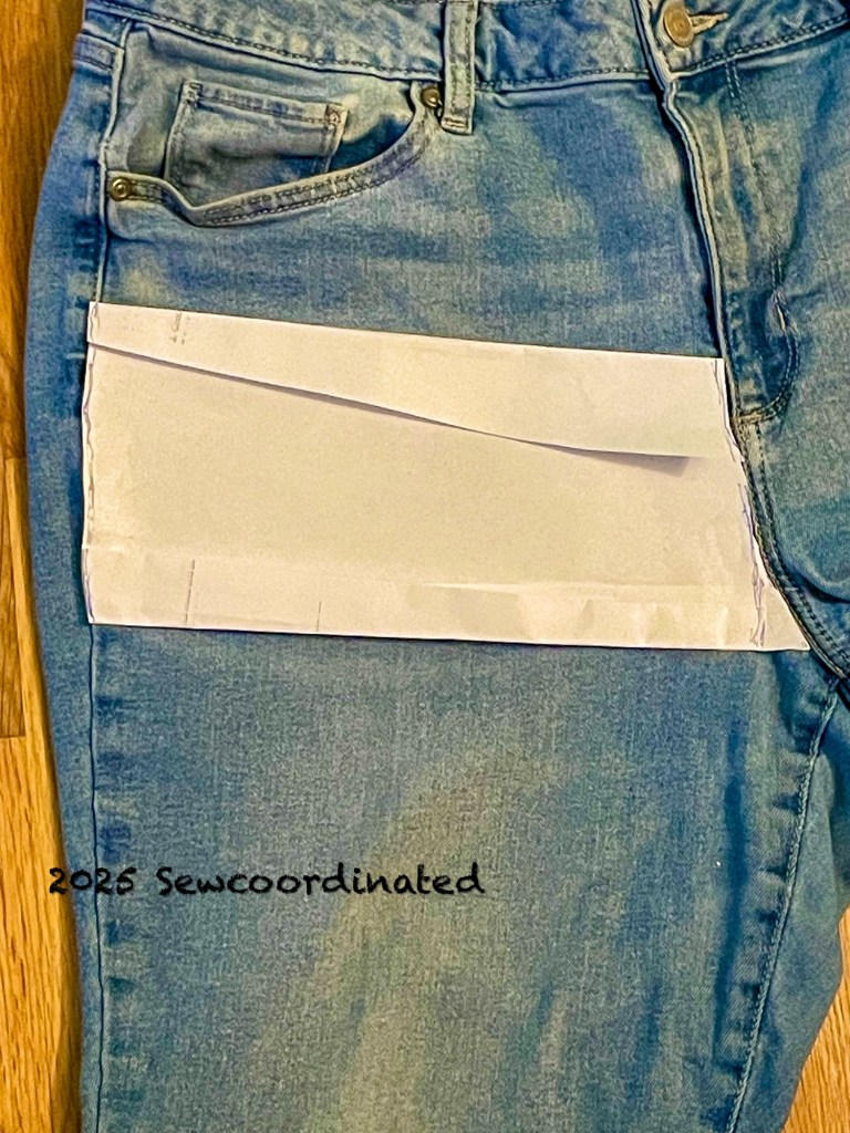 The fabric scrap I’m using is also stretch denim. I couldn’t imagine doing this any other way. The 2 fabrics should match. Non-stretch woven denim won’t work here because it doesn’t have the same amount of give.