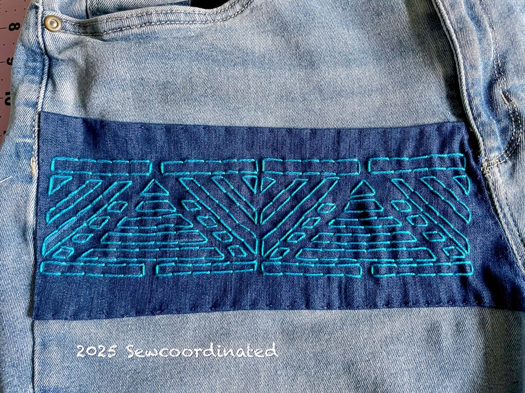 Continuing on this project that I began during last month’s Mend March, I’ve now completed the embroidery outline. I patched over the worn out stretch denim with some new denim. Then I finally decided to use the large stencil shown in the video in the linked post above. I had thought it was too large for the area I was covering, but it turns out that it was just the right size:
